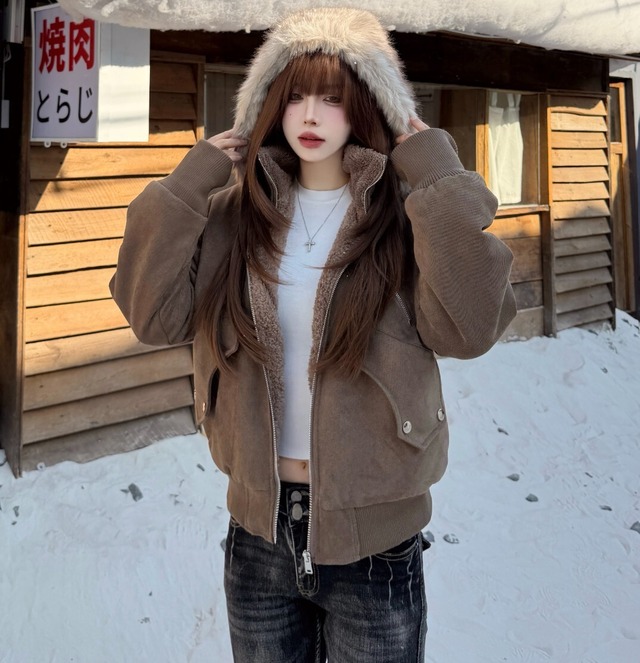 ファーフード付き起毛スエード調ジップボンバージャケット/レディース 韓国ファッション モード系|NEIRA