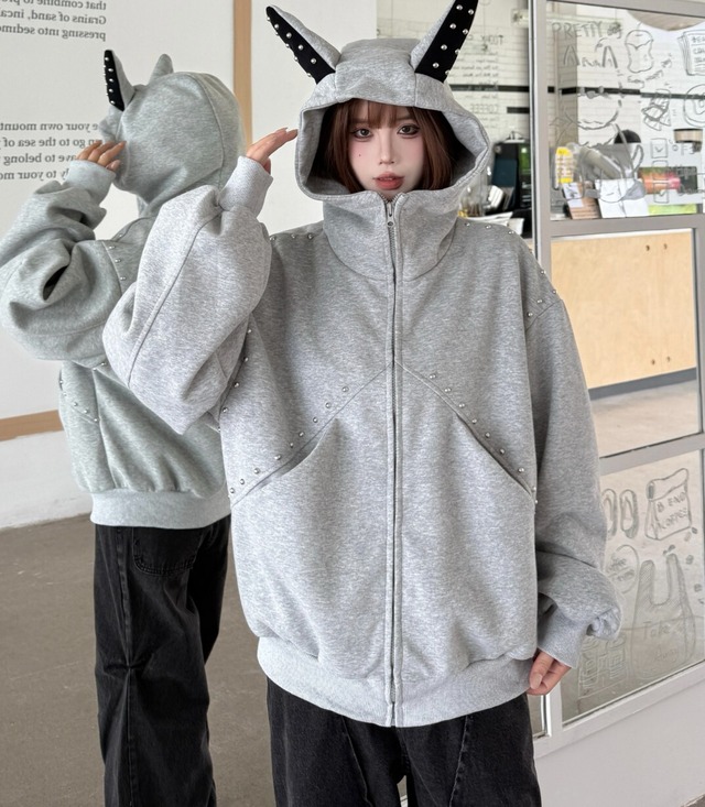 スタッズライン 角付きフードビッグシルエットジップアップパーカー/レディース 韓国ファッション モード系|NEIRA