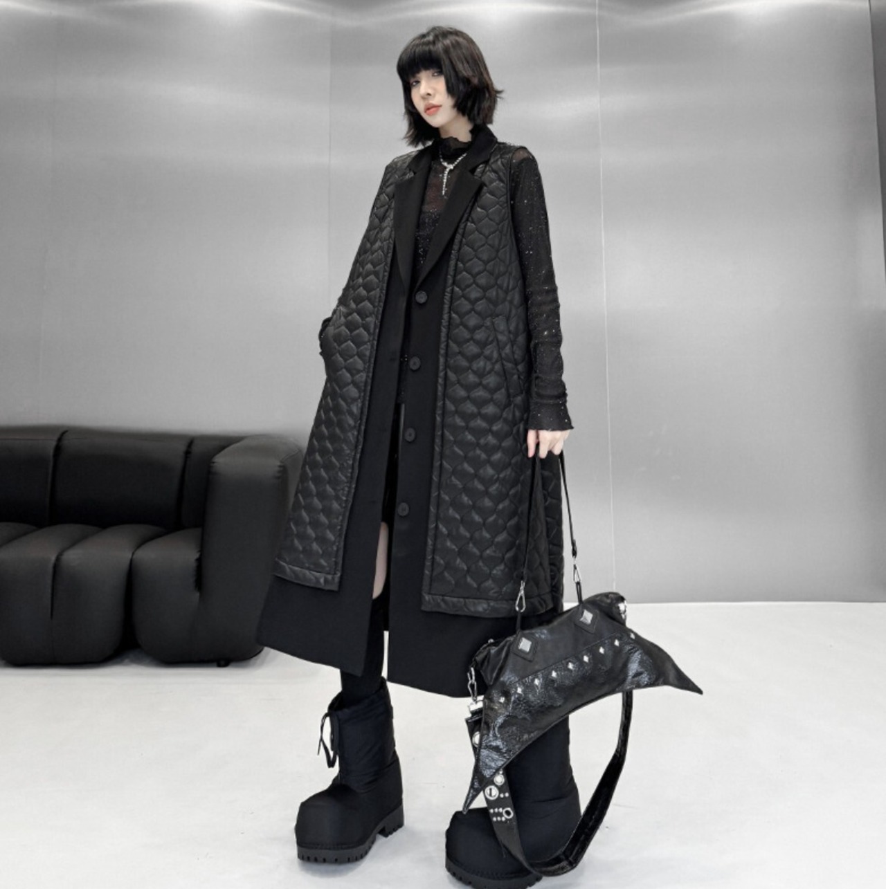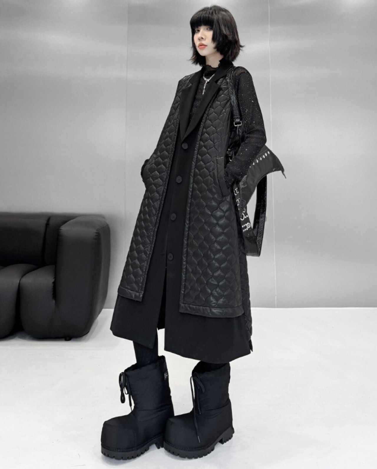 #NEIRA #ロングジレ #ロングベスト #キルティング #ダイヤキルト #中綿 #ソフトPU #合成皮革 #ブラック #モード系 #韓国系ファッション #テーラード #Aライン #Iライン #体型カバー #レイヤード #ポケット付き #秋冬アウター #ノースリーブアウター