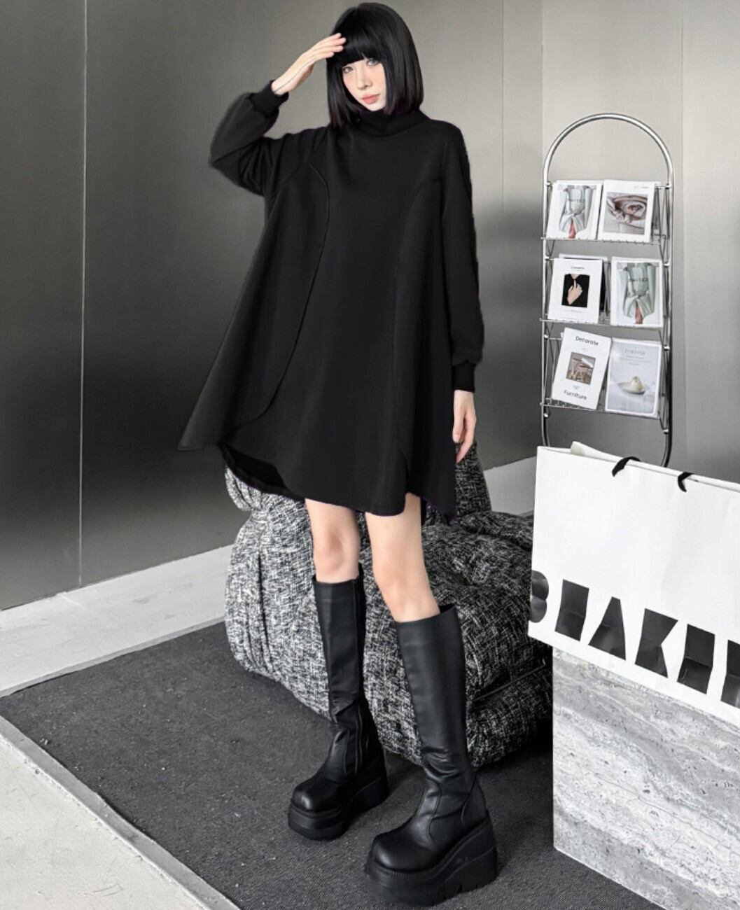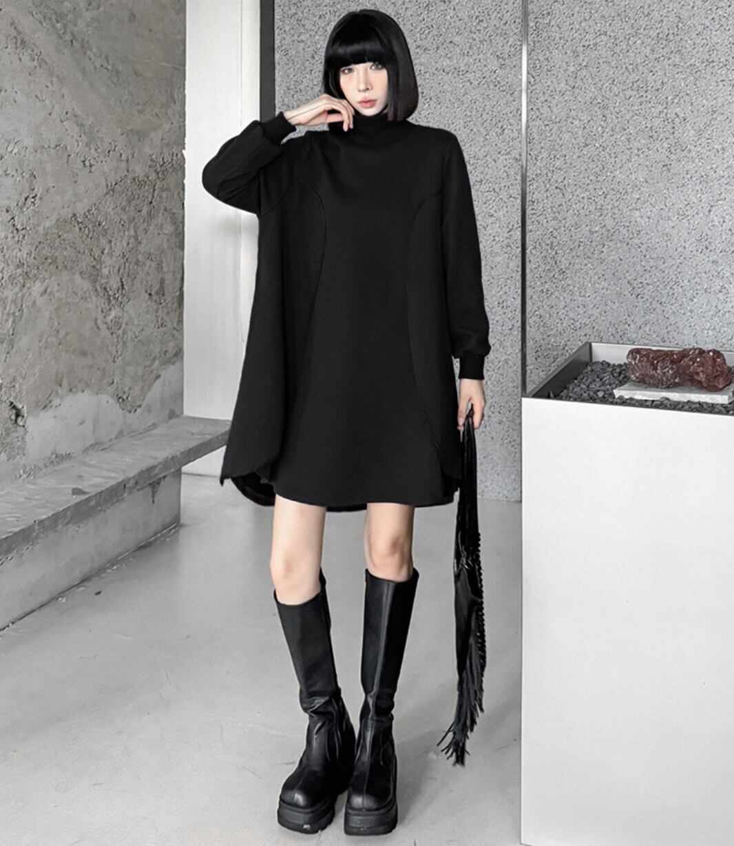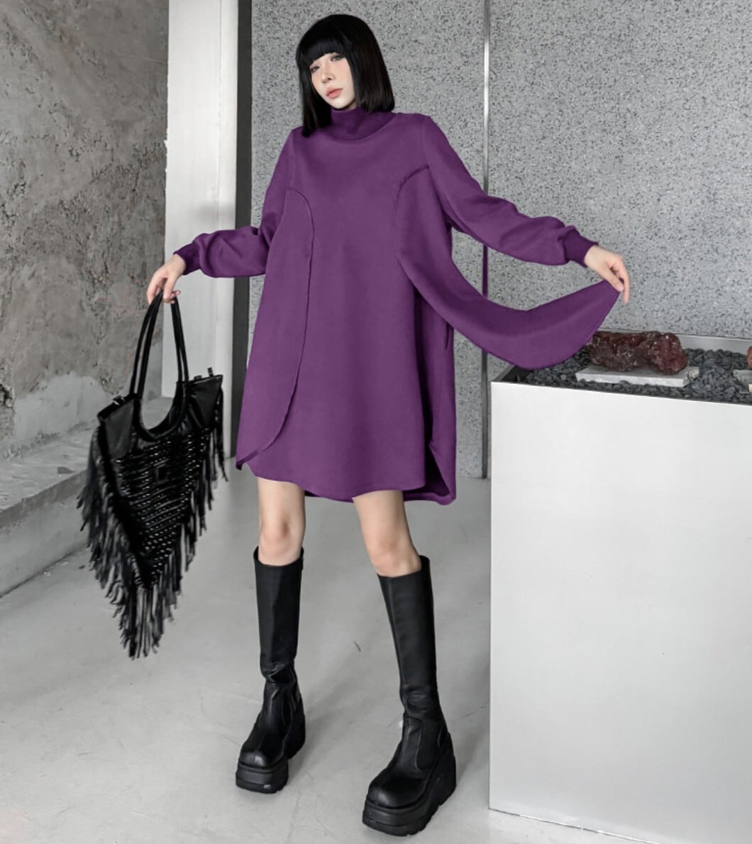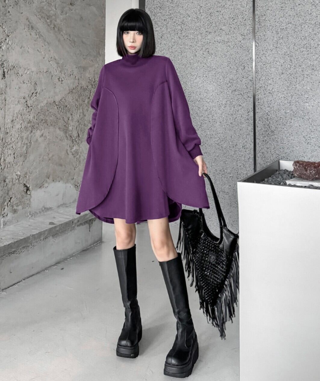 #ワンピース #スウェットワンピ #ハイネック #Aライン #オーバーサイズ #サイドスリット #ペタル切替 #ミニ丈 #秋冬コーデ #韓国ファッション #モード系 #ダークファッション #ブラック #パープル #重ね着 #ロングブーツ #体型カバー #個性的デザイン #ストリートMIX