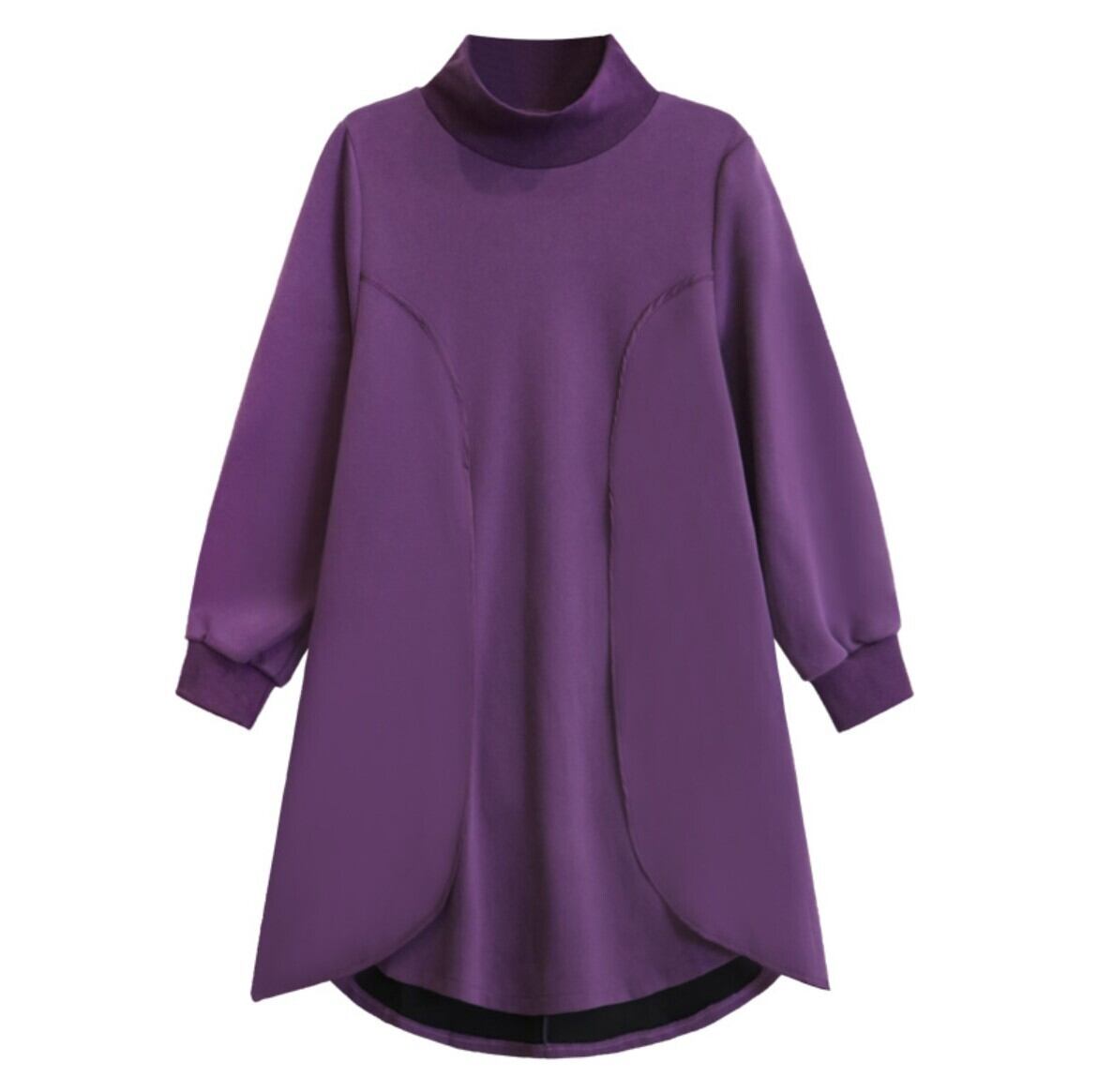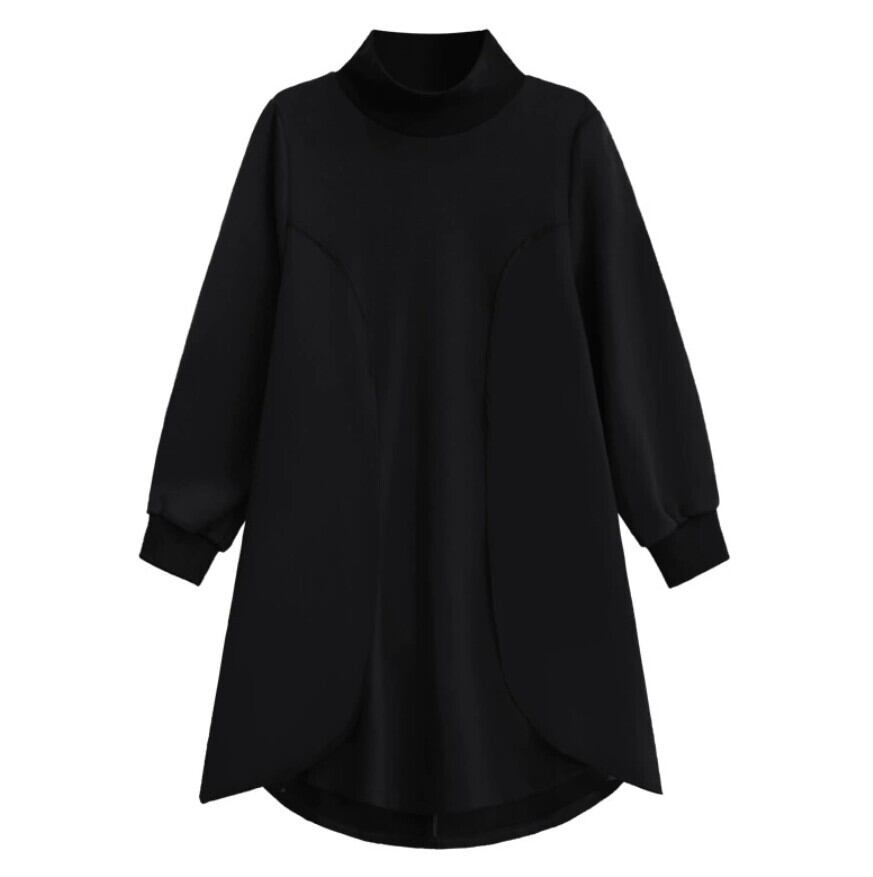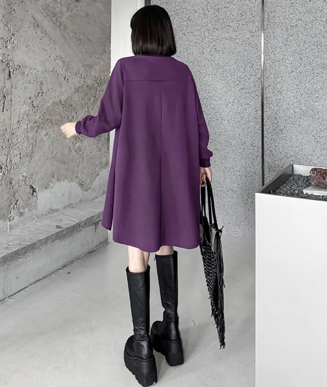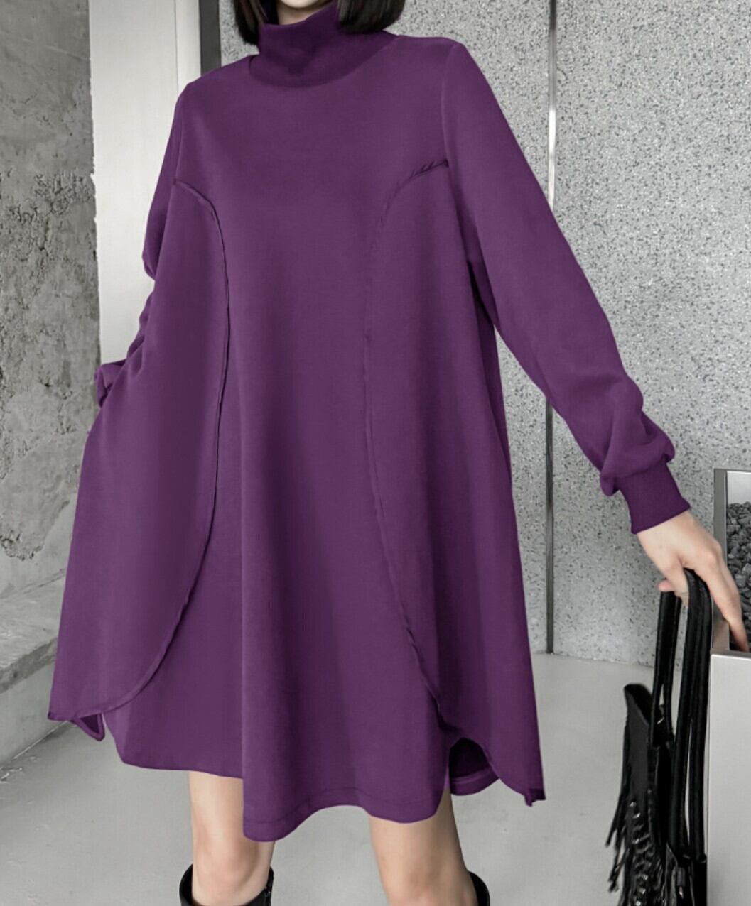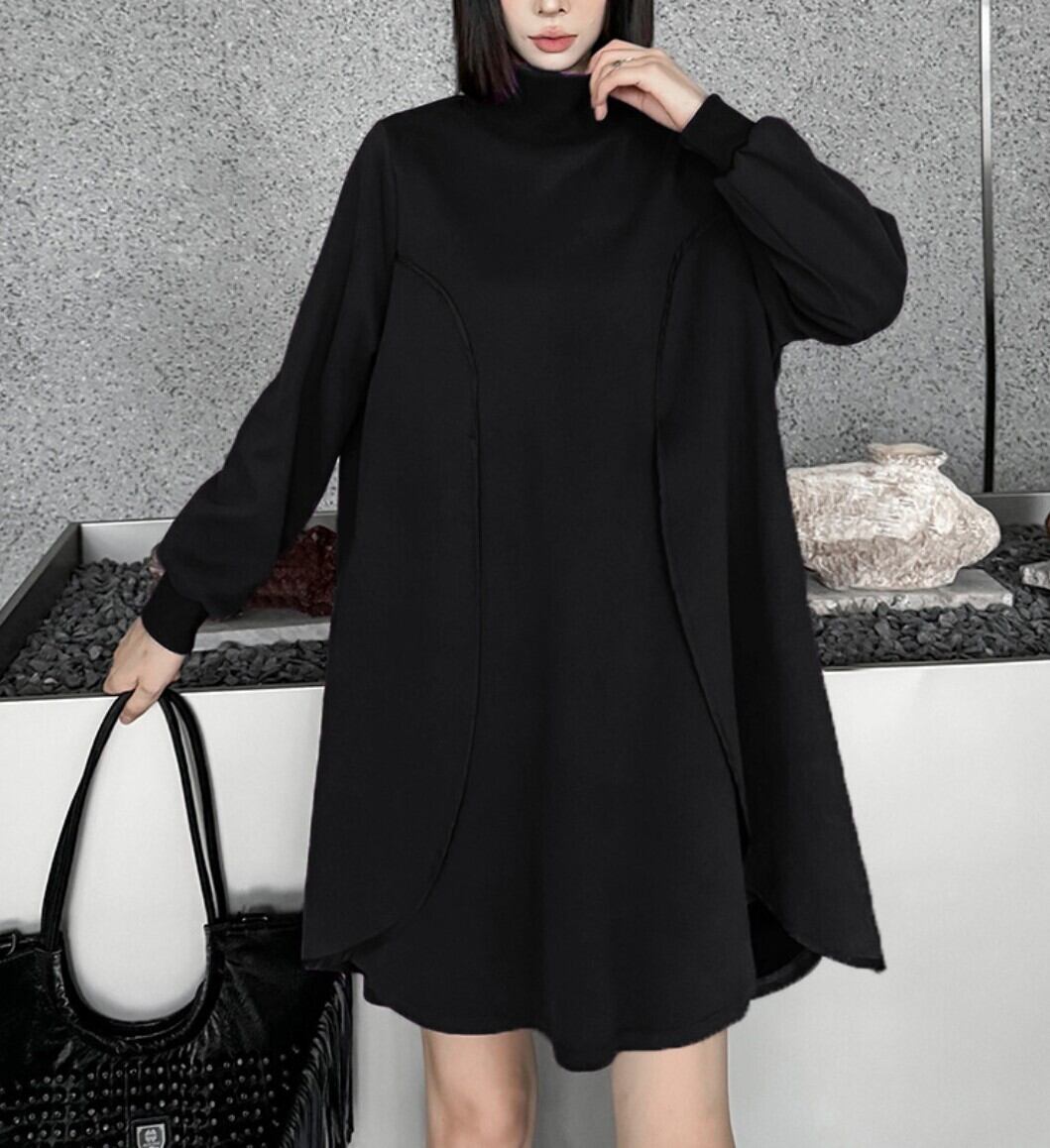 #ワンピース #スウェットワンピ #ハイネック #Aライン #オーバーサイズ #サイドスリット #ペタル切替 #ミニ丈 #秋冬コーデ #韓国ファッション #モード系 #ダークファッション #ブラック #パープル #重ね着 #ロングブーツ #体型カバー #個性的デザイン #ストリートMIX