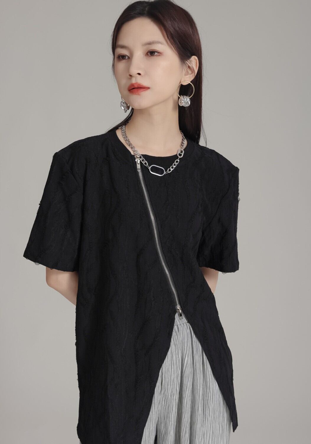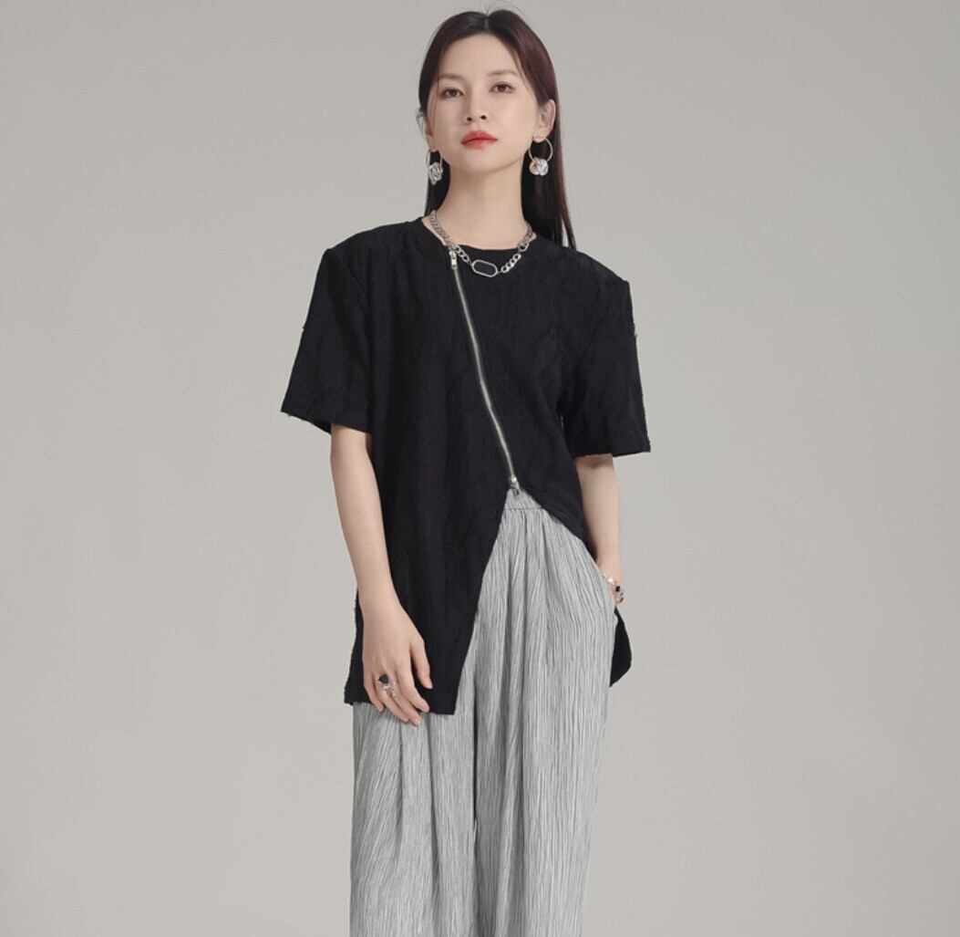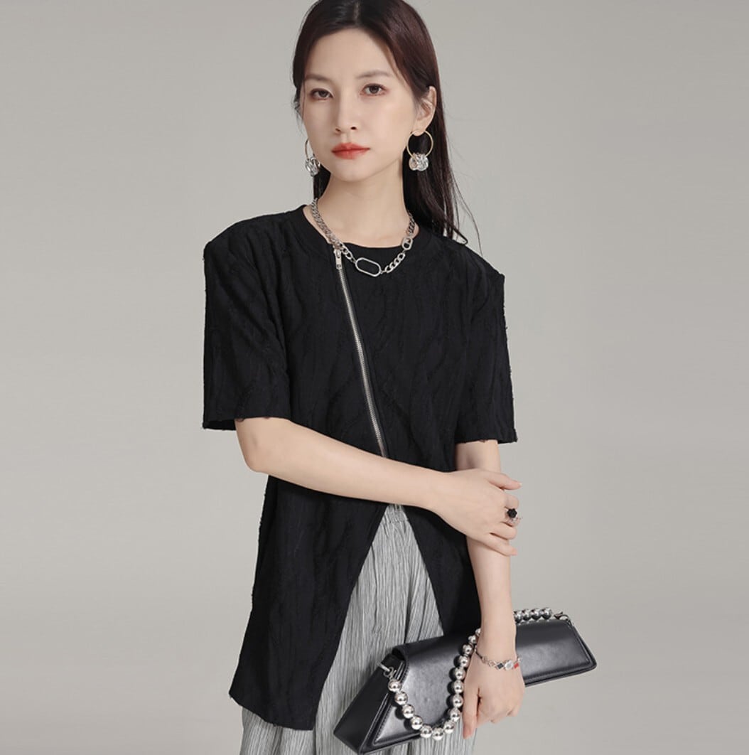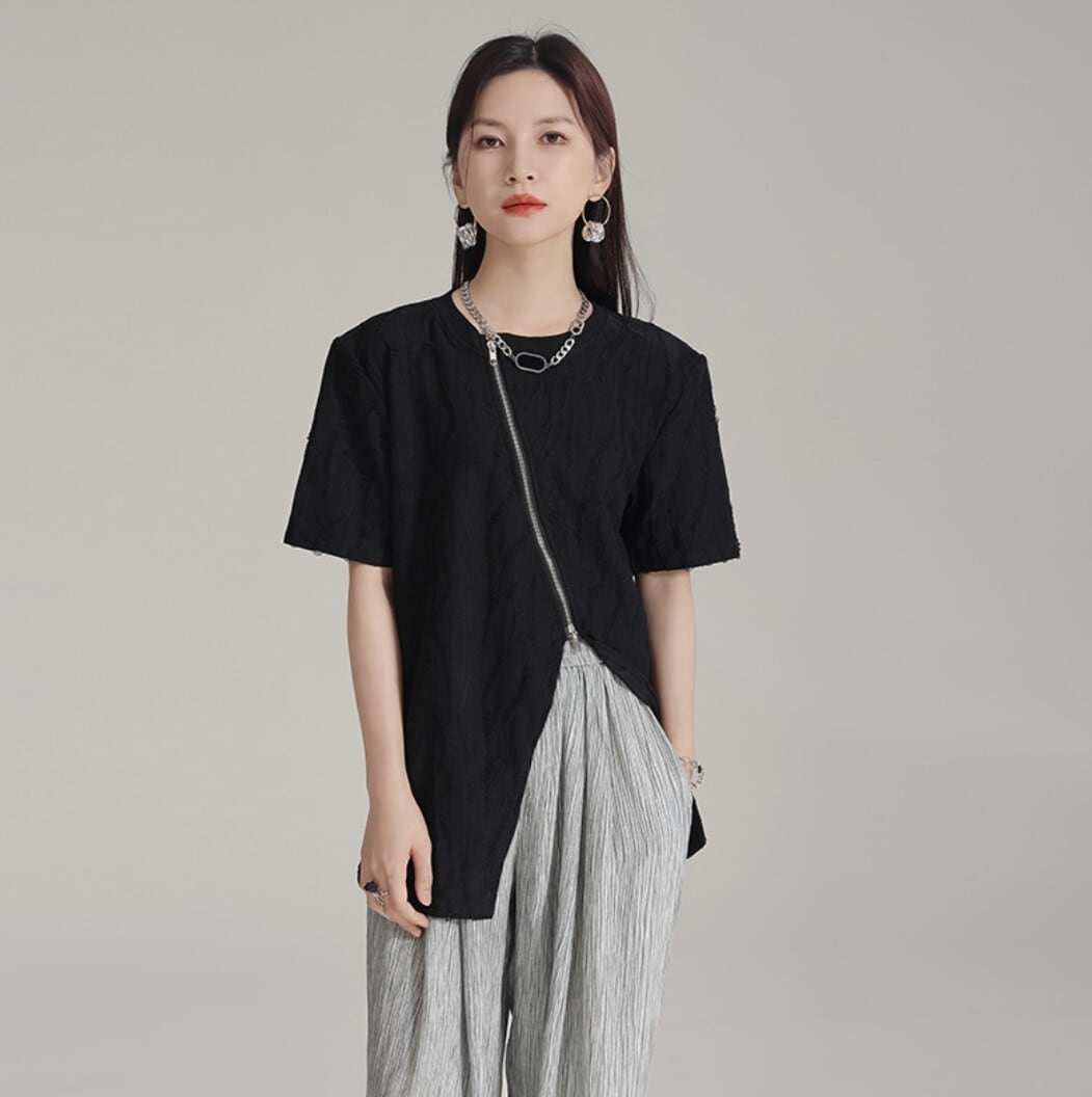 #NEIRA #トップス #Tシャツ #半袖 #アシメジップ #スリットデザイン #テクスチャー生地 #韓国ファッション #モード系 #ダークファッション #個性派ファッション