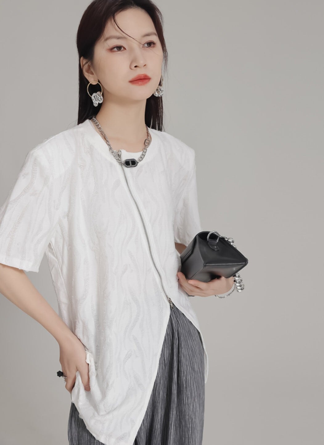 斜めに走るジップを効かせたアシンメトリーTシャツ。