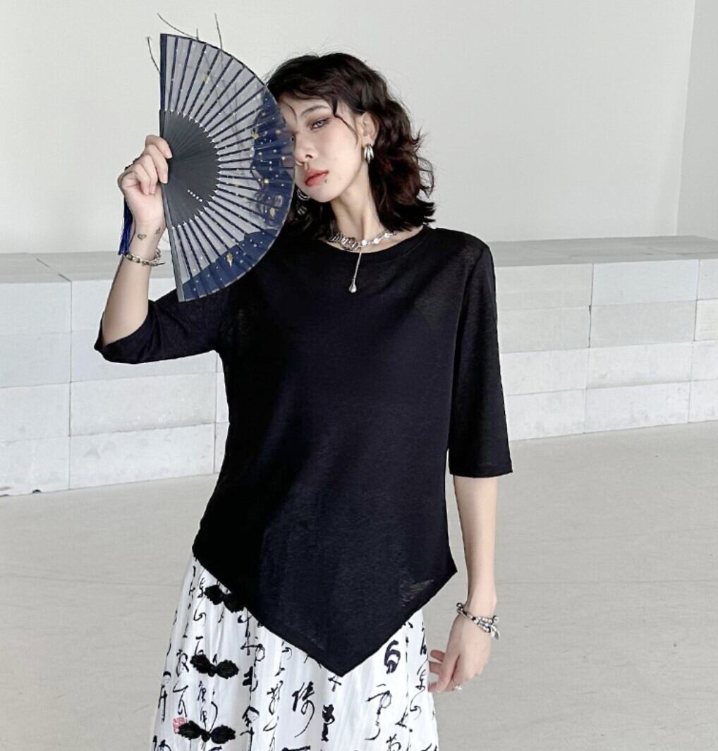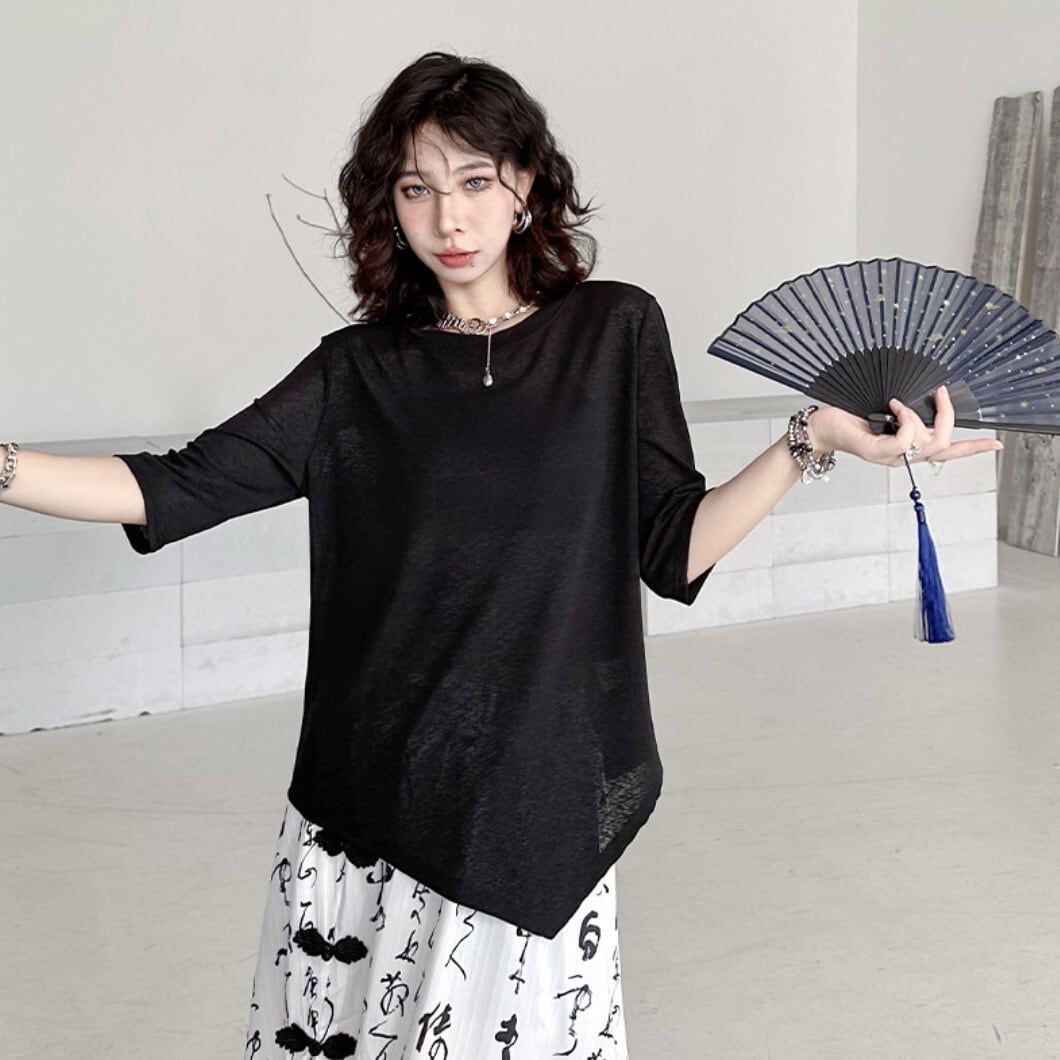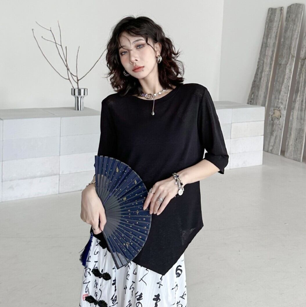 #Tシャツ #5分袖トップス #アシンメトリー #モード系 #韓国ファッション #ゆったりシルエット #ブラックコーデ #ホワイトコーデ #夏コーデ #カジュアルコーデ
