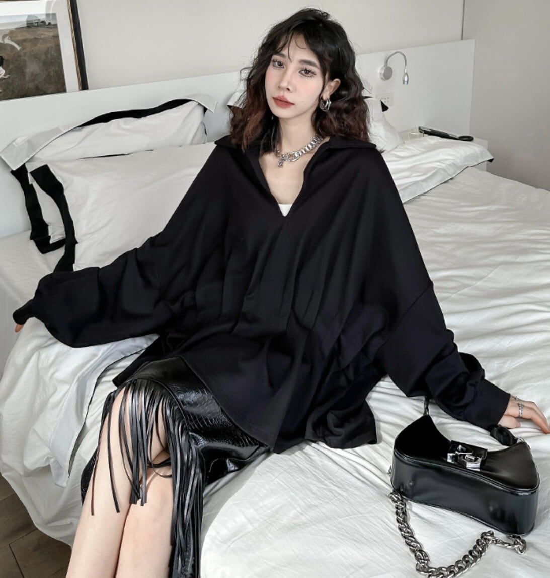 #トップス #ブラウス #シャツ #プルオーバー #オーバーサイズ #ビッグシルエット #ドルマンスリーブ #タックデザイン #Vネック #ブラック #黒トップス #モード系 #韓国ファッション #きれいめカジュアル #NEIRA