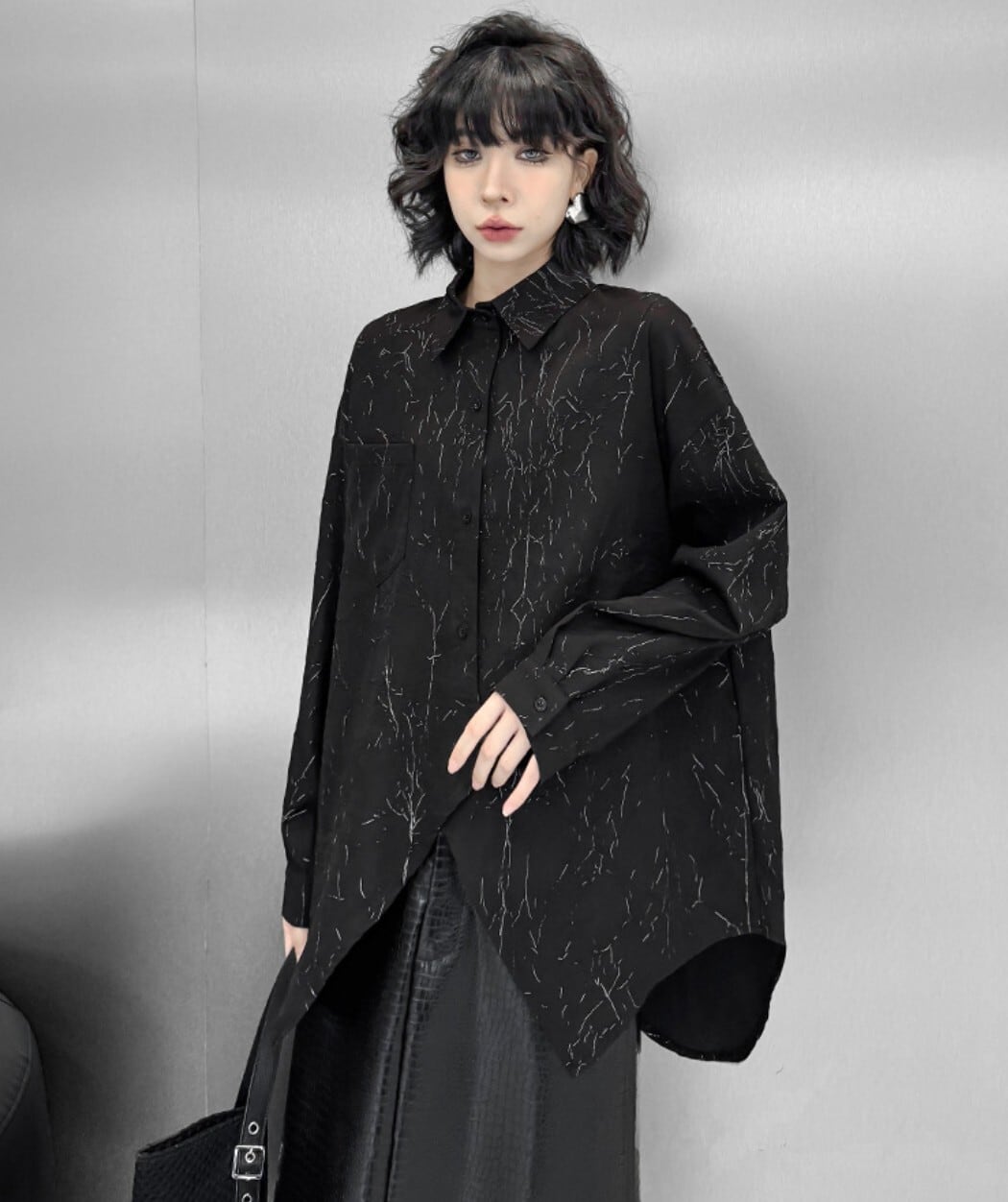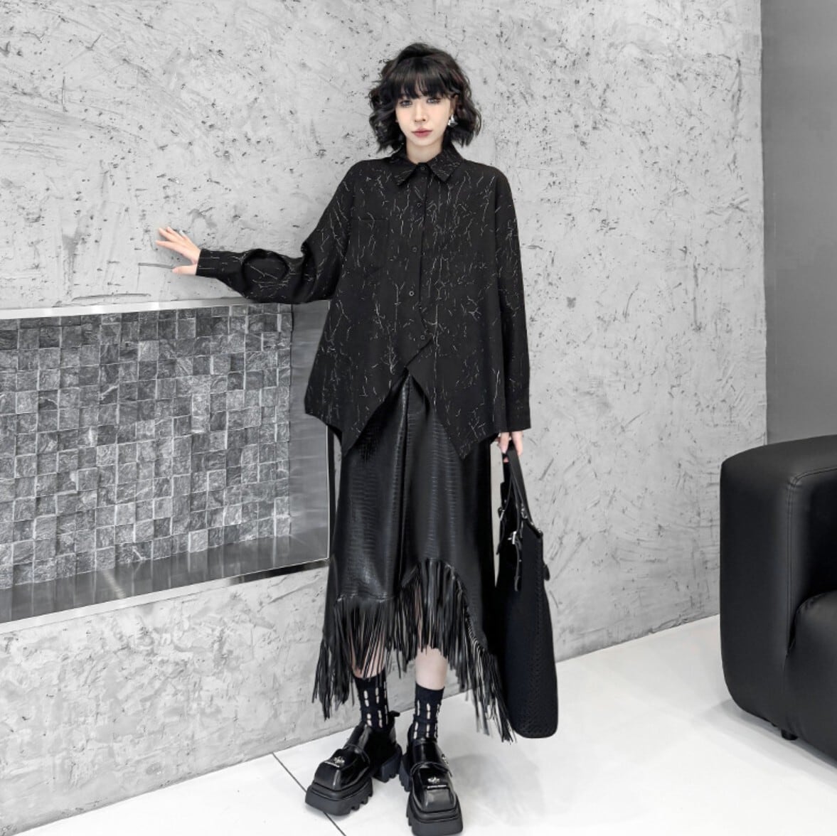 #トップス #シャツ #長袖シャツ #オーバーサイズ #ビッグシルエット #アシンメトリー #変形ヘム #シルバープリント #ブラック #黒トップス #モード系 #韓国ファッション #香港風 #ストリート #ユニセックス #NEIRA