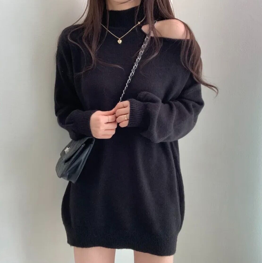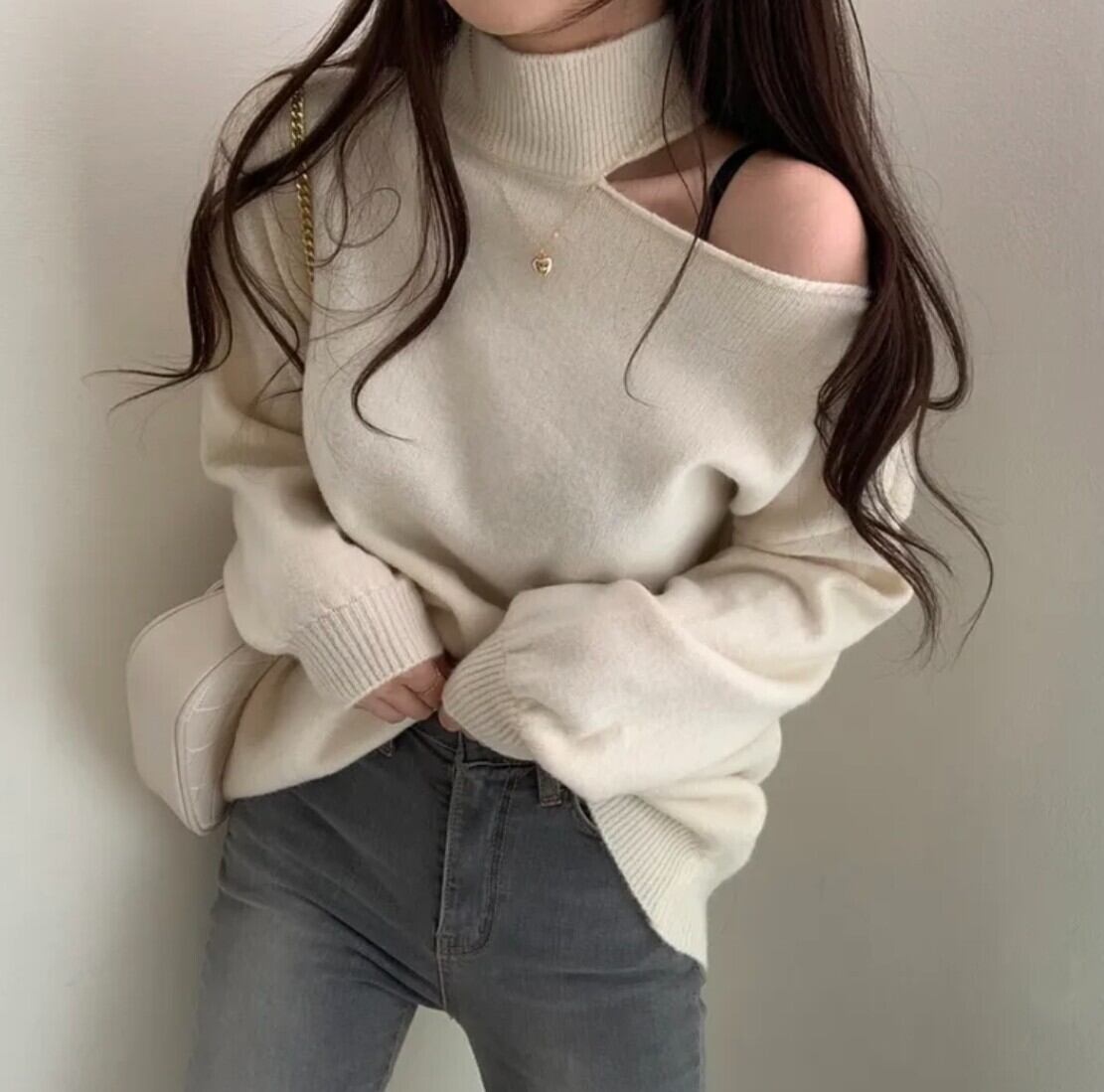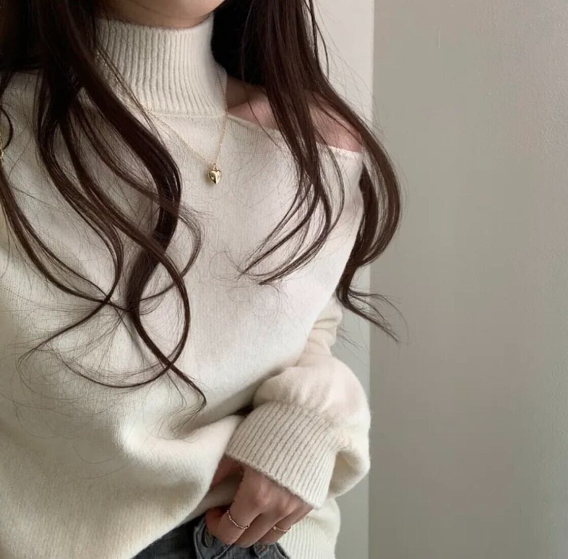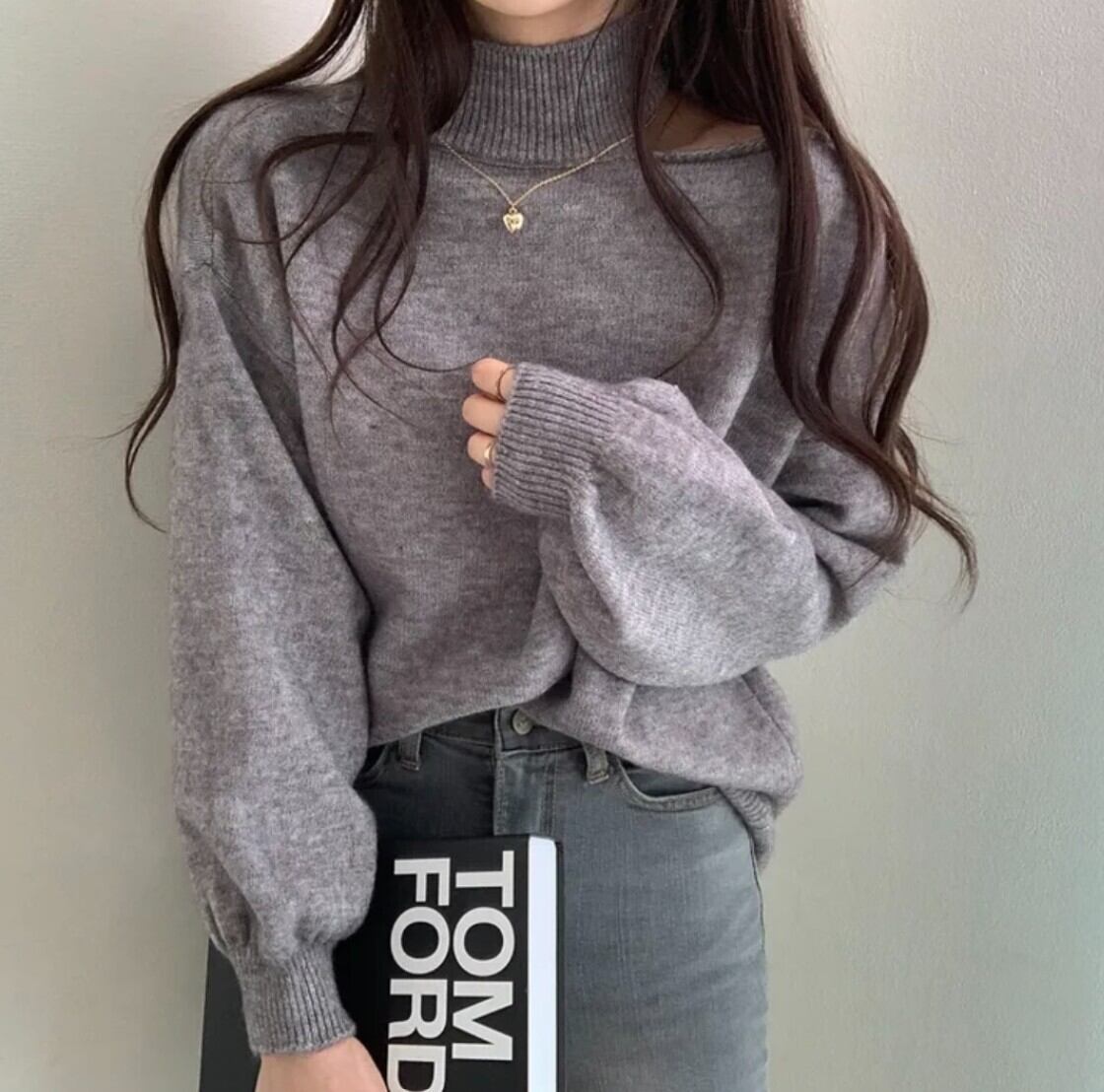 #ニット #セーター #ハイネック #オフショル #ワンショル #カットアウト #肩出し #ボリュームスリーブ #体型カバー #華奢見え #きれいめ #カジュアル #韓国ファッション #デートコーデ #秋冬トップス #着回し #モードフェミニン #kfashion