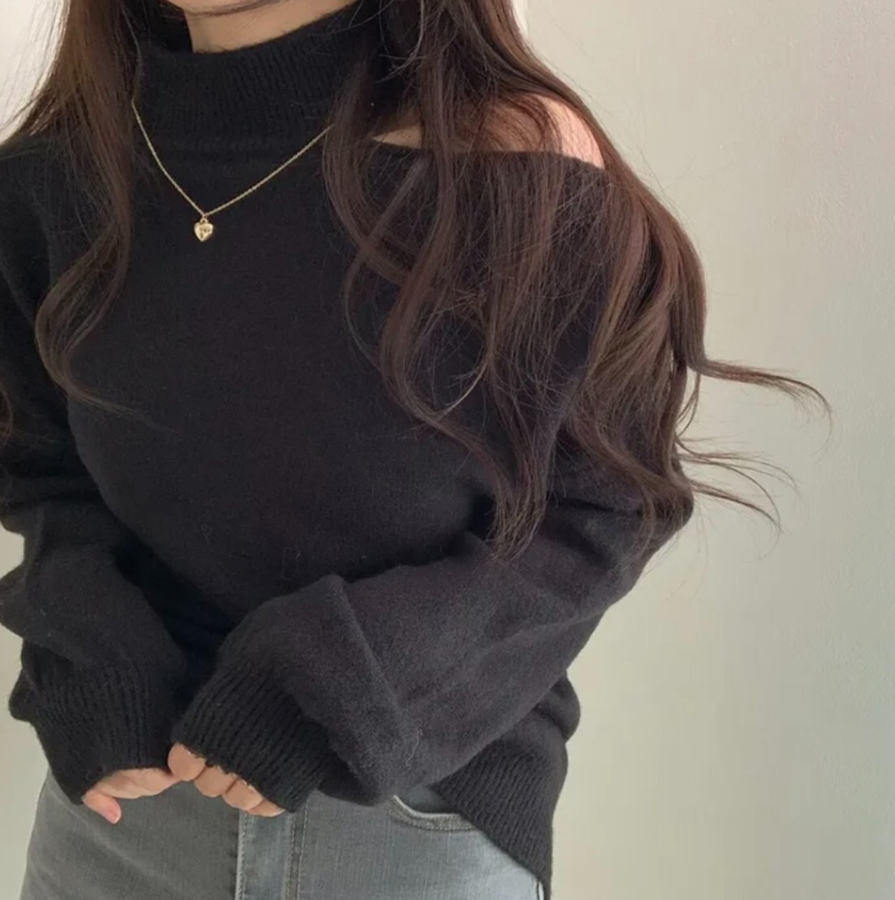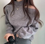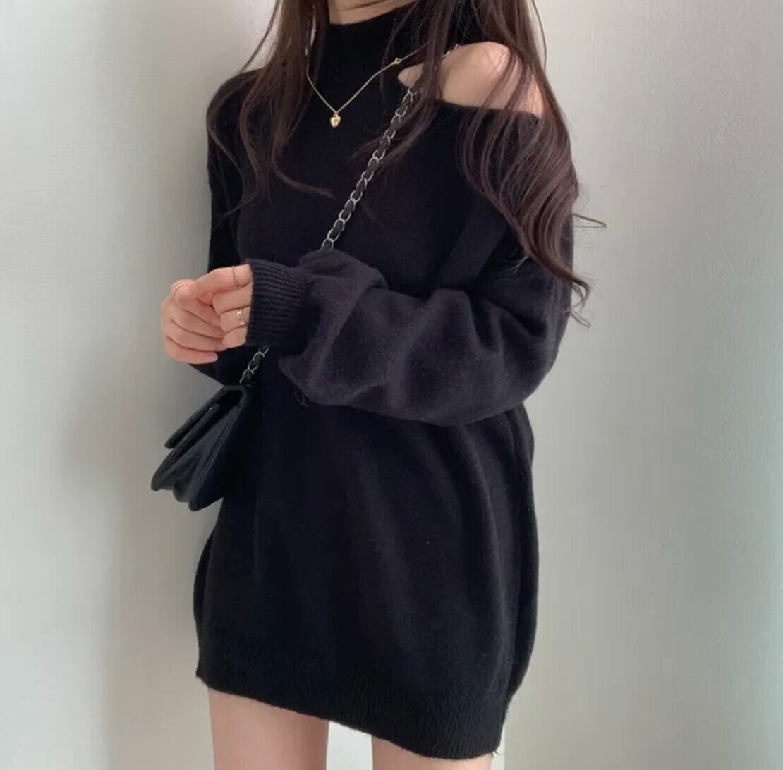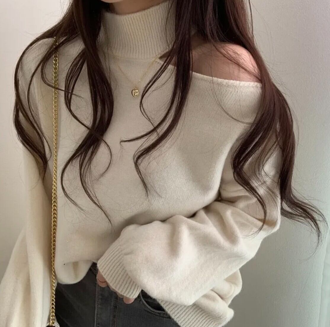 #ニット #セーター #ハイネック #オフショル #ワンショル #カットアウト #肩出し #ボリュームスリーブ #体型カバー #華奢見え #きれいめ #カジュアル #韓国ファッション #デートコーデ #秋冬トップス #着回し #モードフェミニン #kfashion