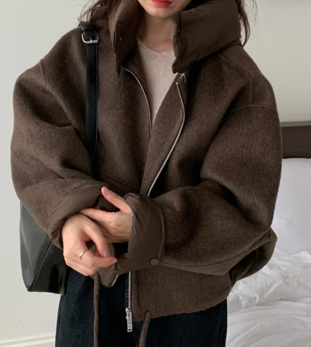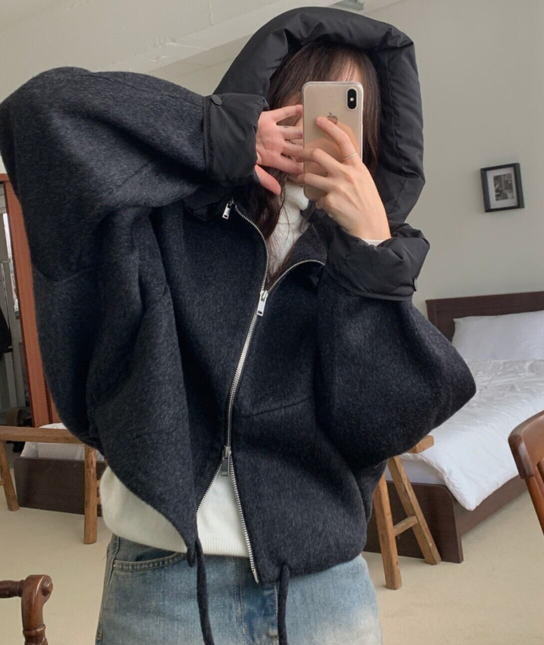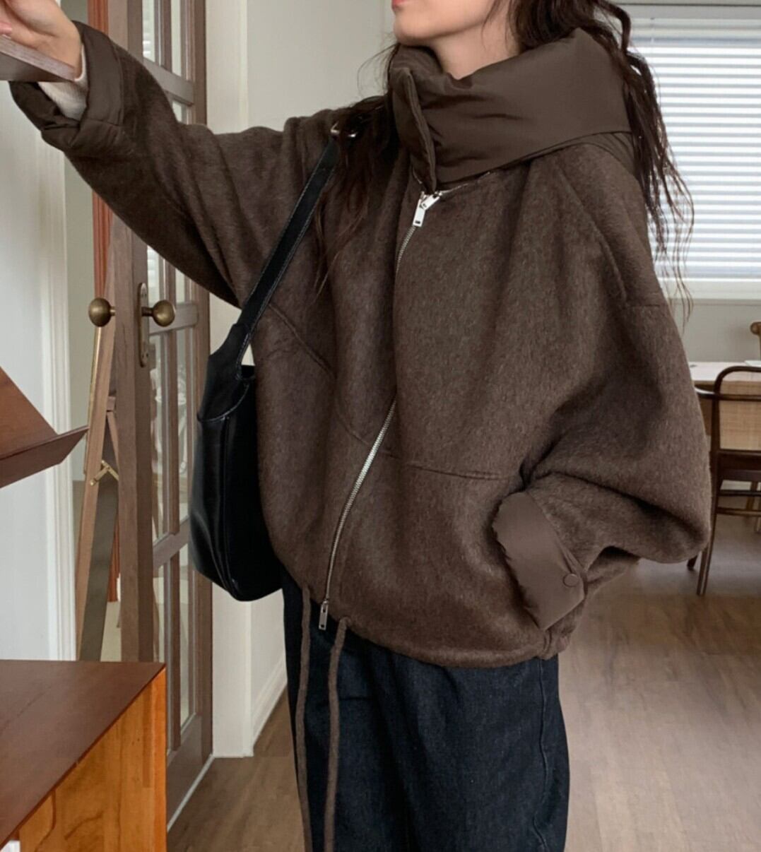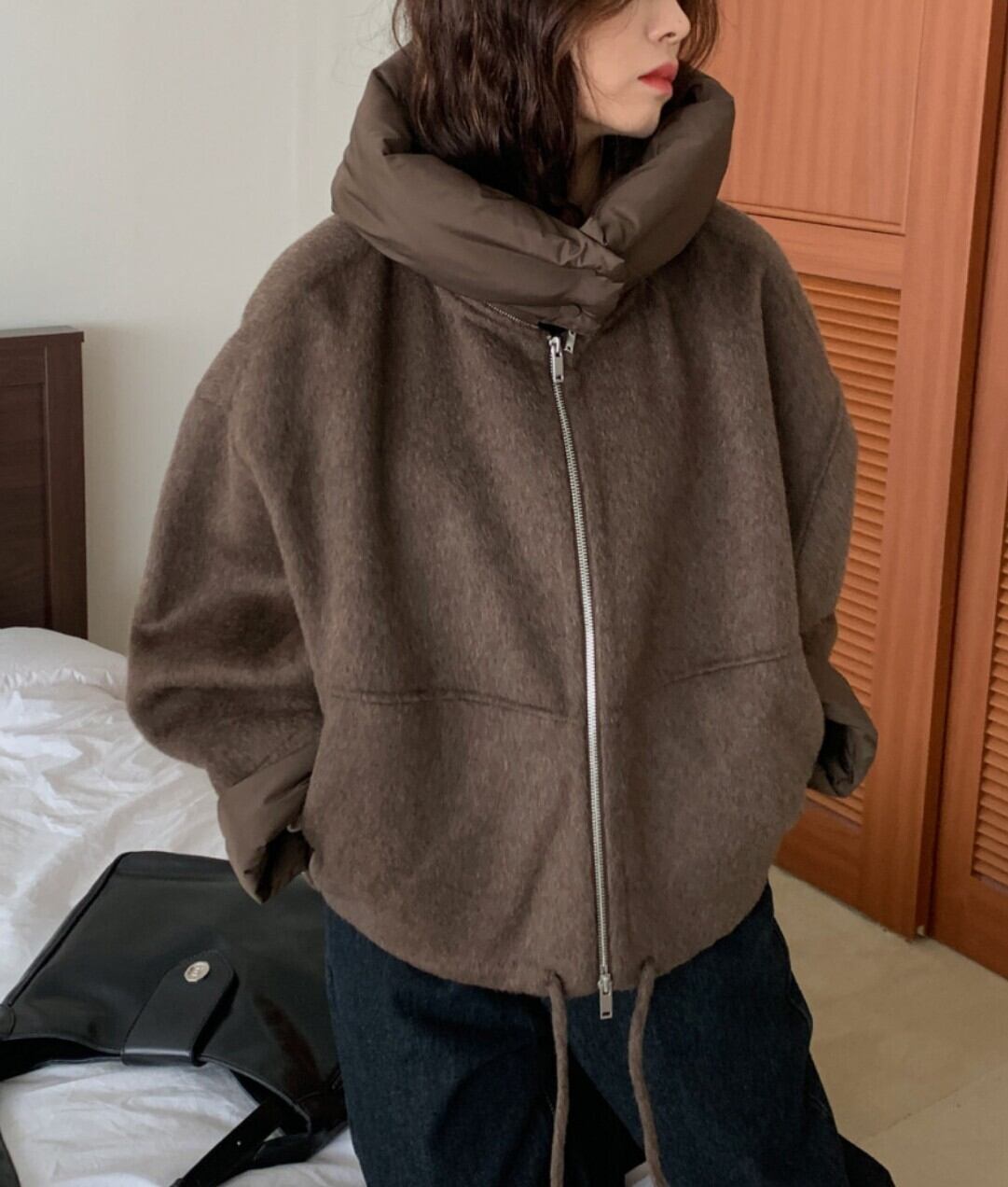 #NEIRA #アウター #ブルゾン #ショート丈 #ダブルジップ #ドローコード #フードアウター #ウールライク #オーバーサイズ #ドロップショルダー #モード #ダークファッション #韓国ファッション #冬コーデ #秋冬アウター #体型カバー #コクーンシルエット