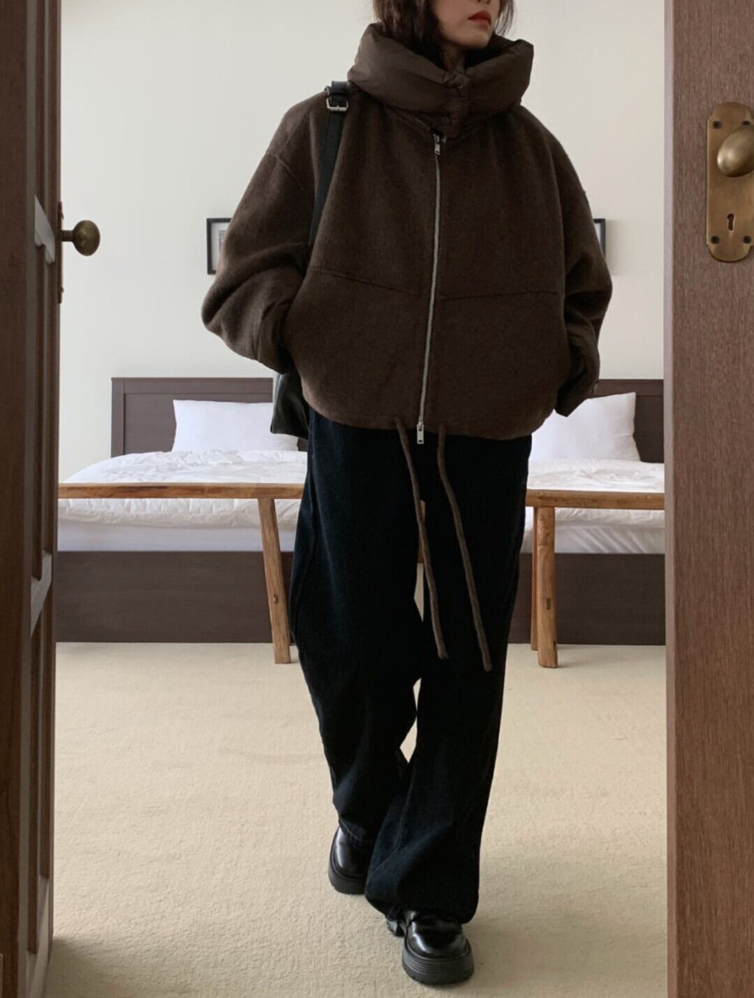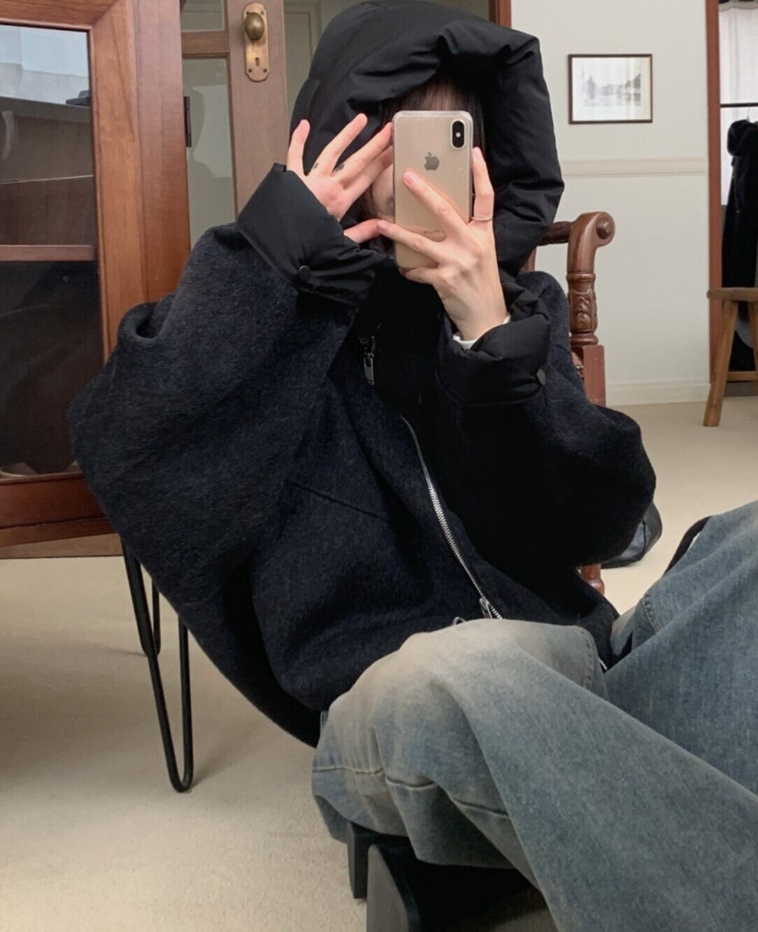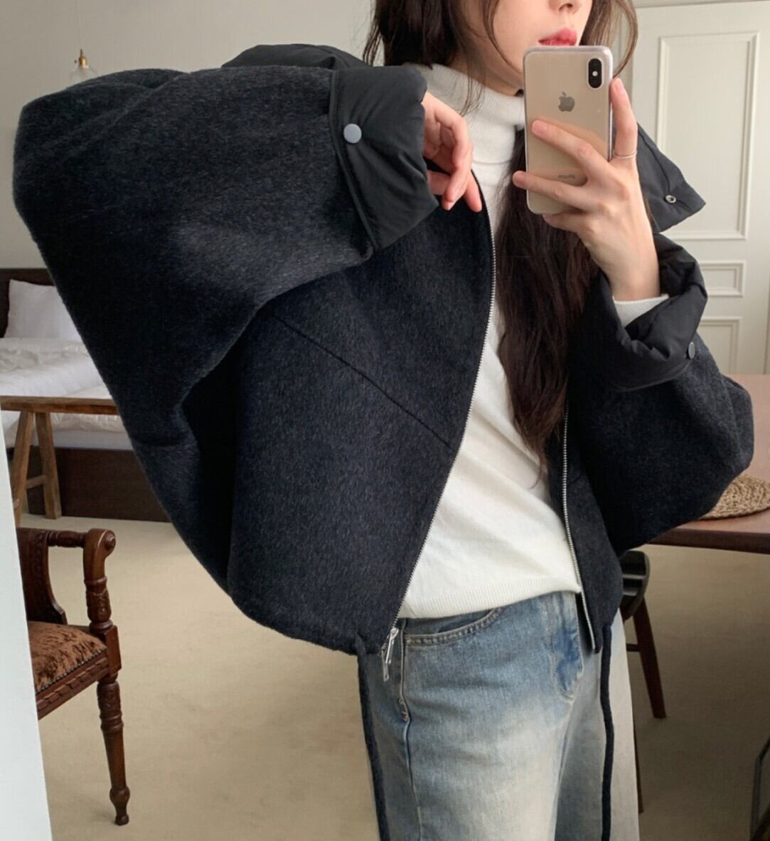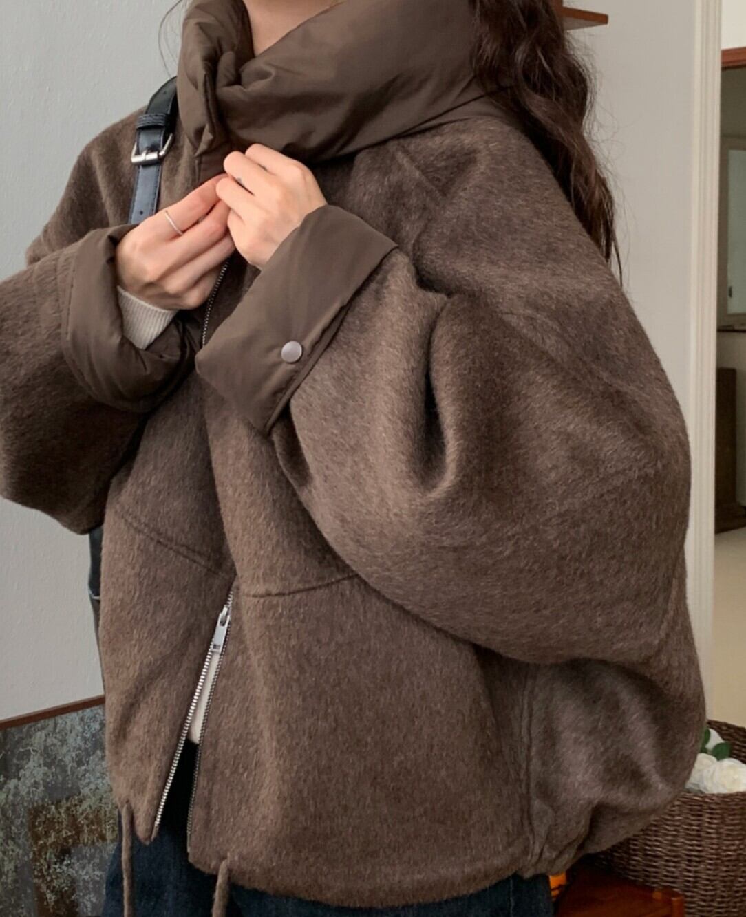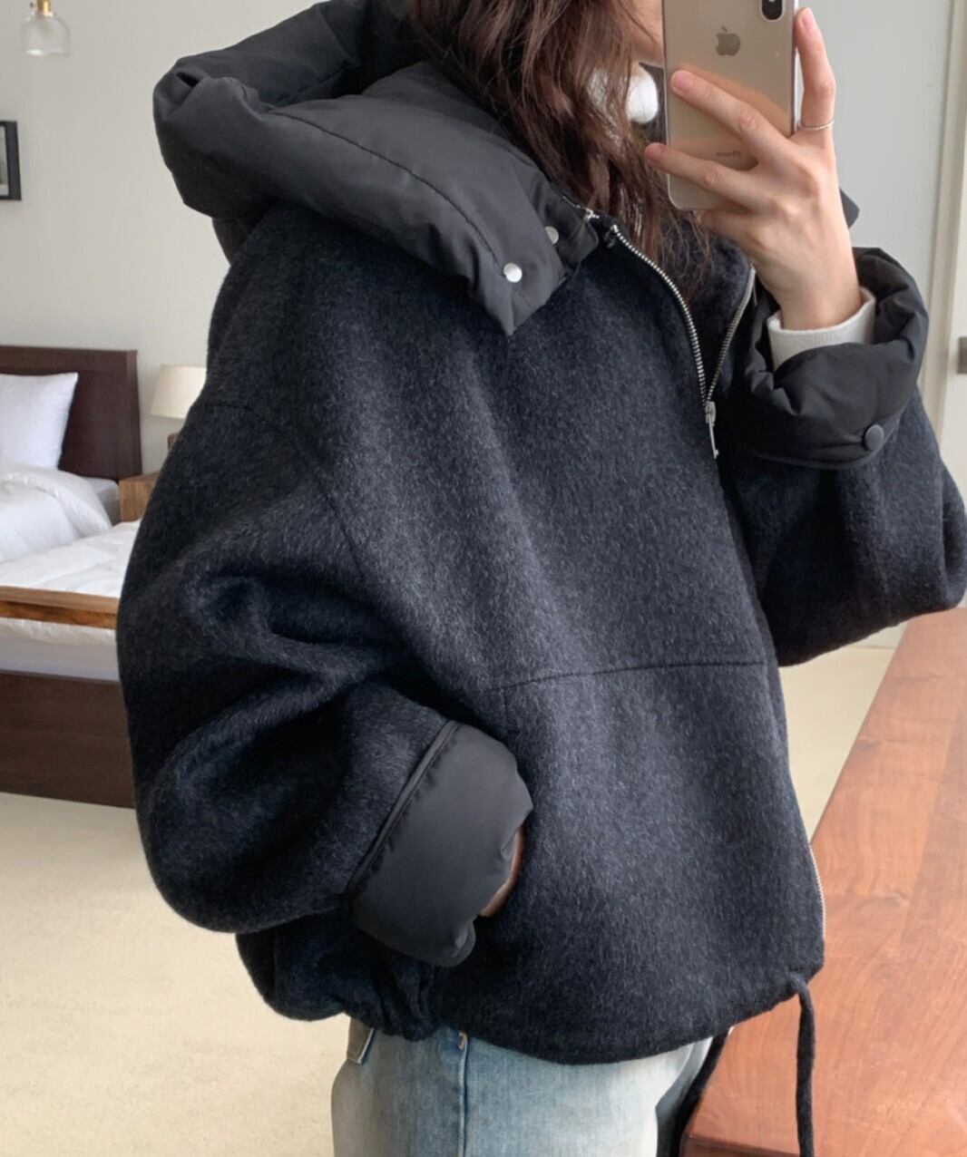 #NEIRA #アウター #ブルゾン #ショート丈 #ダブルジップ #ドローコード #フードアウター #ウールライク #オーバーサイズ #ドロップショルダー #モード #ダークファッション #韓国ファッション #冬コーデ #秋冬アウター #体型カバー #コクーンシルエット