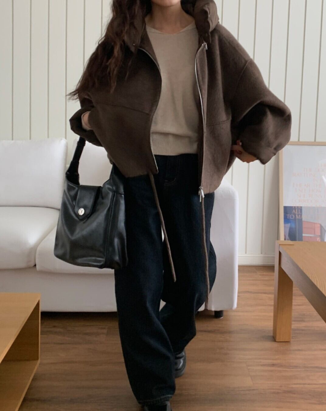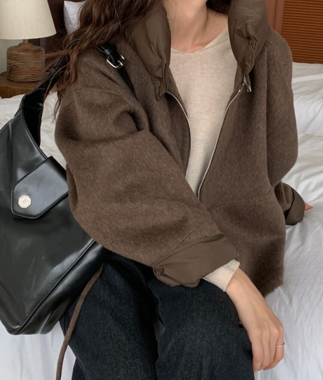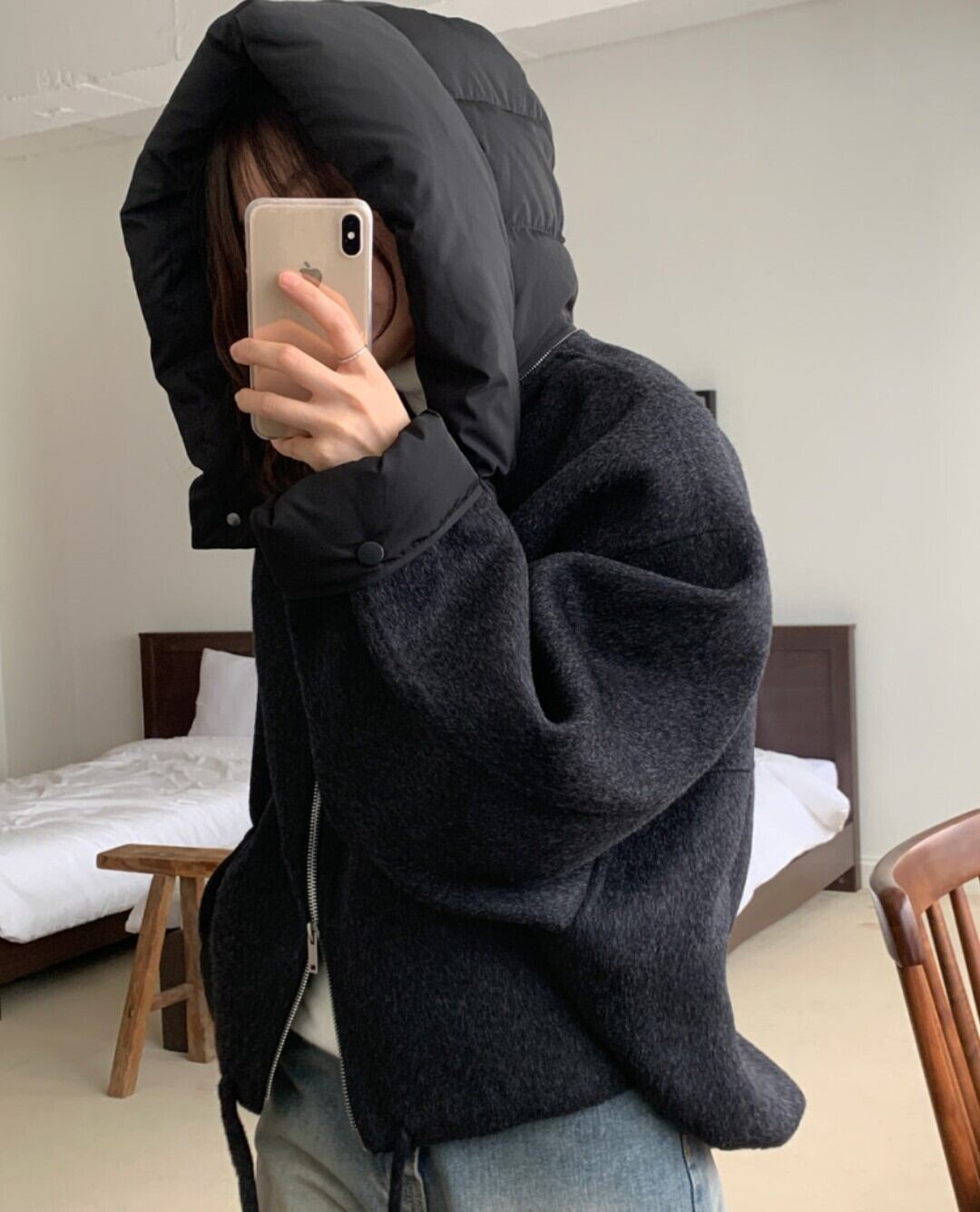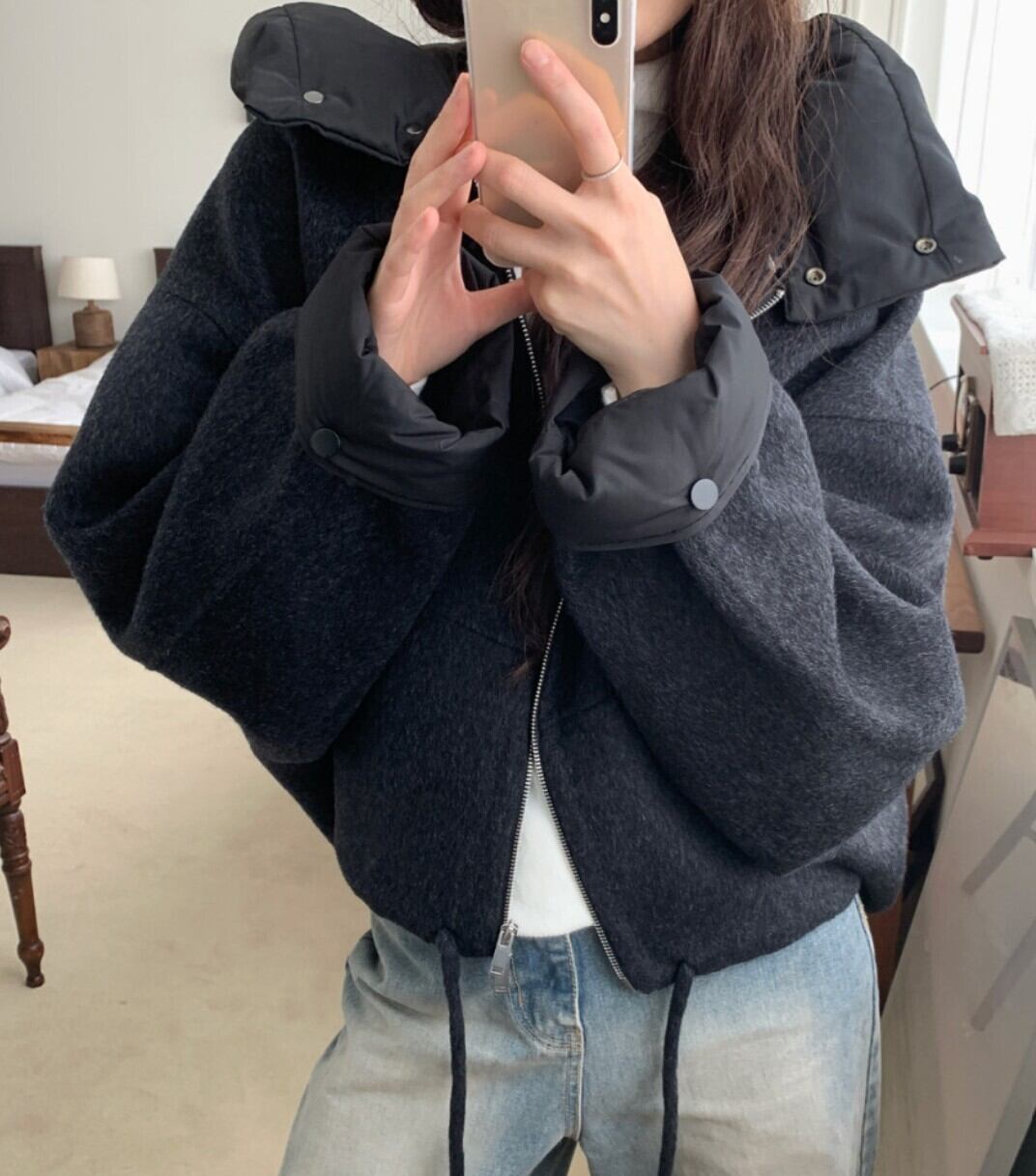 #NEIRA #アウター #ブルゾン #ショート丈 #ダブルジップ #ドローコード #フードアウター #ウールライク #オーバーサイズ #ドロップショルダー #モード #ダークファッション #韓国ファッション #冬コーデ #秋冬アウター #体型カバー #コクーンシルエット