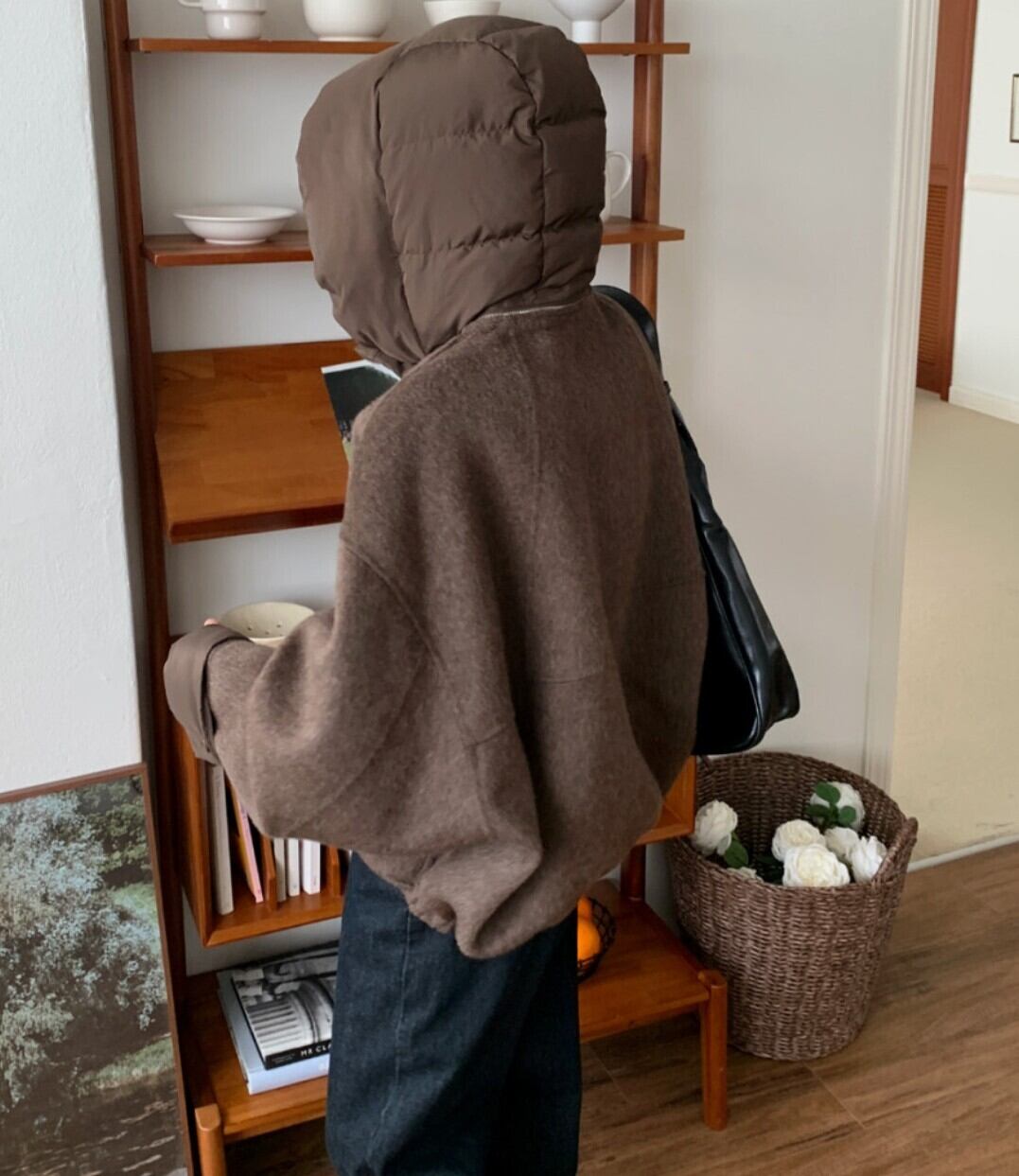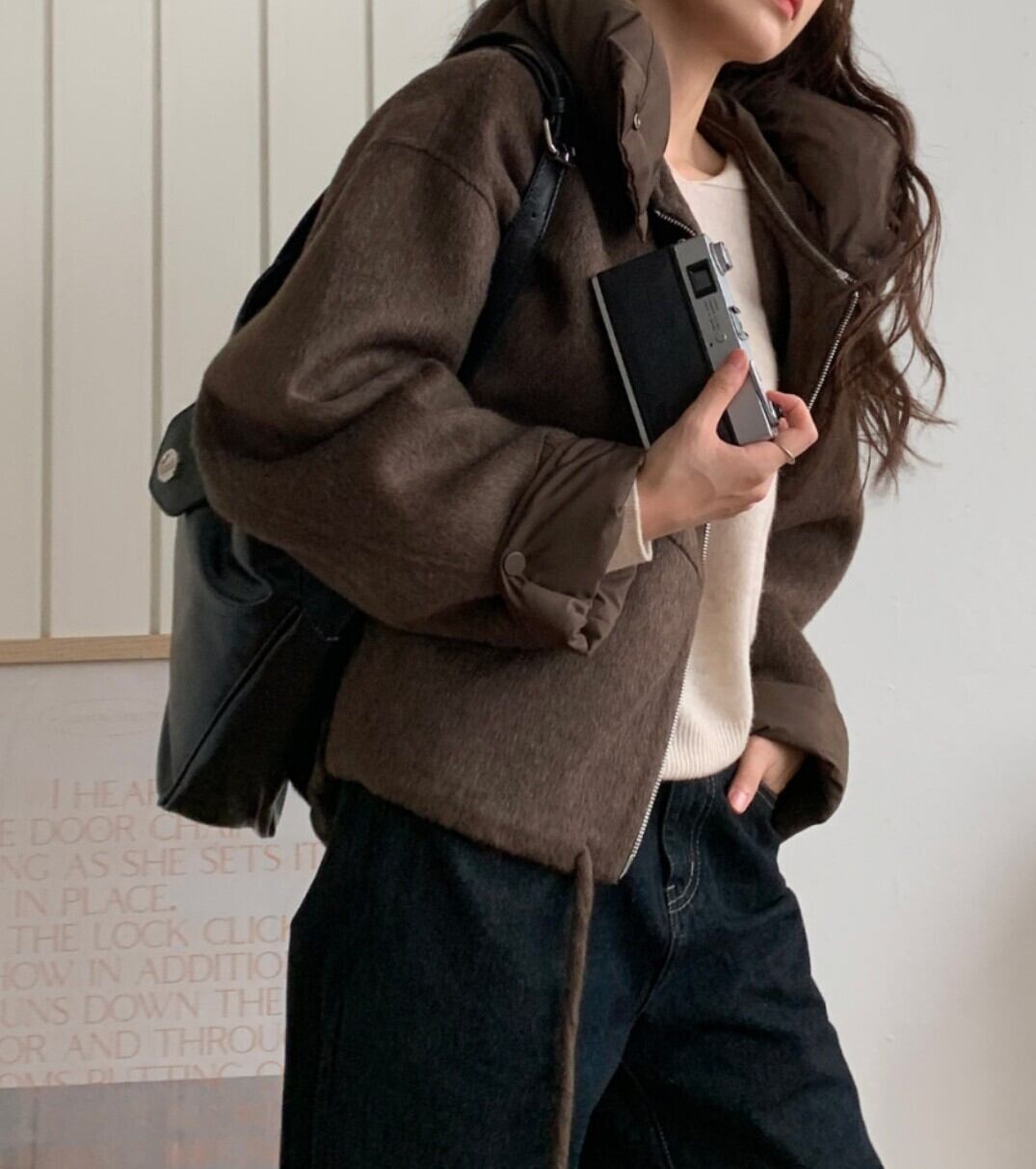 短丈×ワイドで重心を上げ、羽織るだけでNEIRAらしい無機質な冬ムードに。