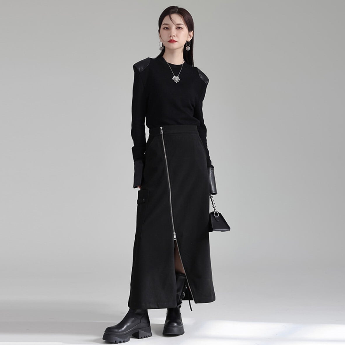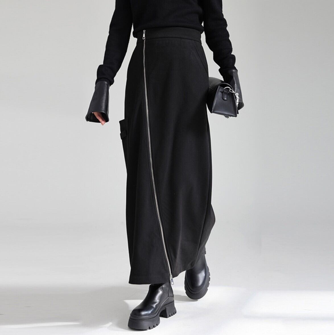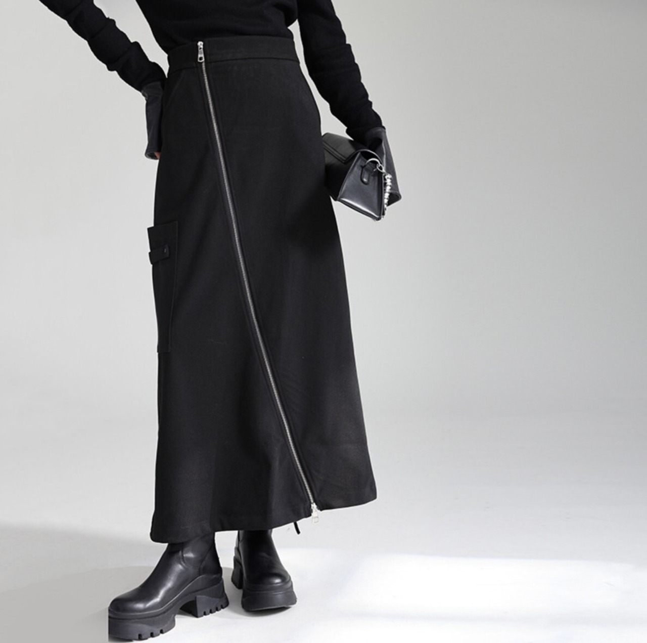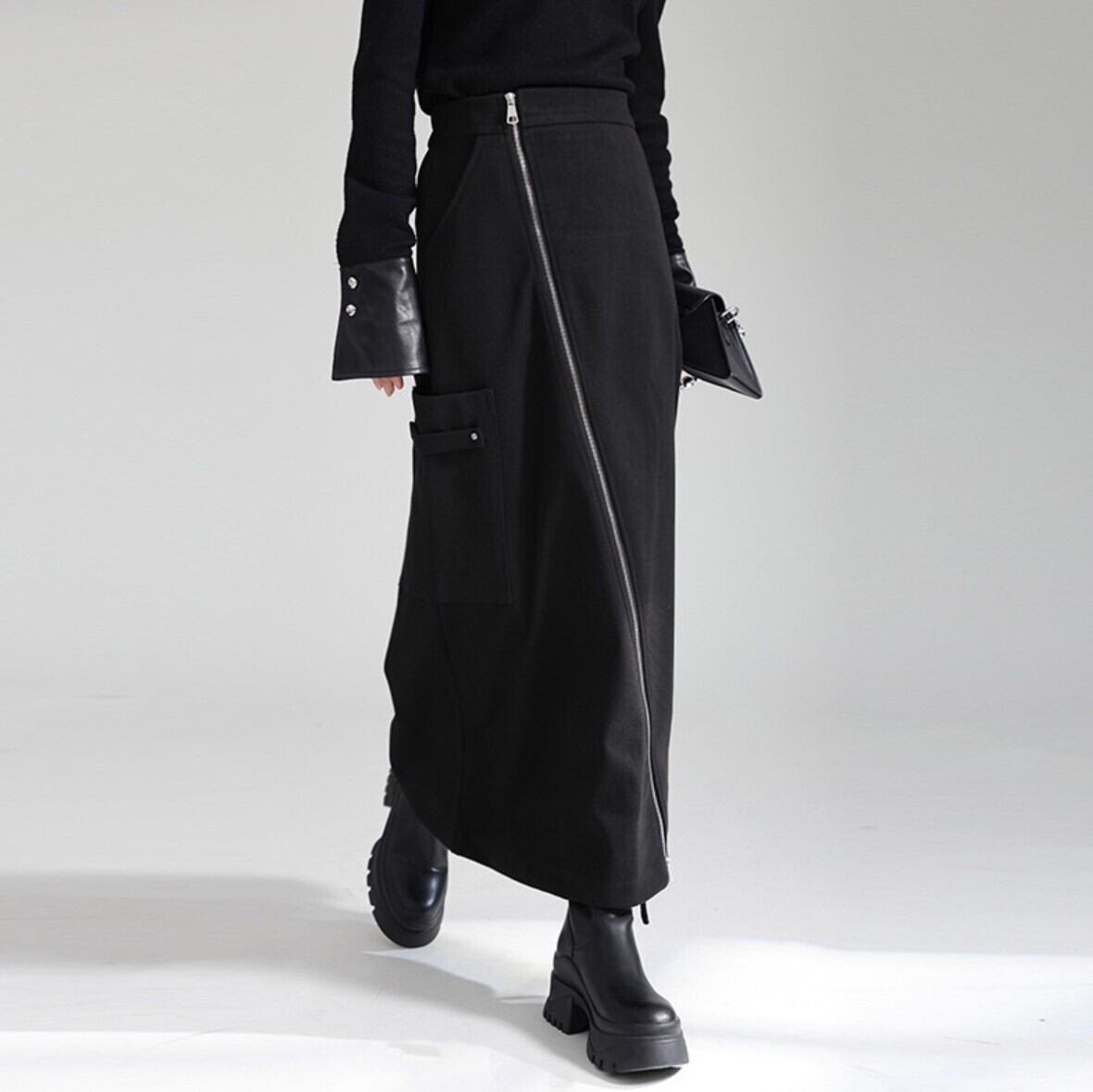 #スカート #ロングスカート #ジップスカート #フロントジップ #スリット #カーゴポケット #ハイウエスト #モード #ダークモード #韓国モード #黒コーデ #ユニセックス #秋冬 #ブーツコーデ