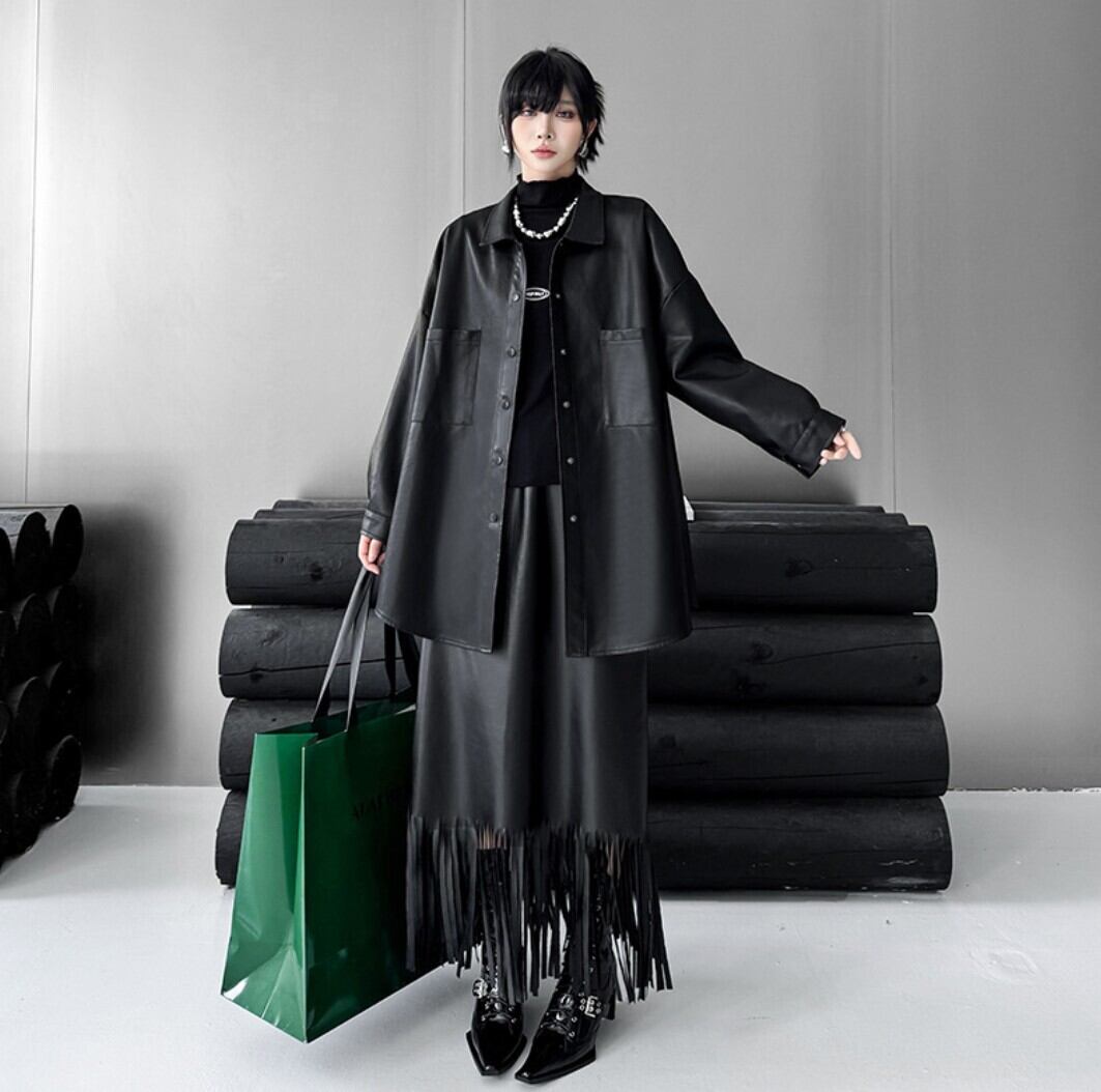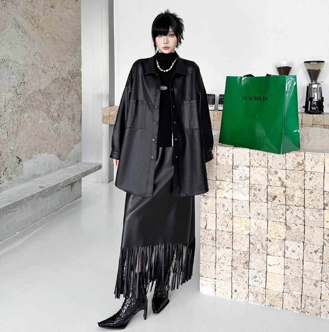 #フェイクレザー #レザージャケット #シャツジャケット #オーバーサイズ #ブラックコーデ #モードファッション #韓国ファッション #ユニセックス #秋冬アウター #レイヤードスタイル