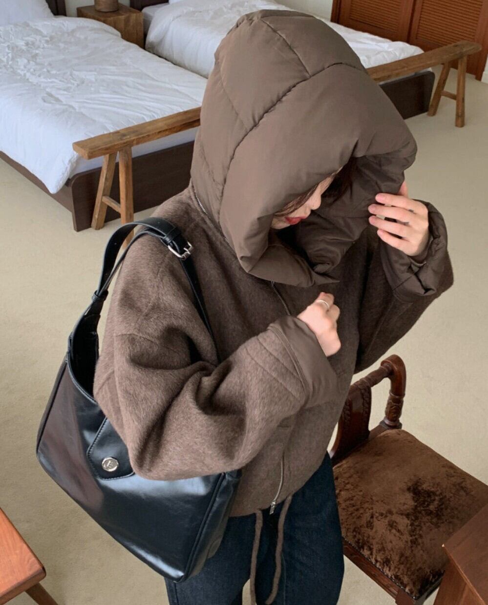 中綿ネックを重ねた異素材ドッキングブルゾン。