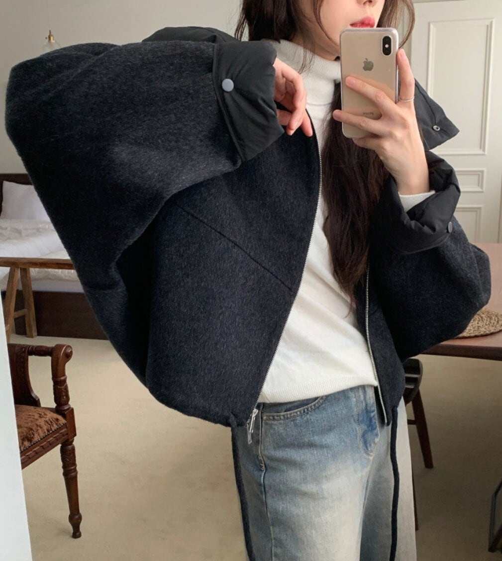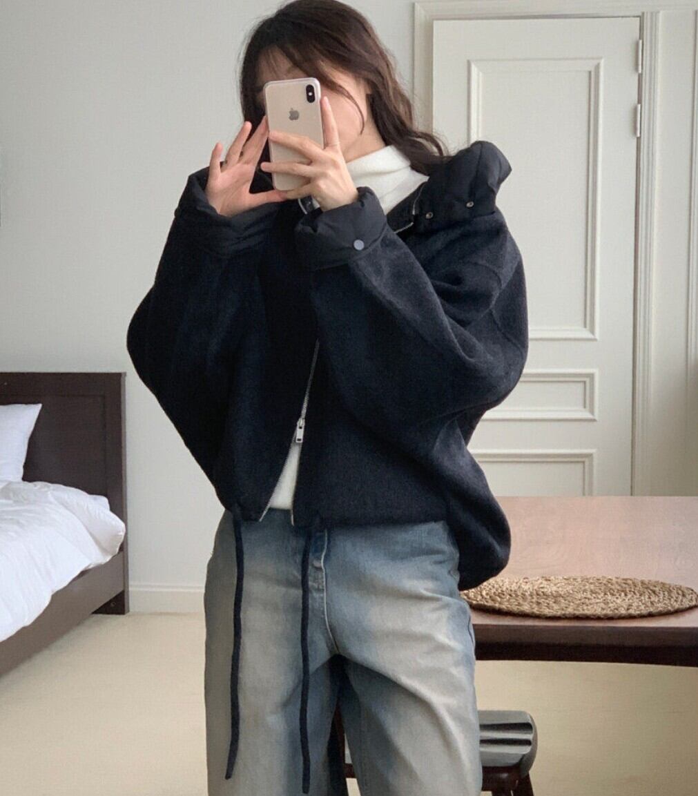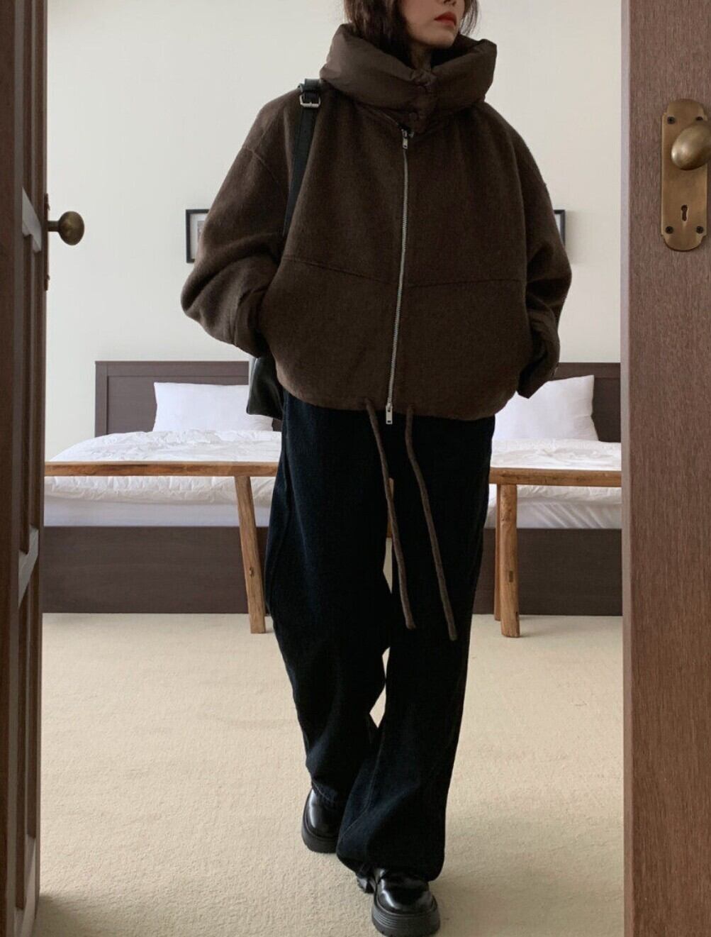 #NEIRA #モードアウター #ウールライク #ショートブルゾン #中綿ネック #ビッグシルエット #韓国モード #冬アウター #黒コーデ #ユニセックス #オーバーサイズ