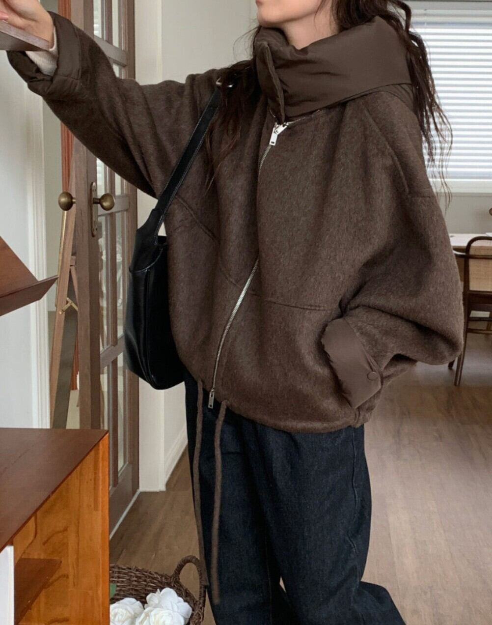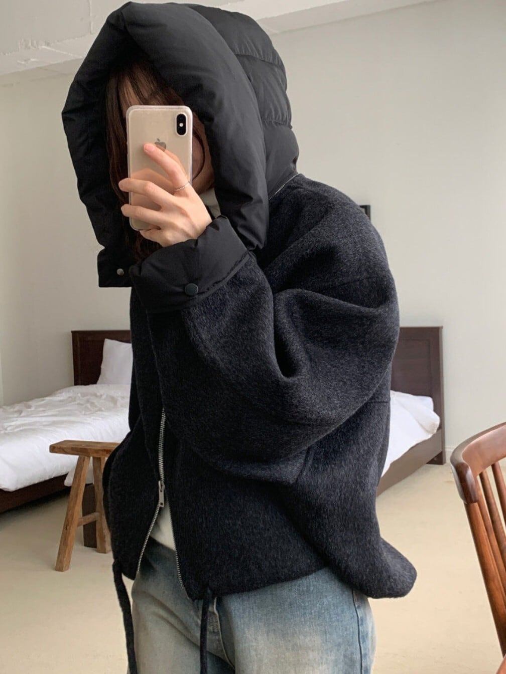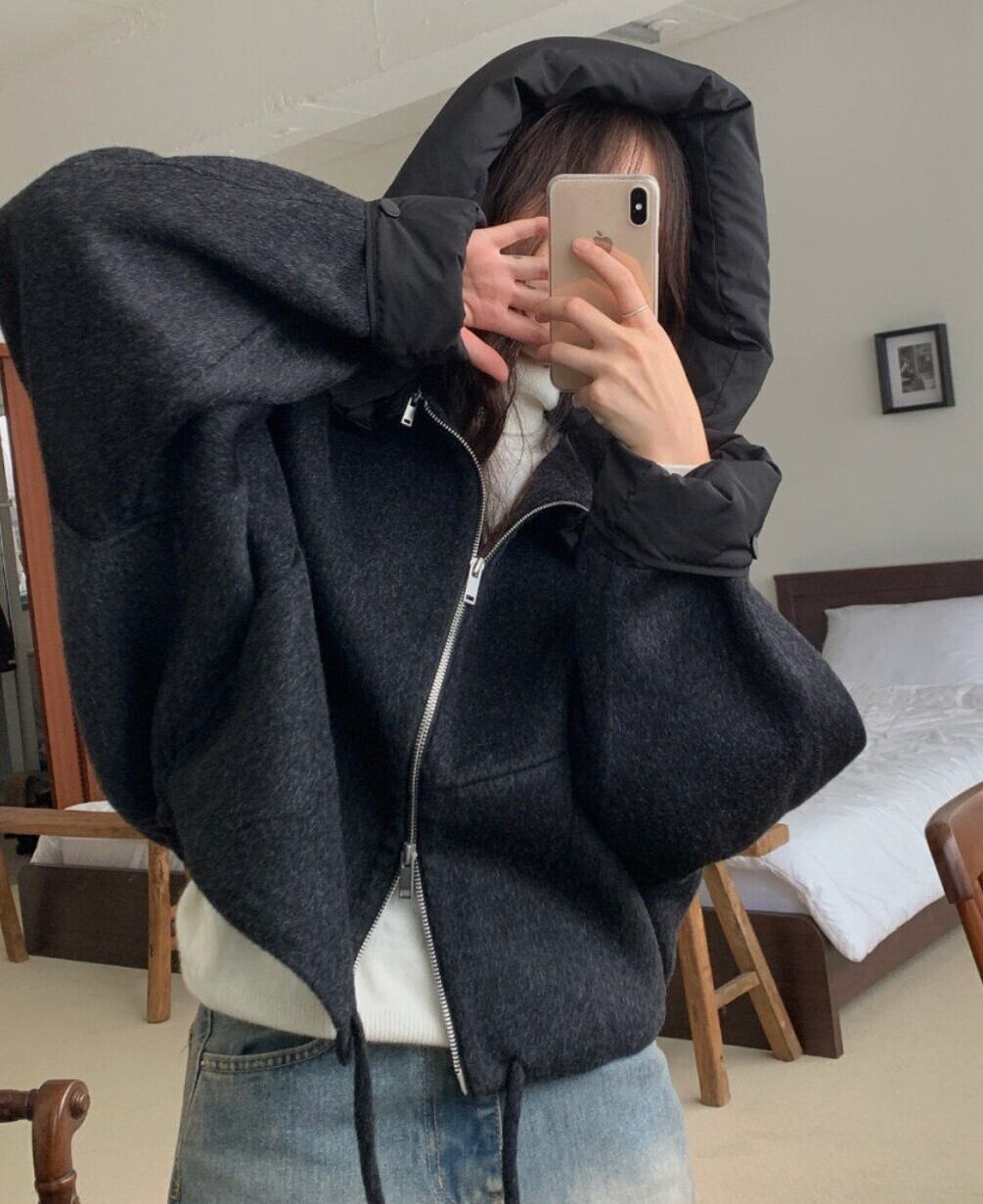 #NEIRA #モードアウター #ウールライク #ショートブルゾン #中綿ネック #ビッグシルエット #韓国モード #冬アウター #黒コーデ #ユニセックス #オーバーサイズ
