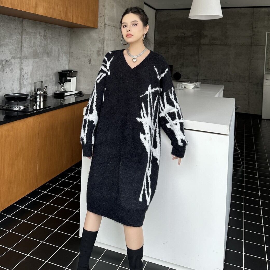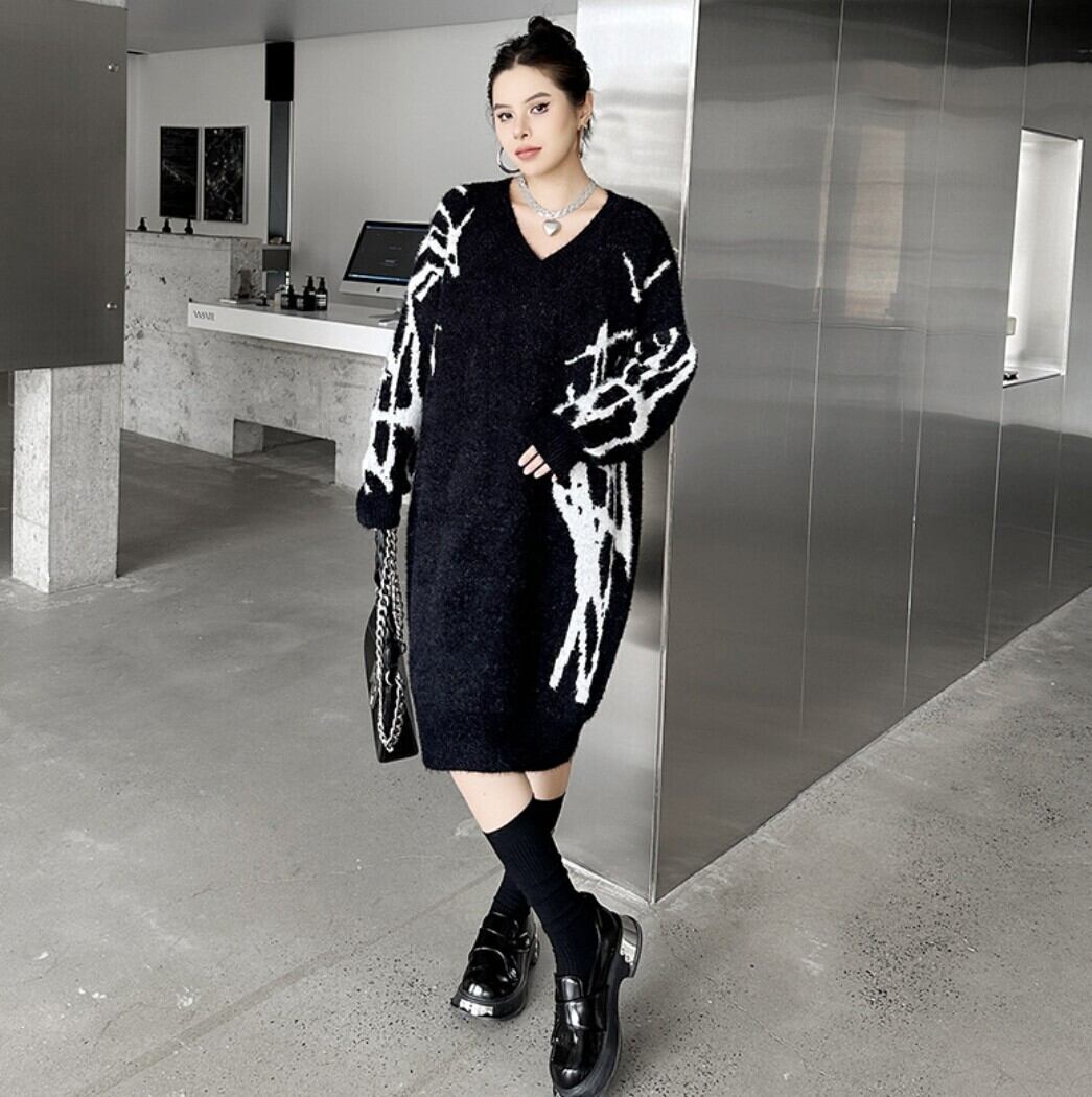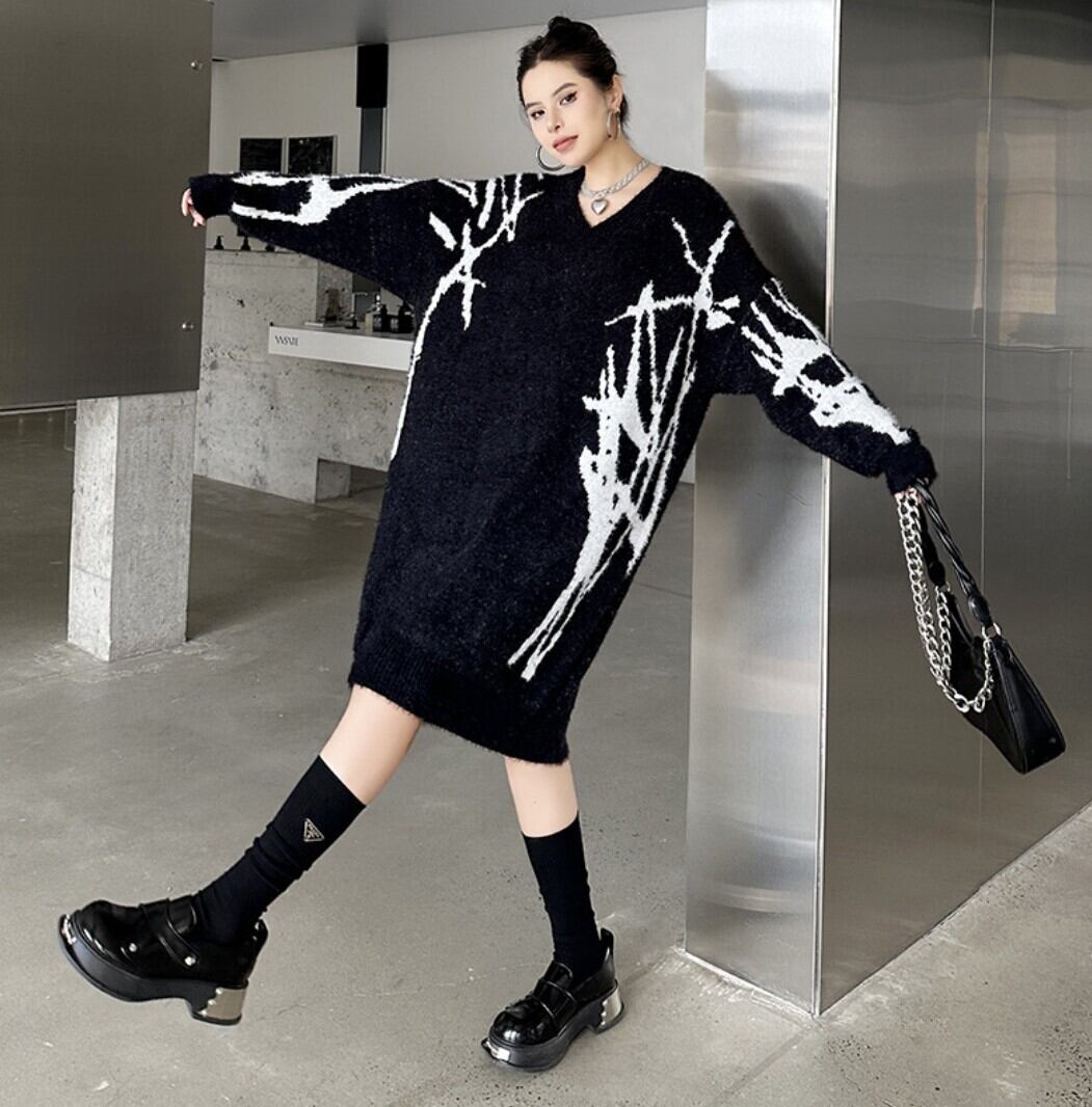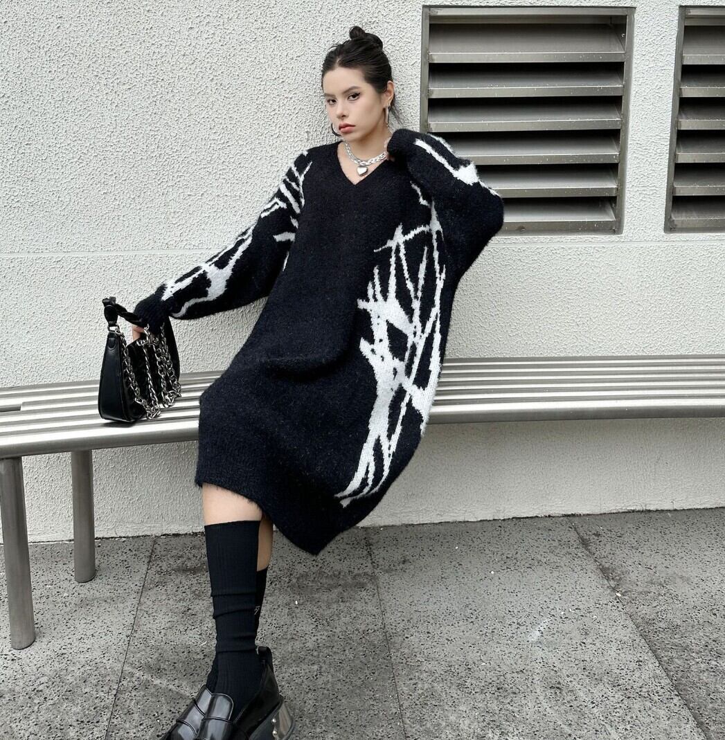 #NEIRA #ニットワンピース #Vネックワンピース #配色ニット #モードファッション #韓国ファッション #ダークコーデ #個性派ファッション #オーバーサイズ #ミディ丈 #秋冬コーデ #ストリートモード