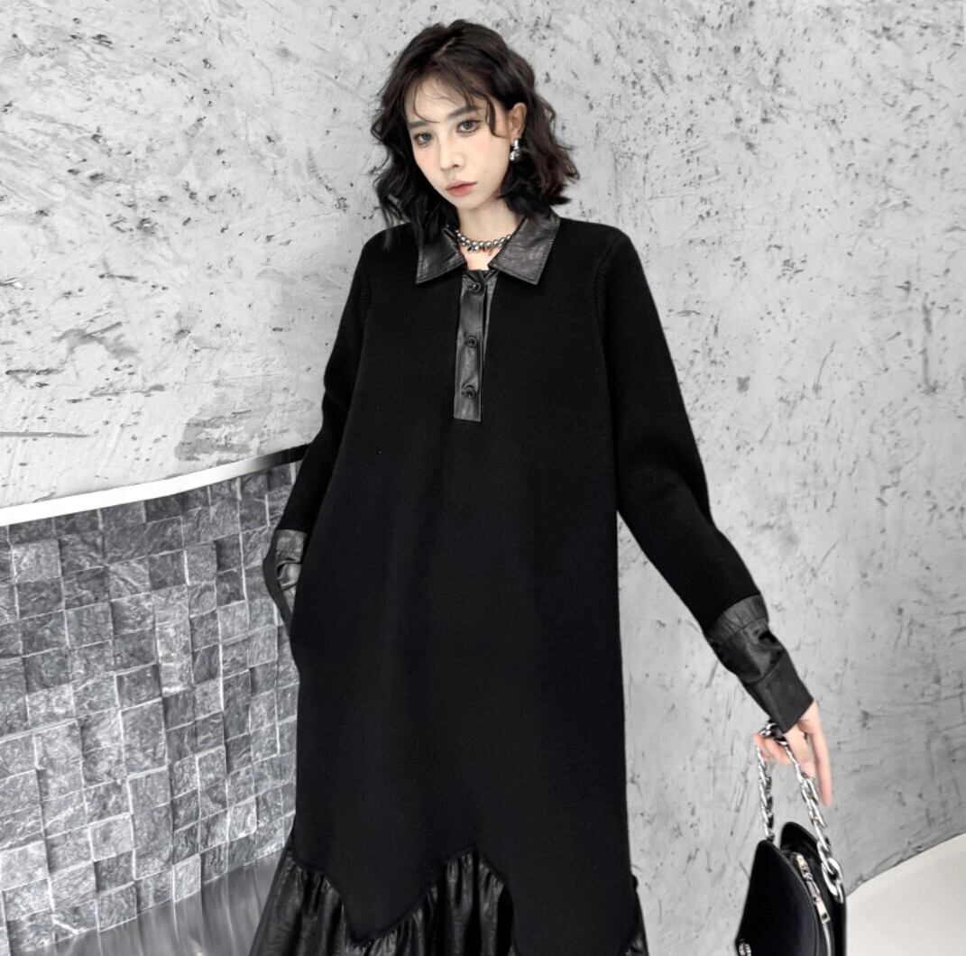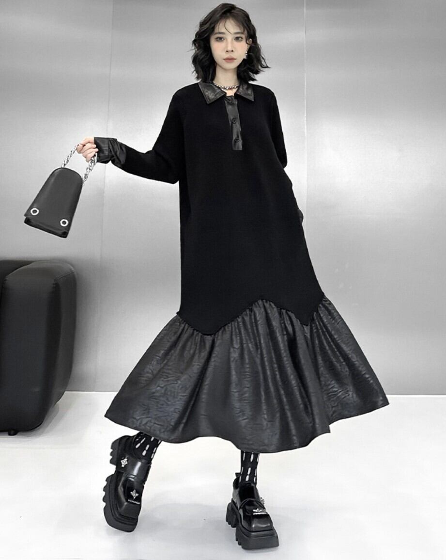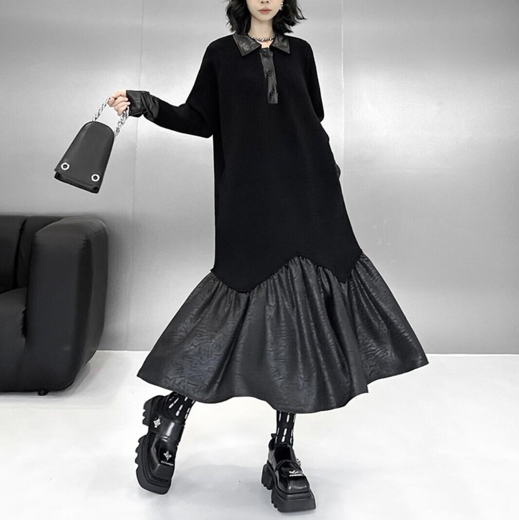 ミニマルなブラックをベースに、裾のフェイクレザー切替が印象を引き締めるロングワンピース。