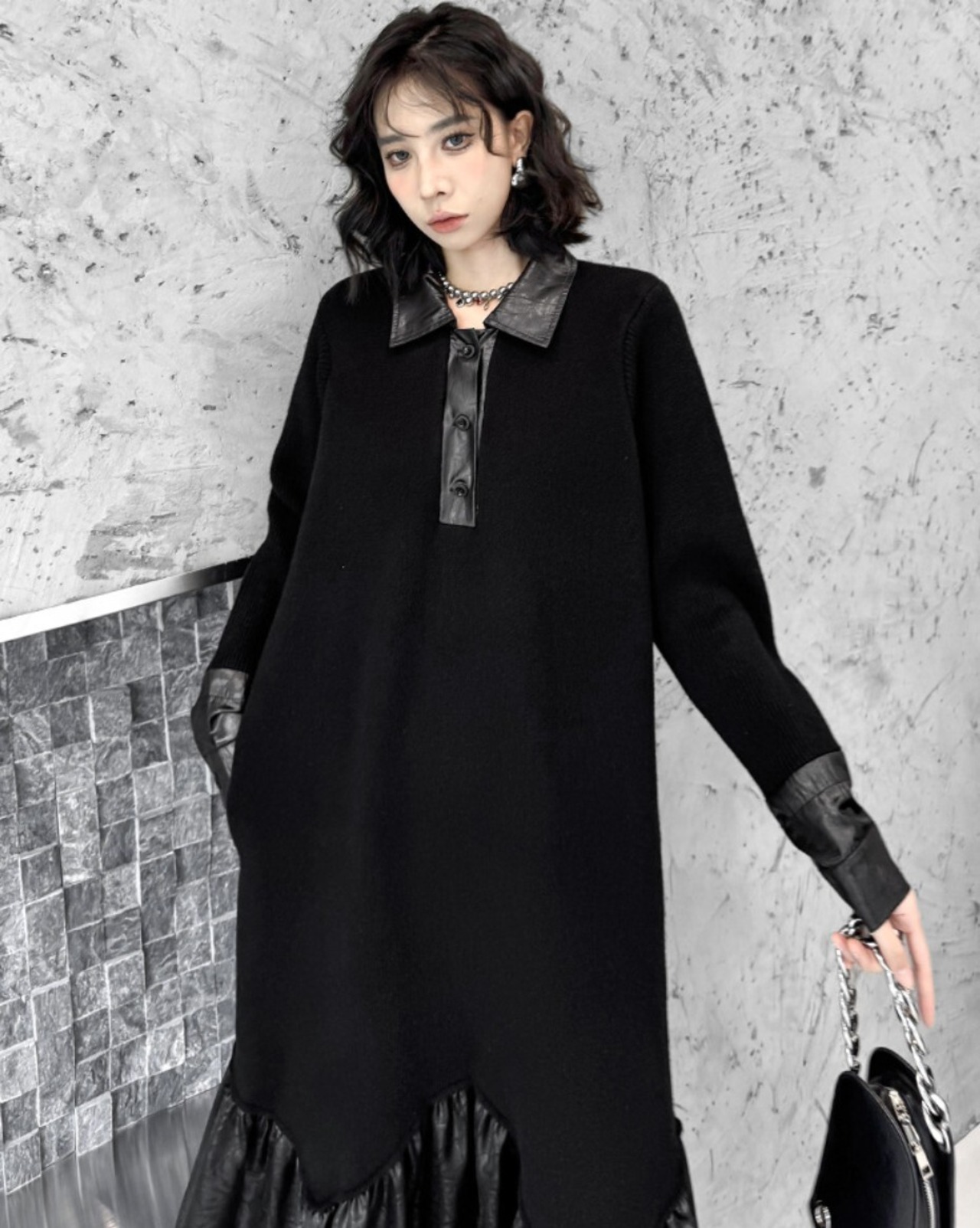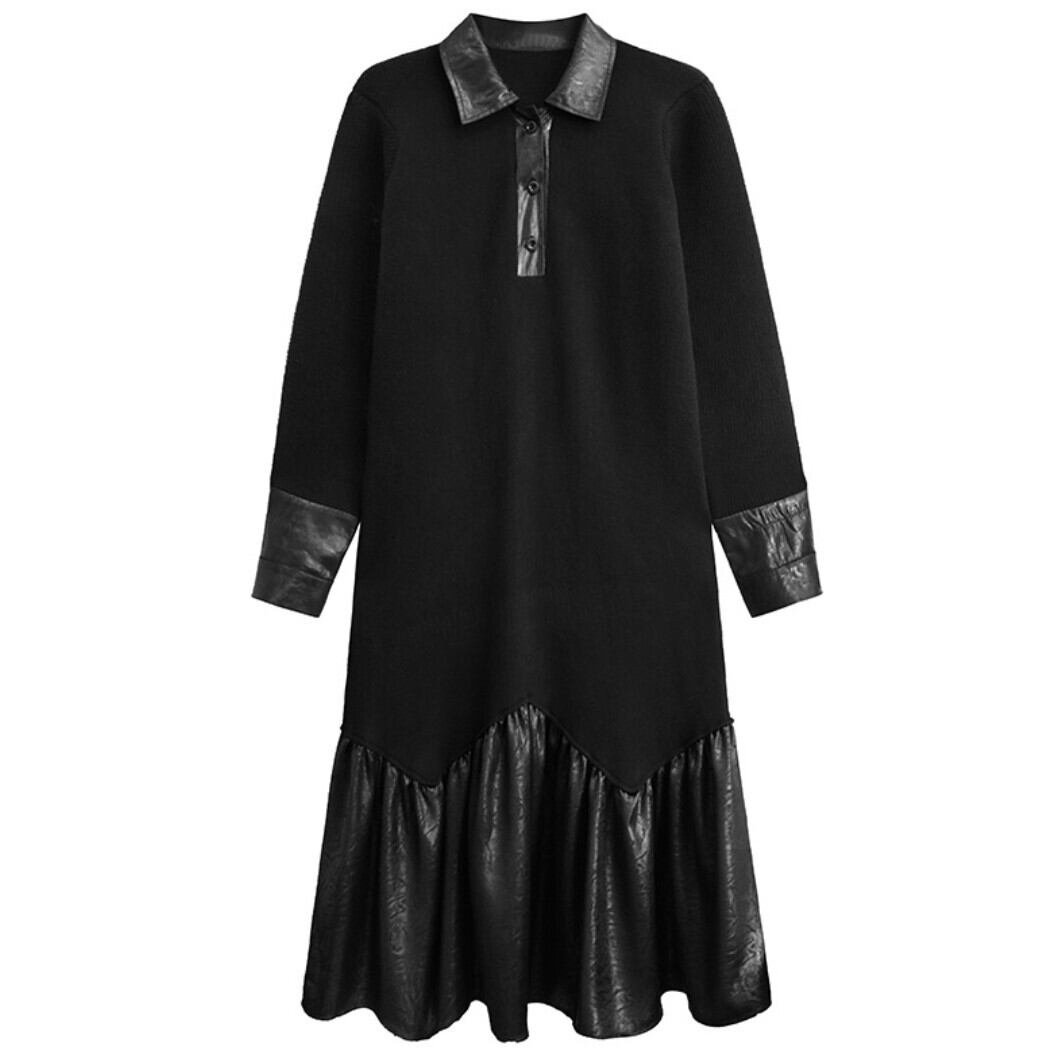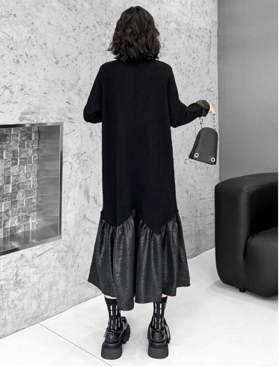 ミニマルなブラックをベースに、裾のフェイクレザー切替が印象を引き締めるロングワンピース。