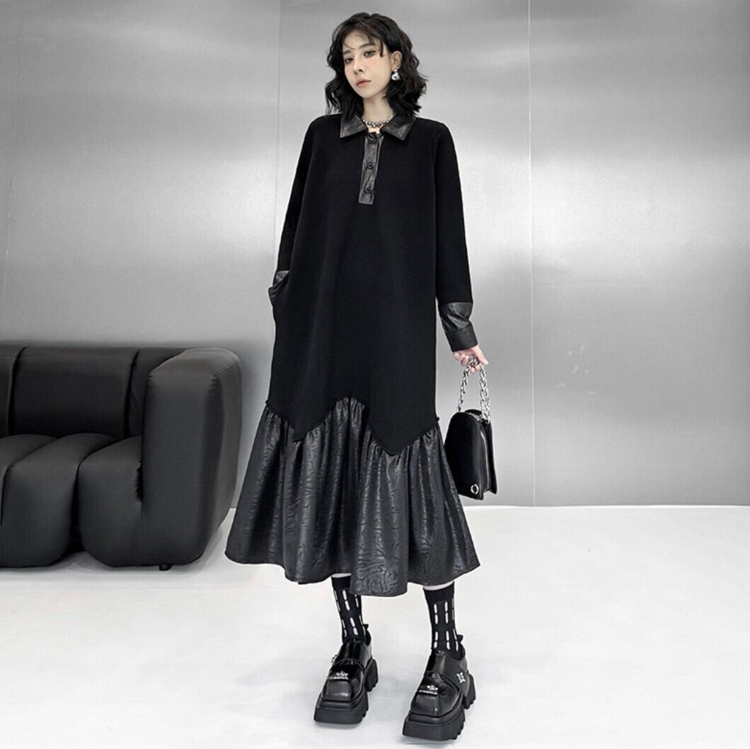 フェイクレザー切替 シャツカラーロングワンピース / 韓国モード