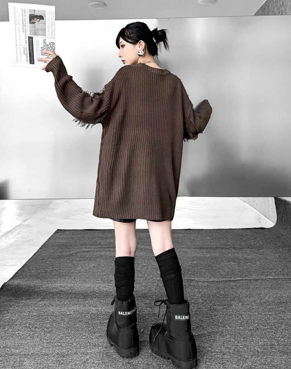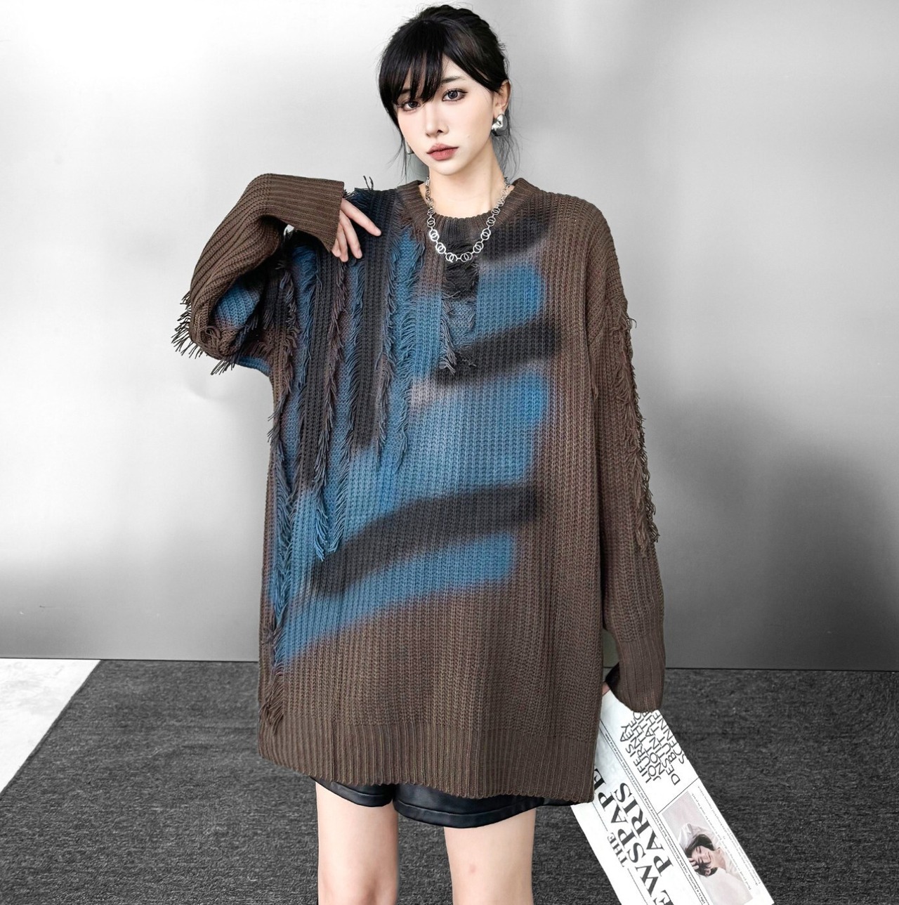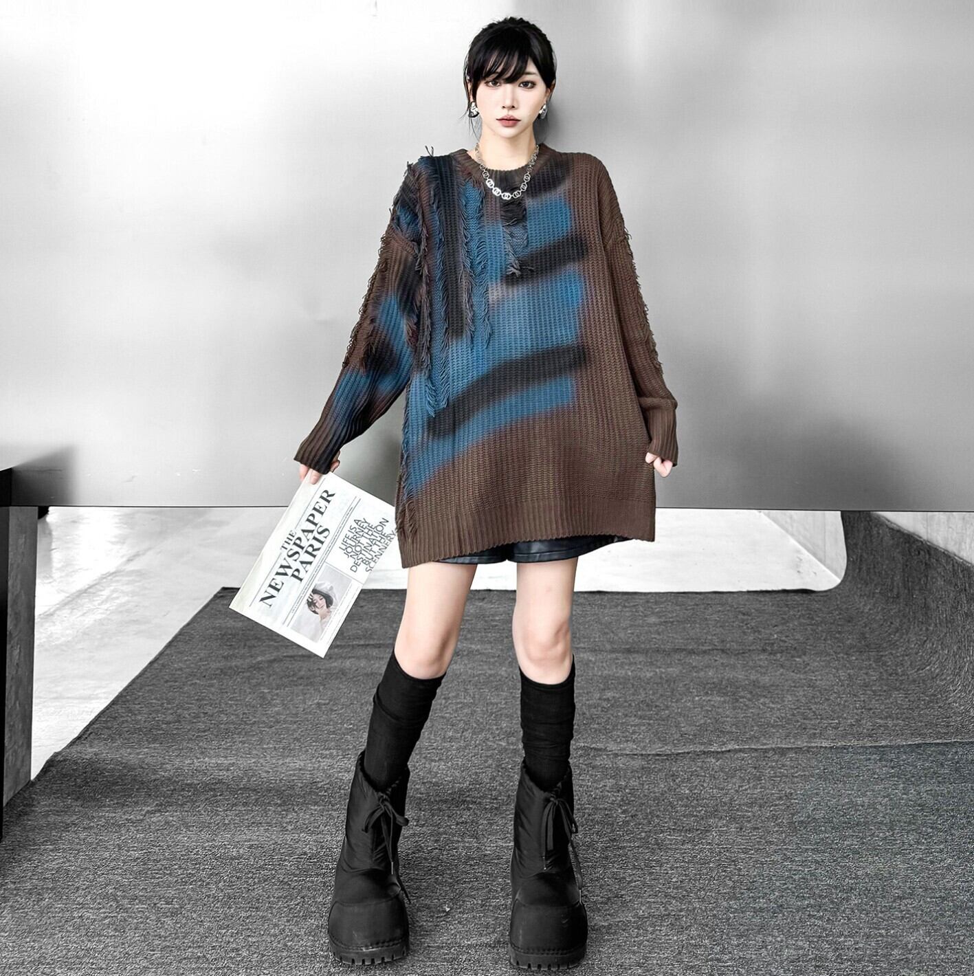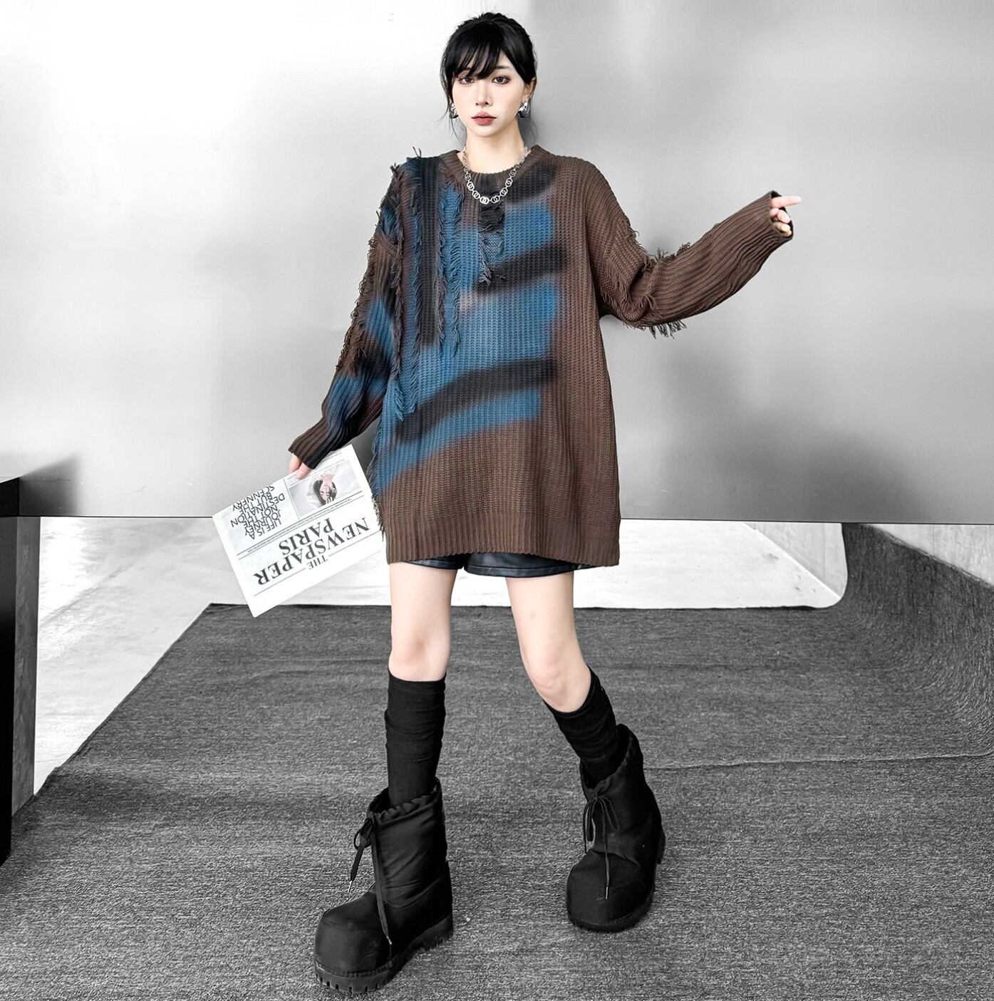 ブルーグラデ フリンジダメージオーバーニット / 韓国モード