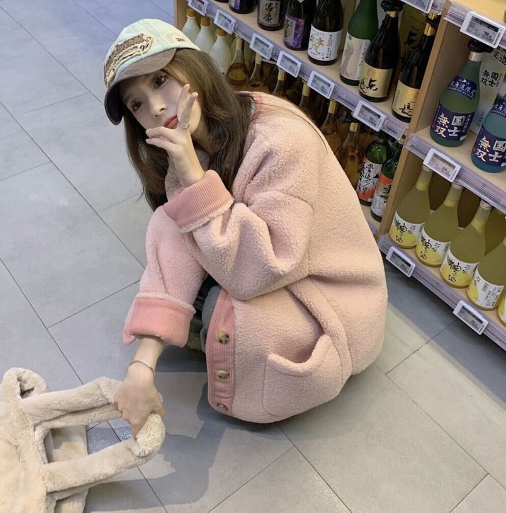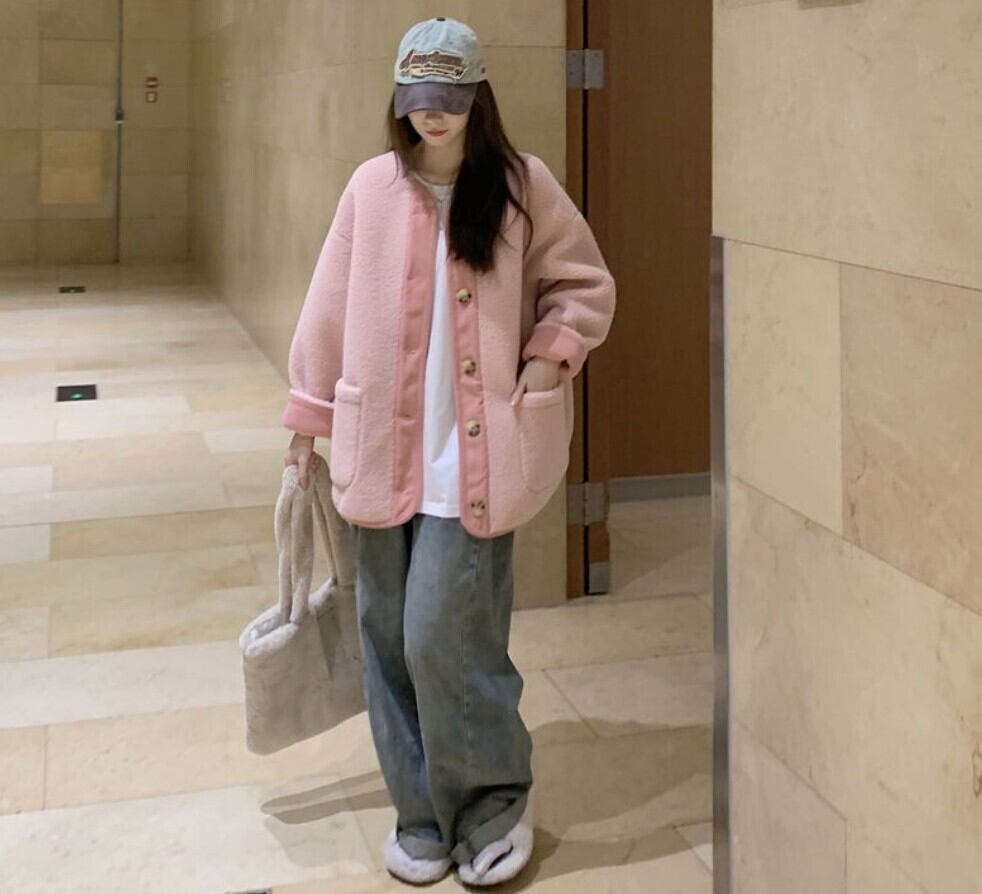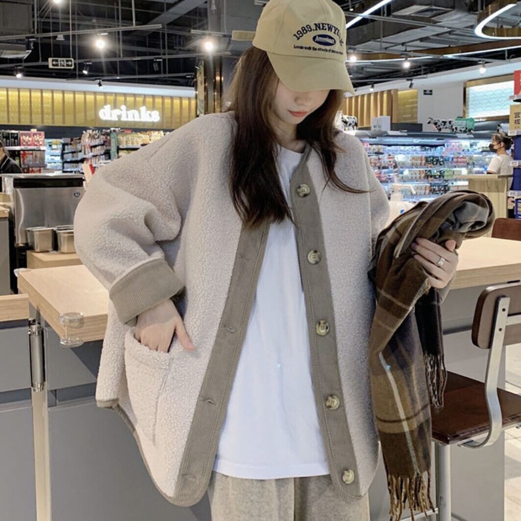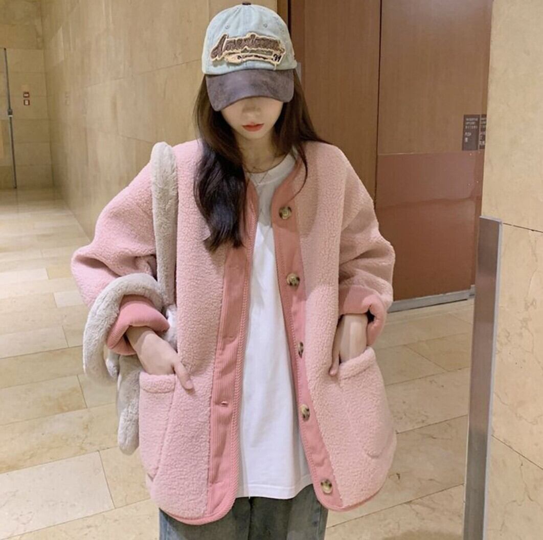 配色リブ バイカラーボアノーカラーアウター / 韓国ファッション