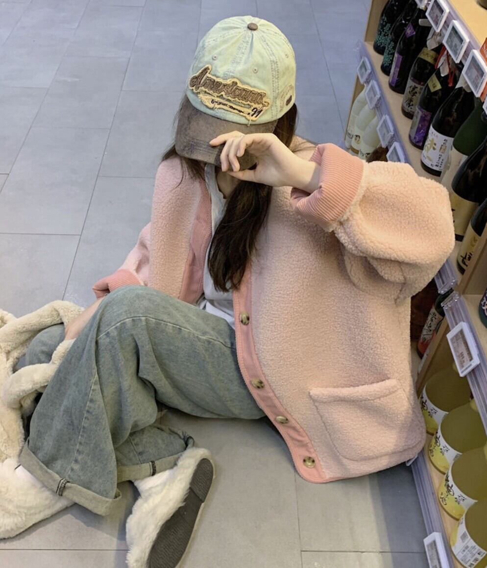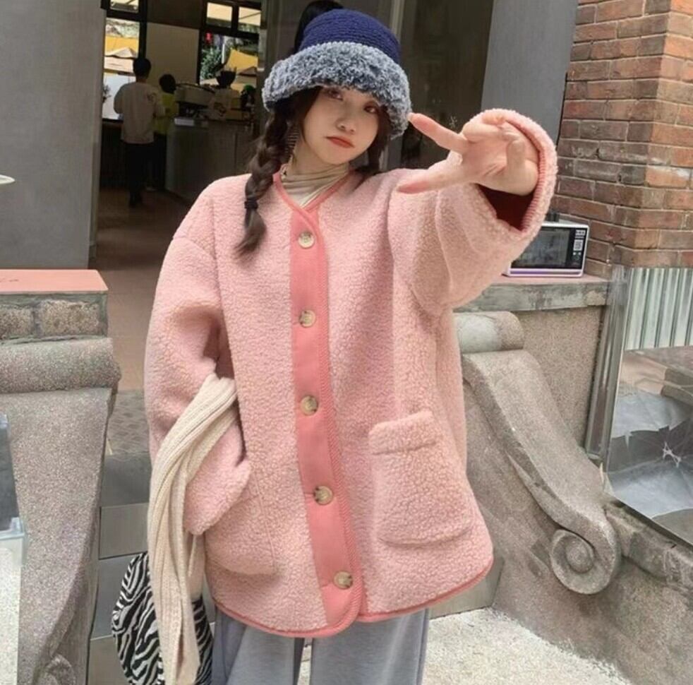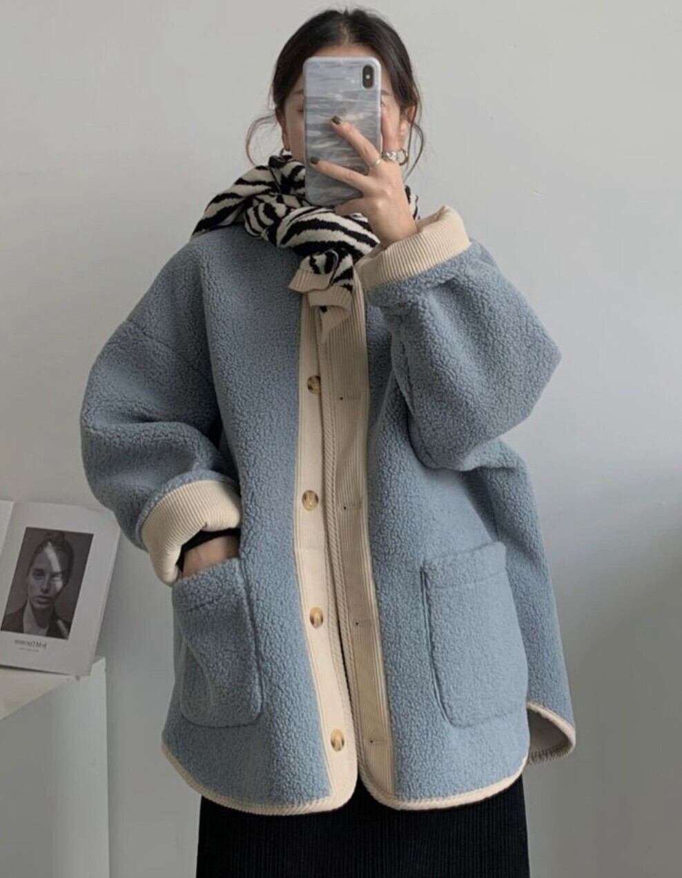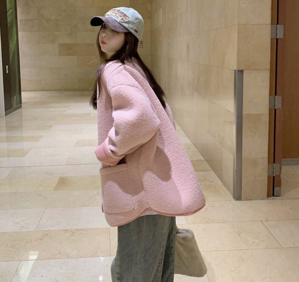 配色リブ バイカラーボアノーカラーアウター / 韓国ファッション