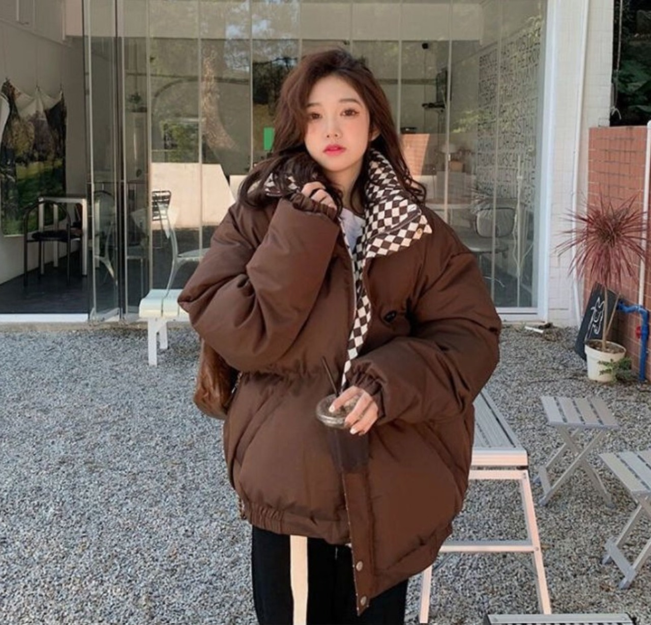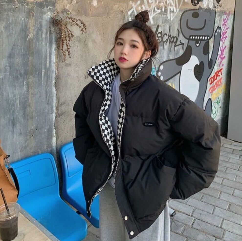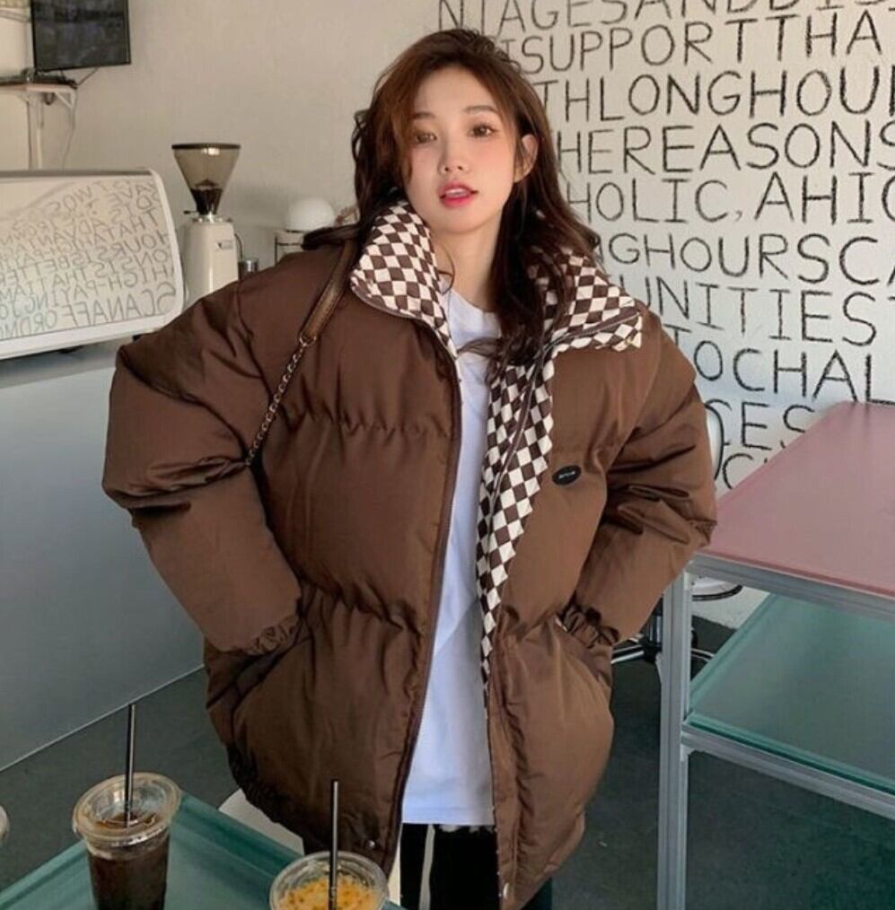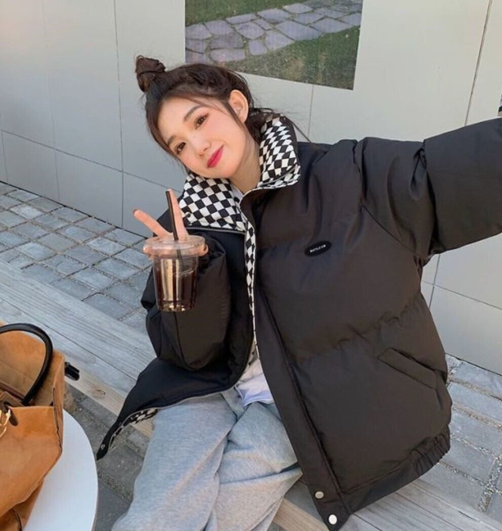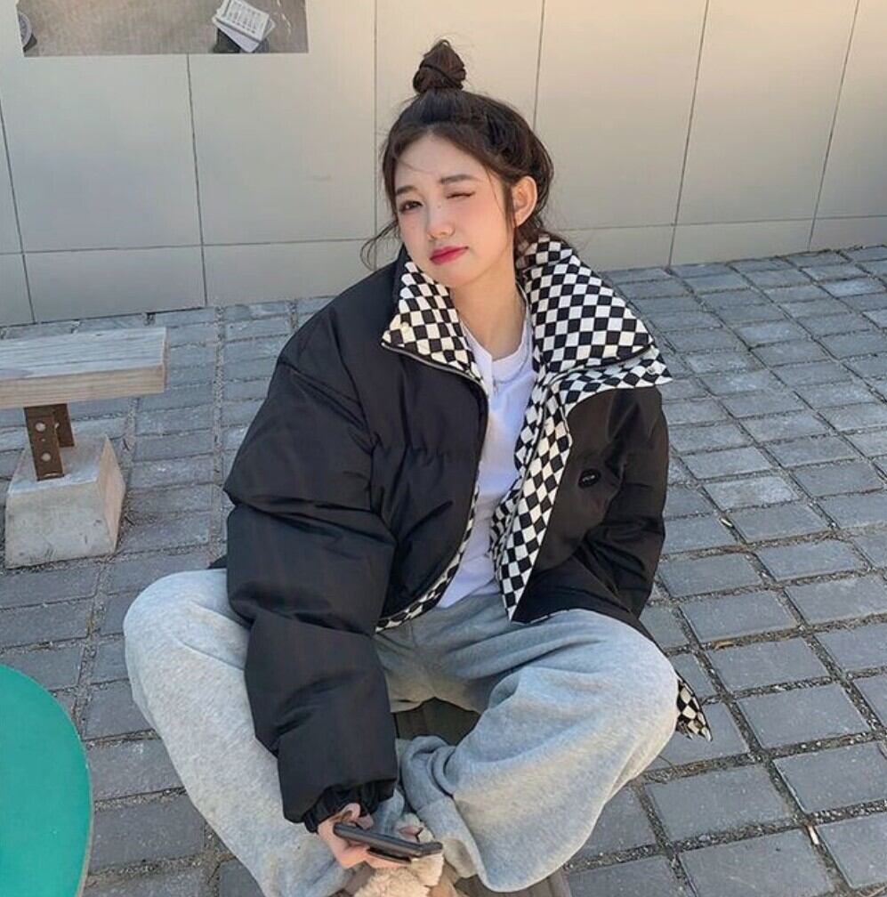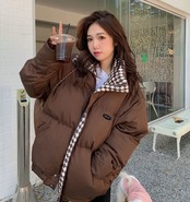 チェック切替 中綿パファージャケット / 韓国ファッション