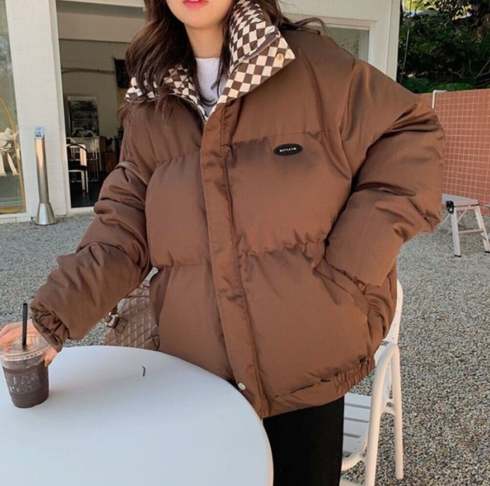 チェック柄の襟と前立てがアクセントになる、中綿入りのパファージャケット。