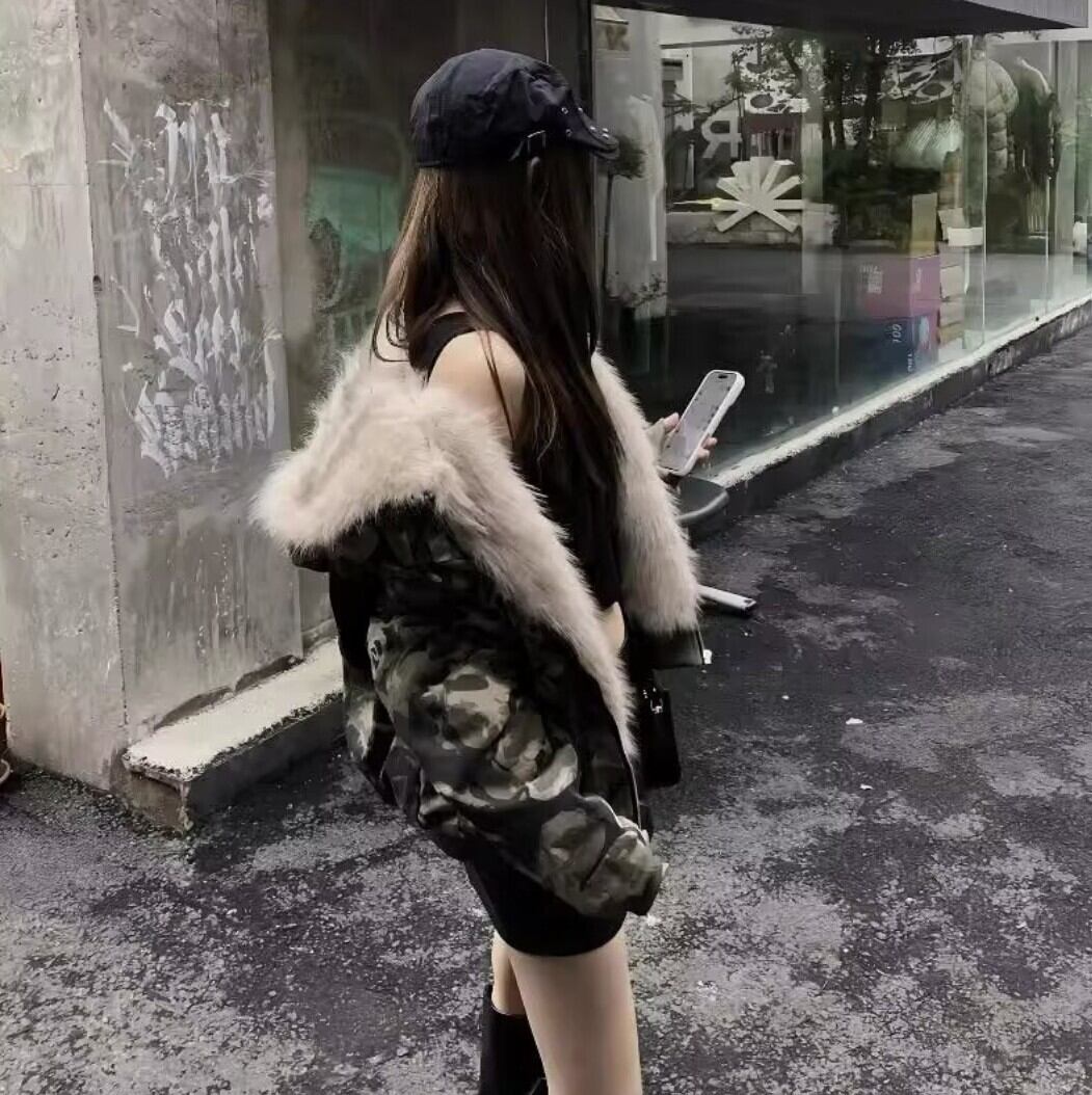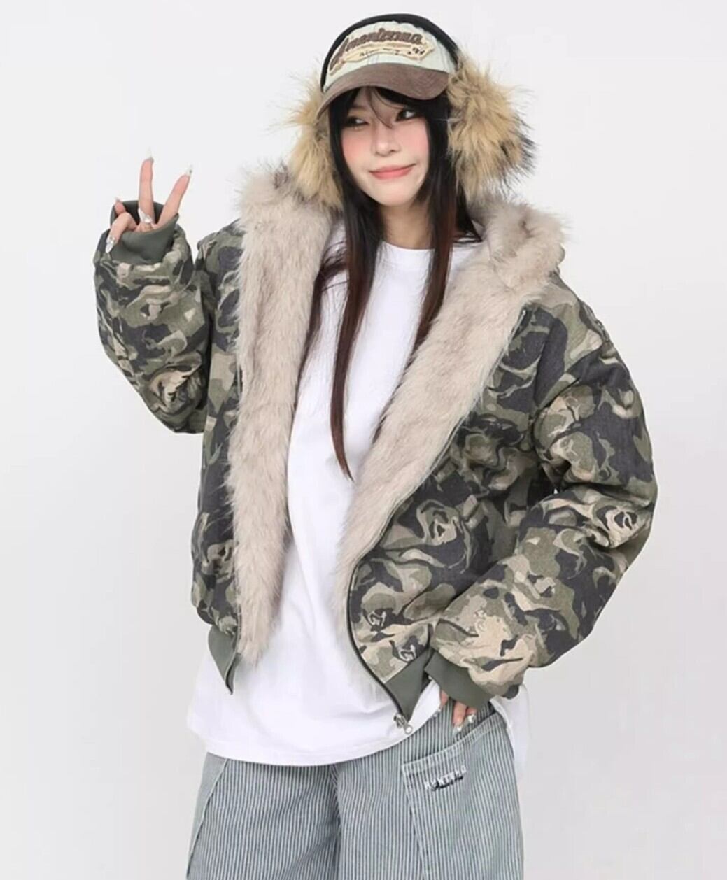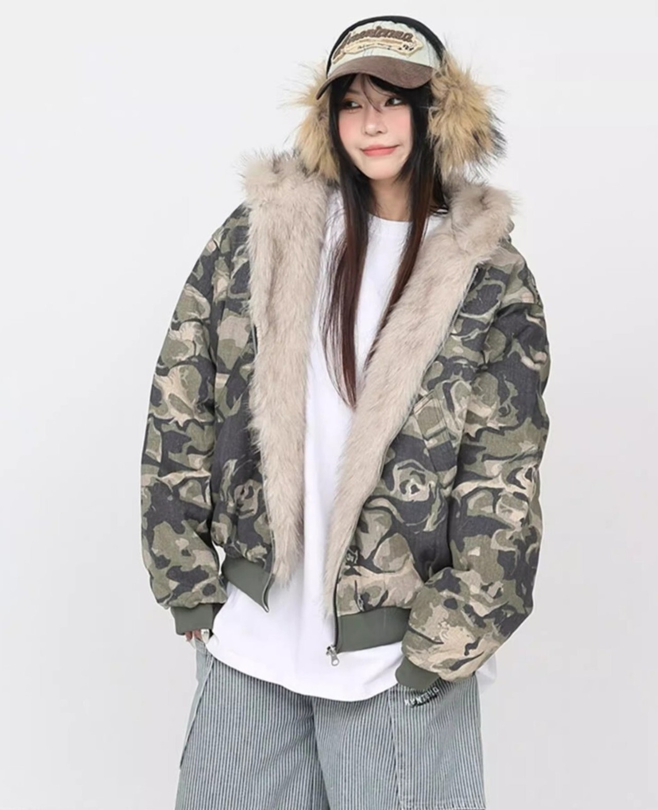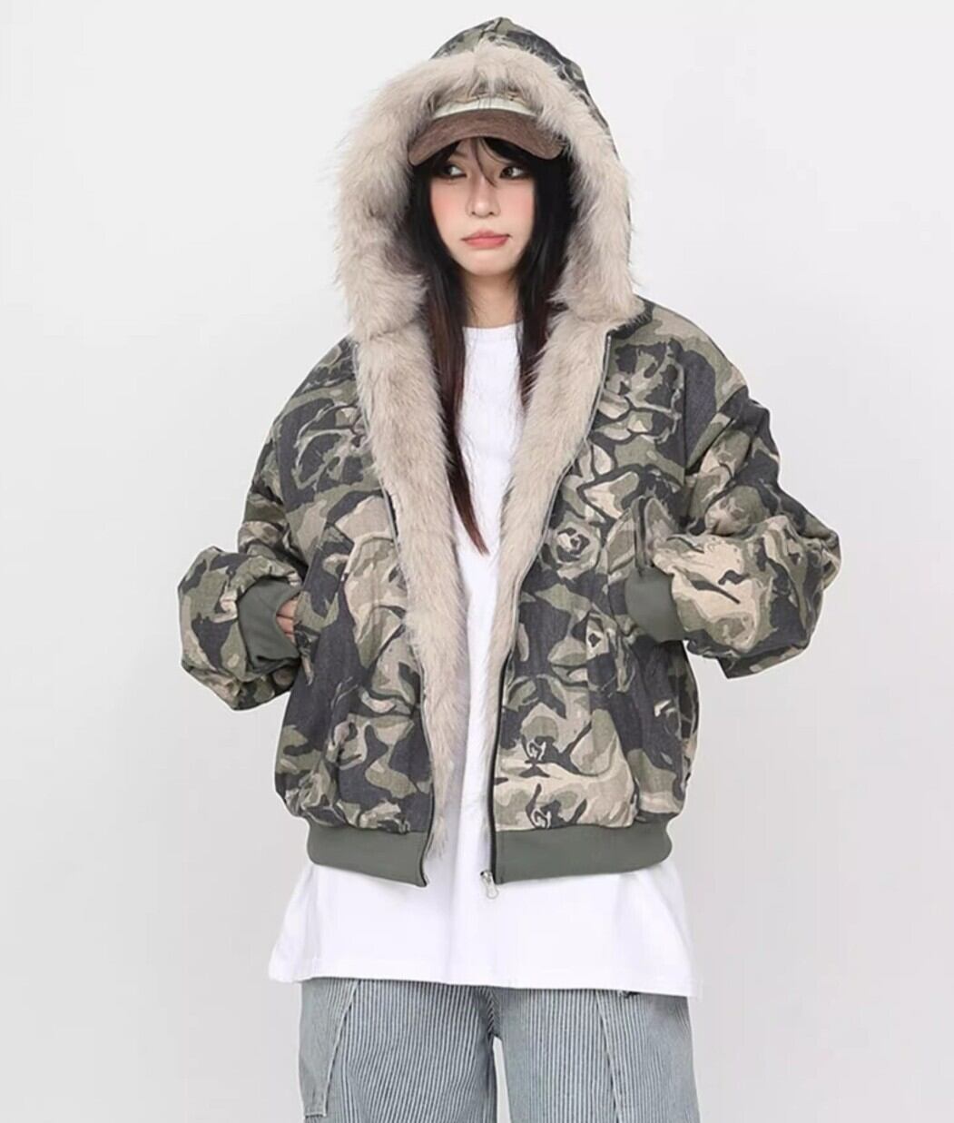 ・カモフラ柄×ファーフードで存在感が出る