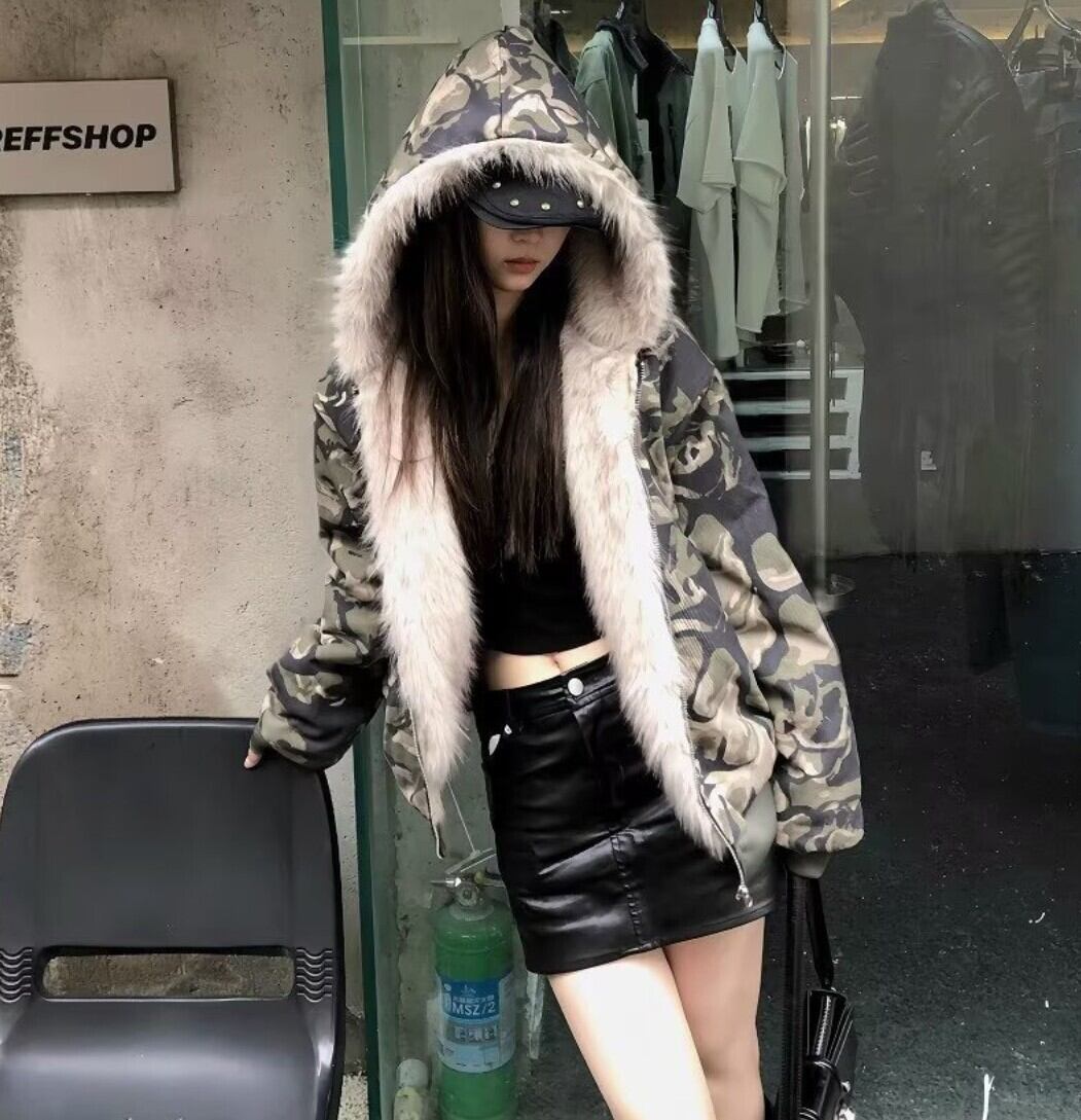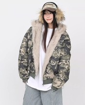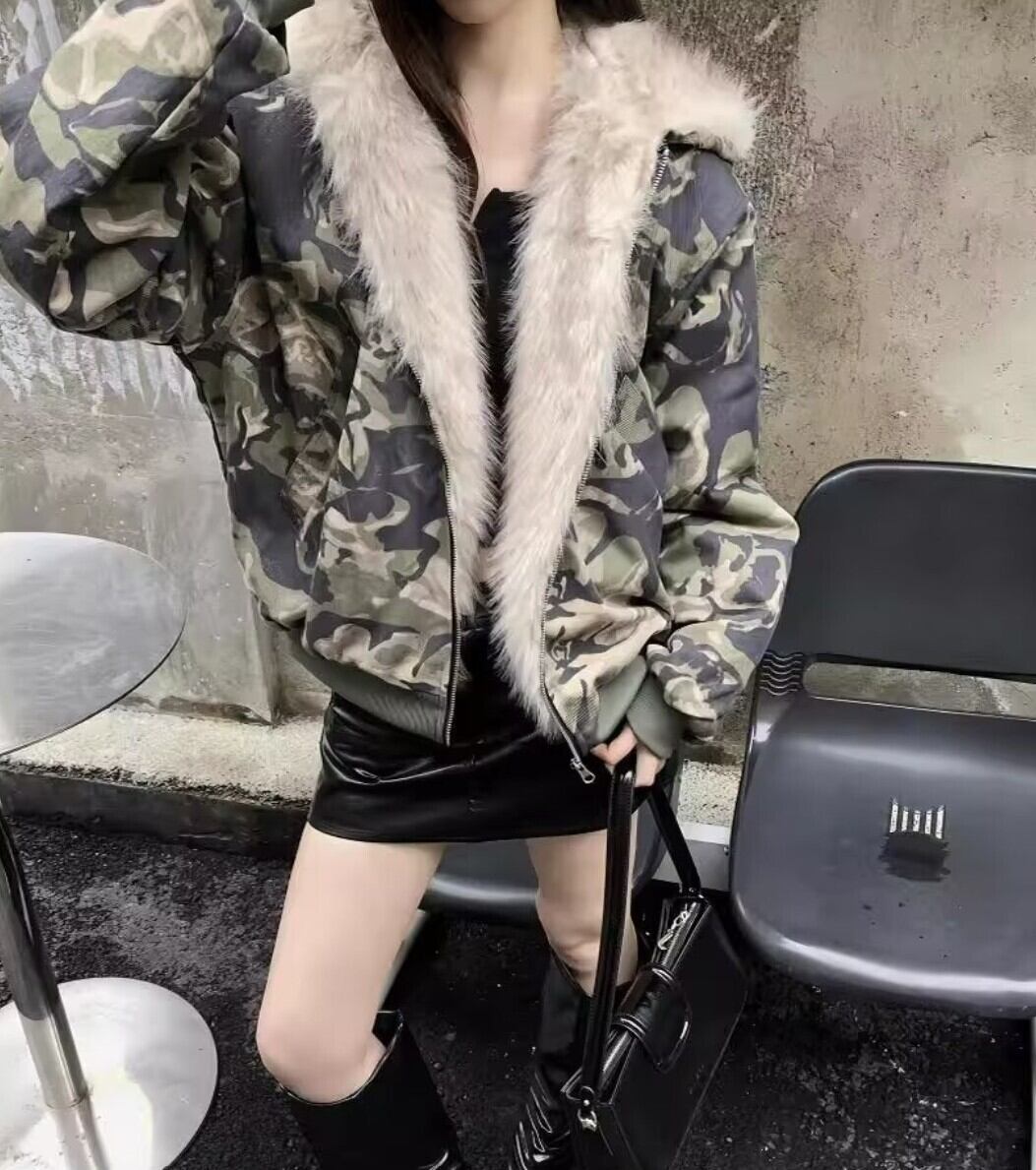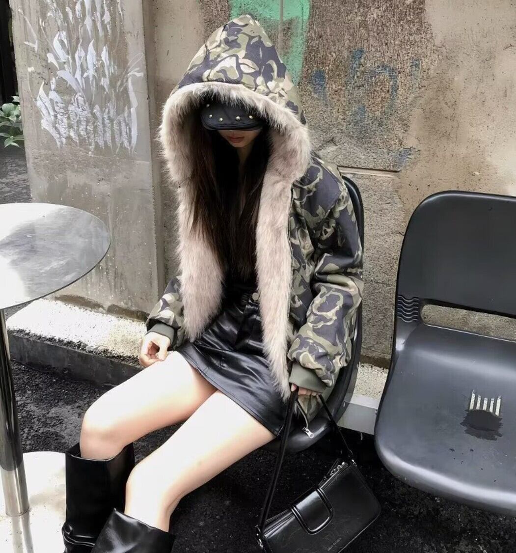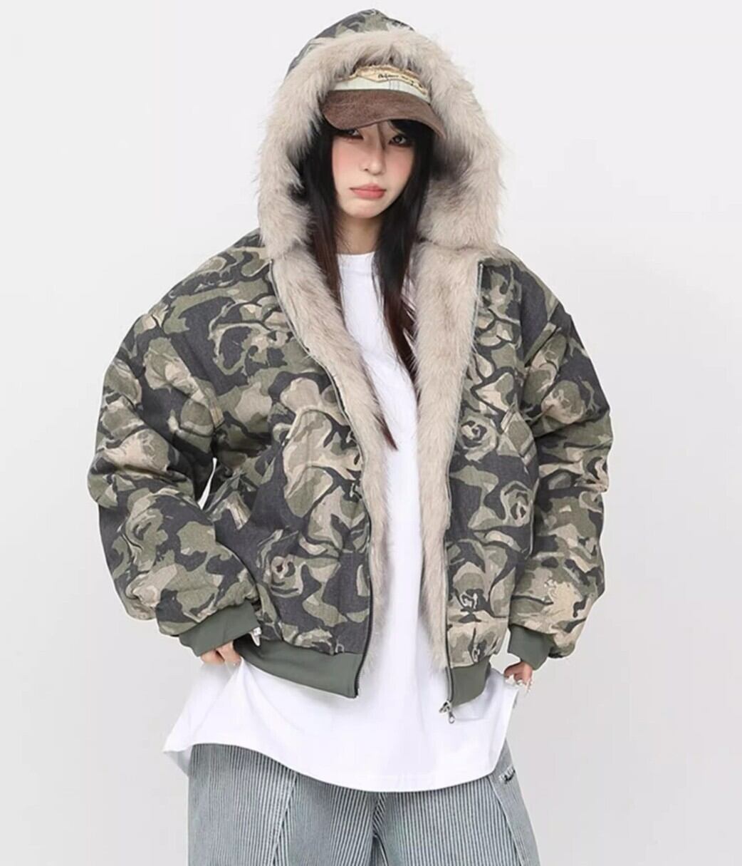 カモフラ ファーフード中綿ショートジャケット / 韓国モード