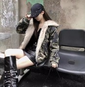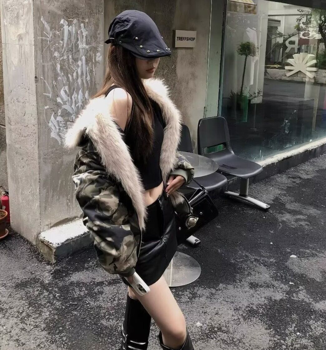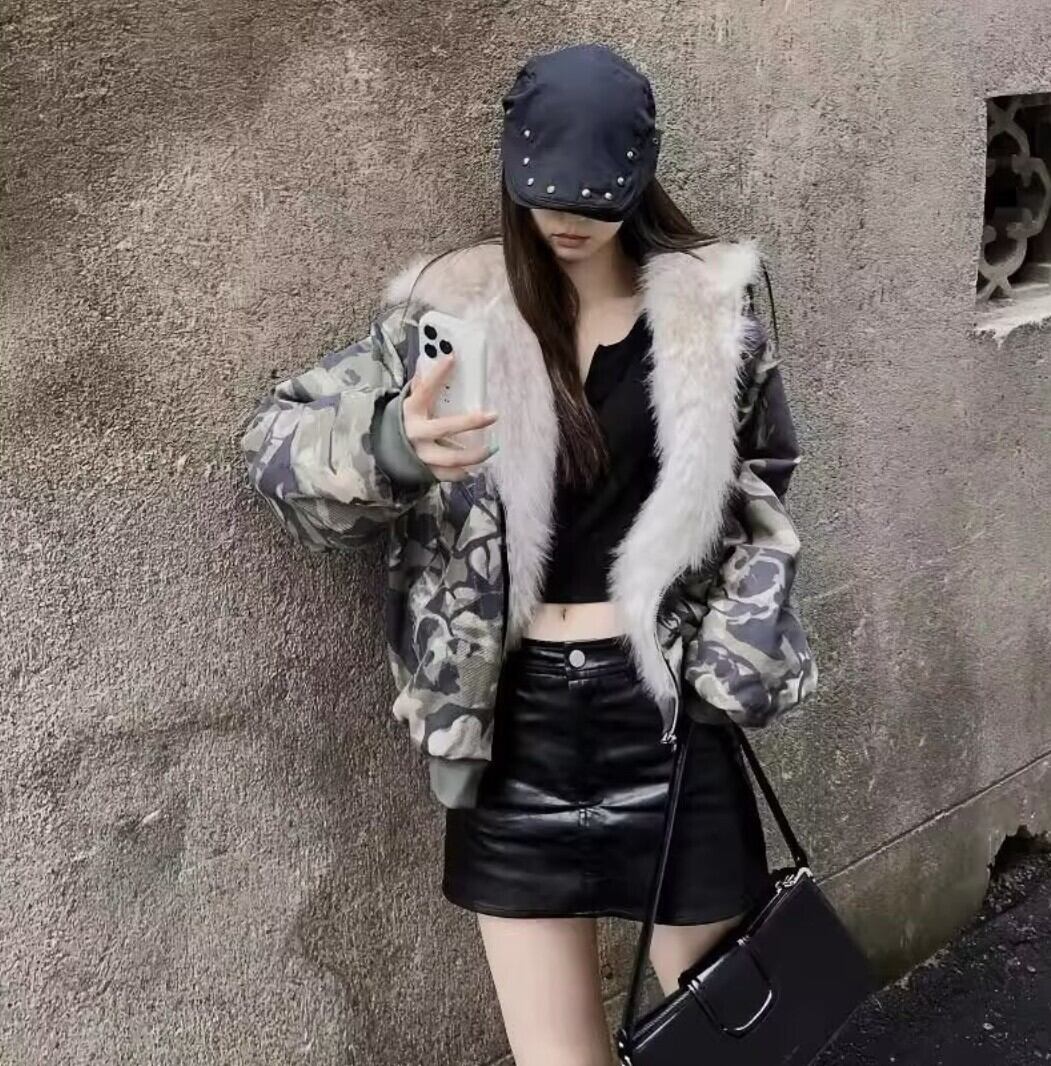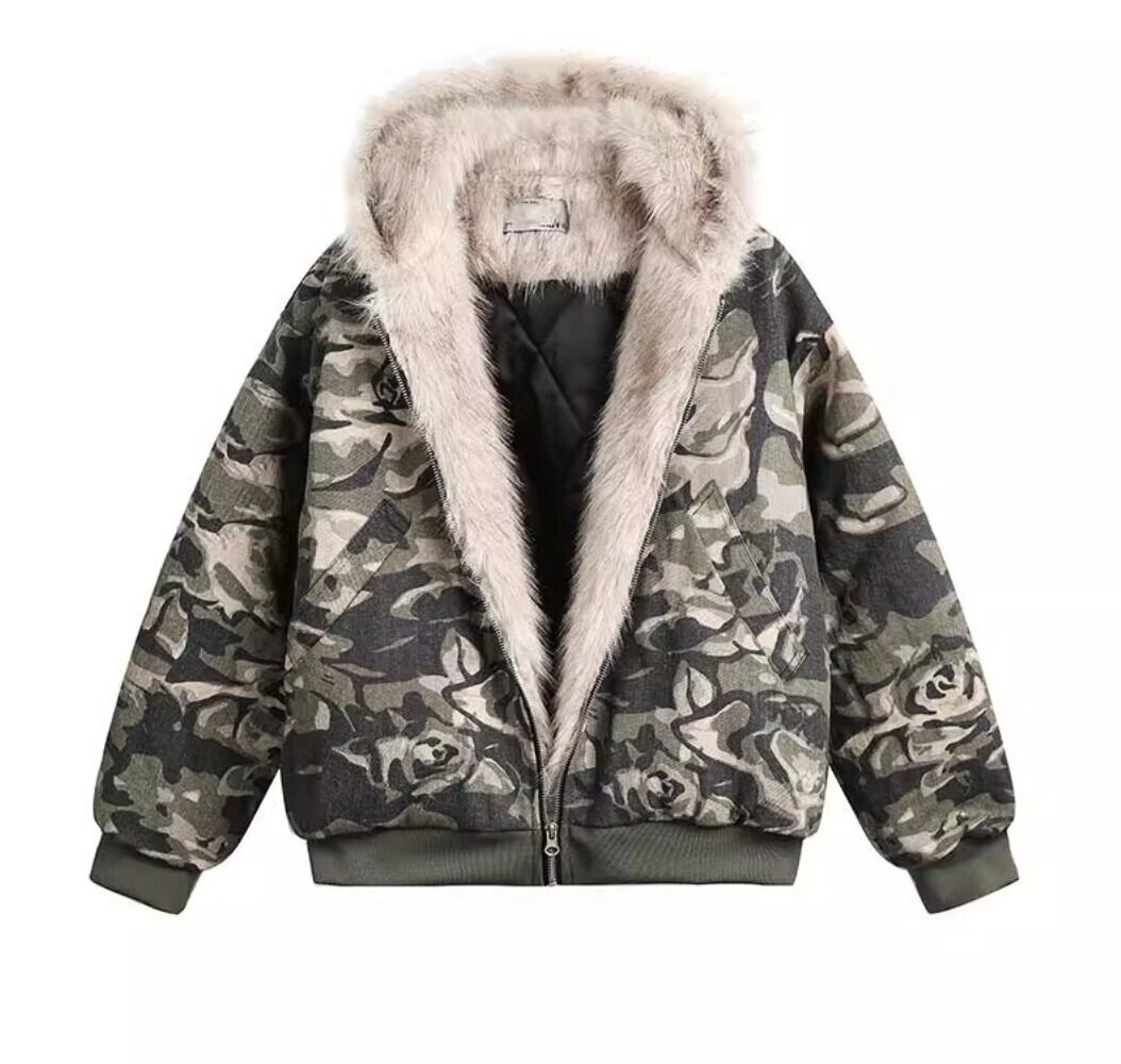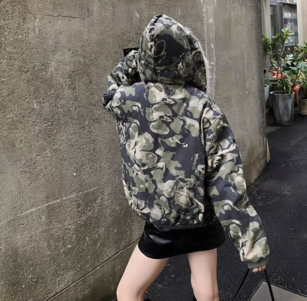 カモフラ ファーフード中綿ショートジャケット / 韓国モード