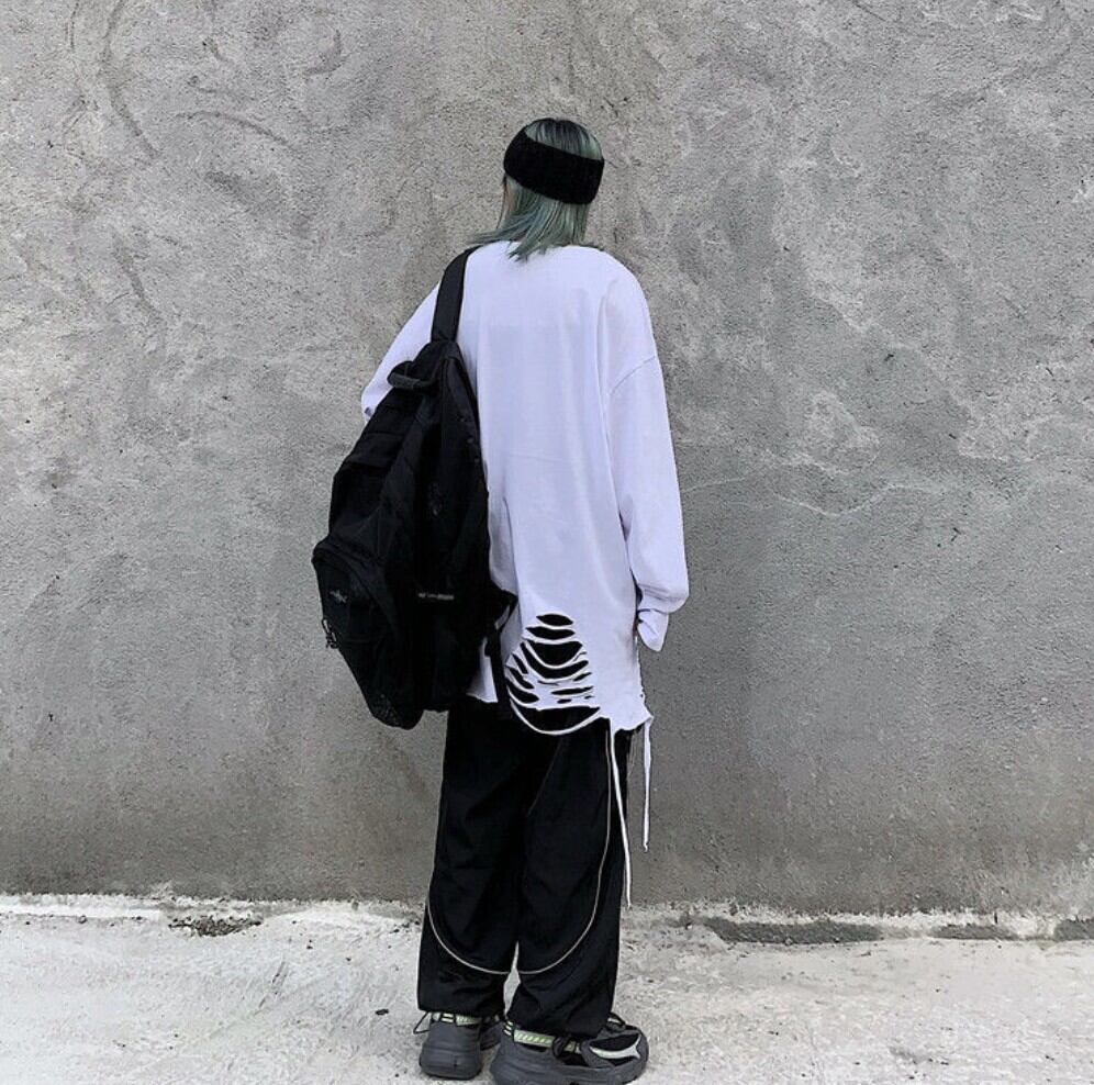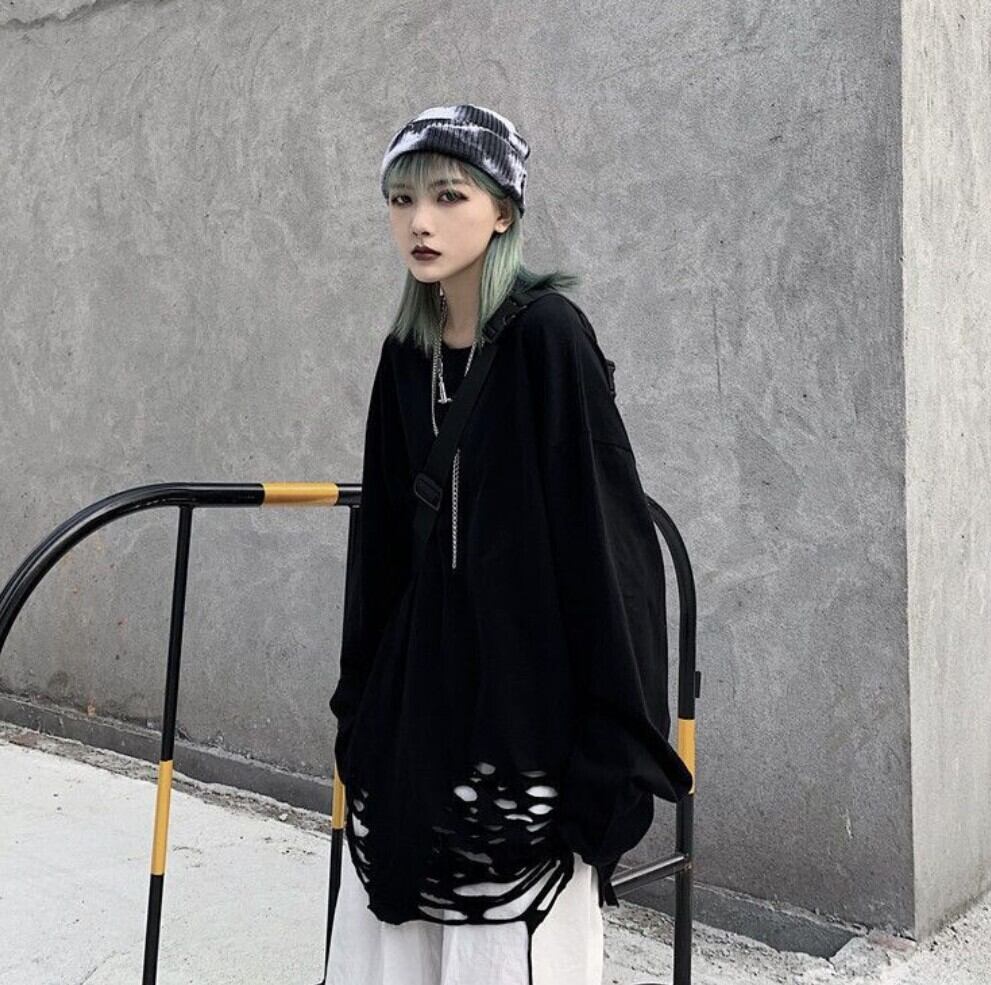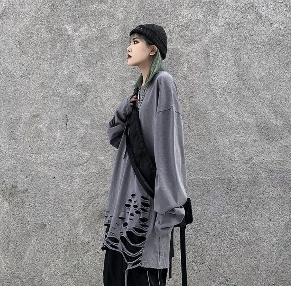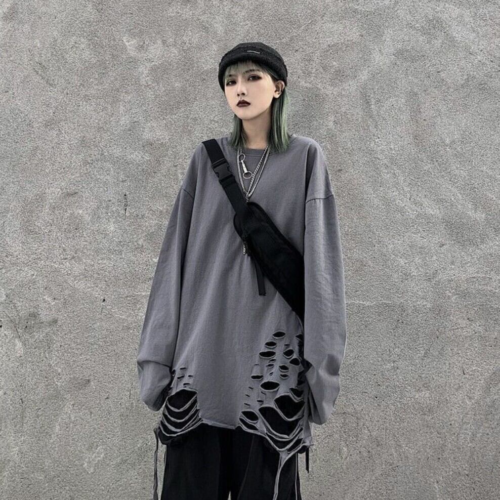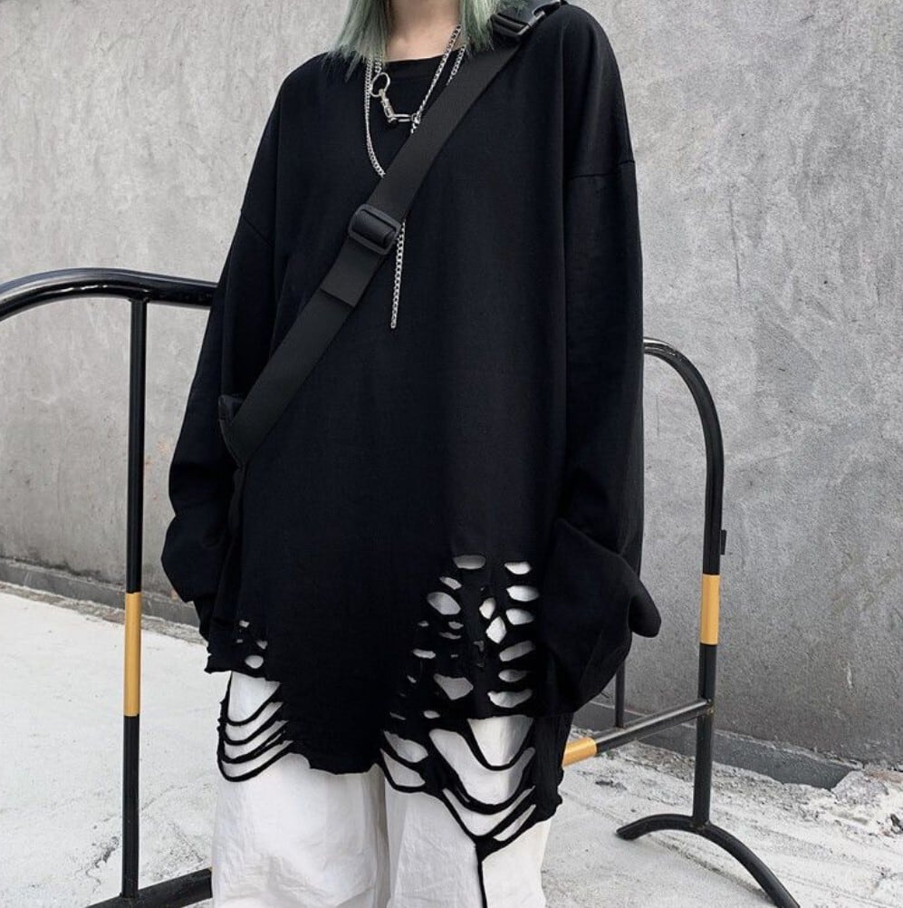 ダメージ加工 ビッグシルエットロングスリーブTシャツ / 韓国ファッション