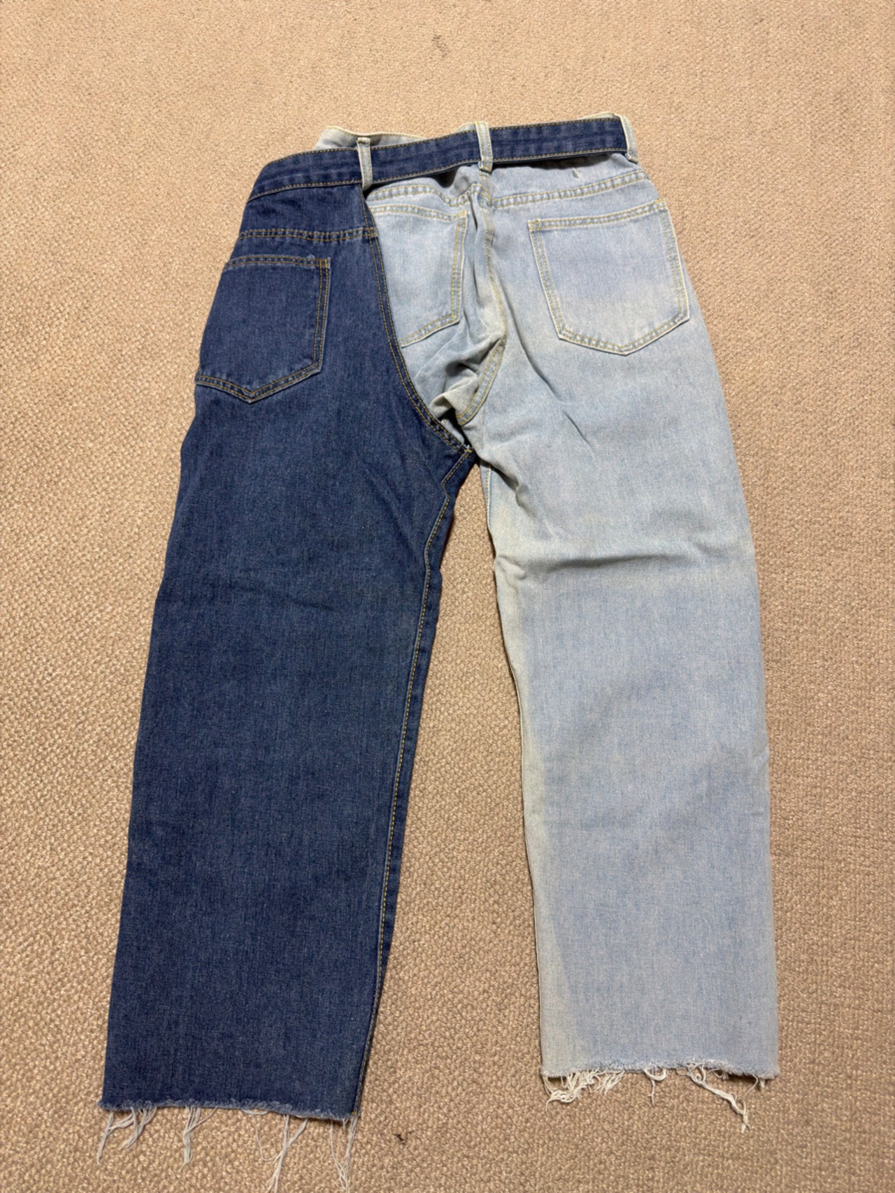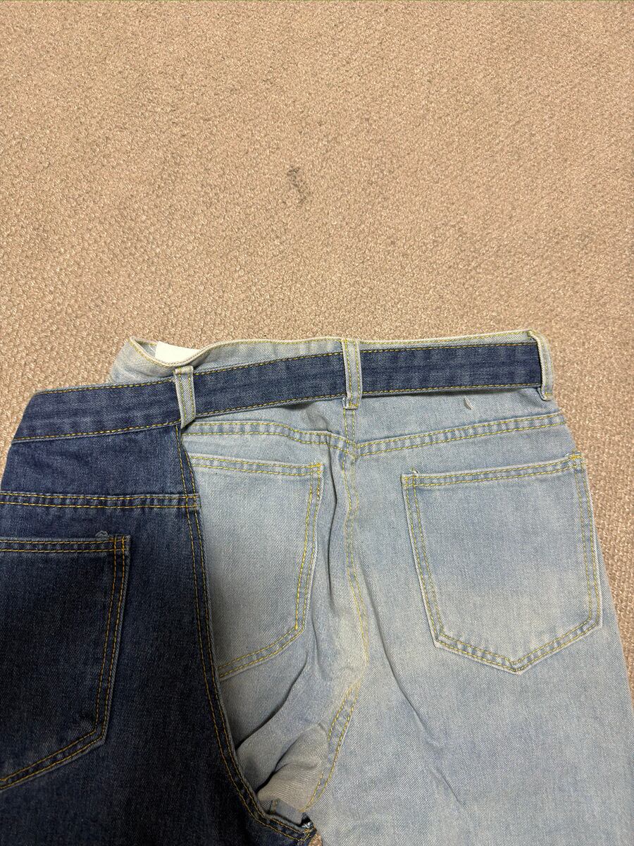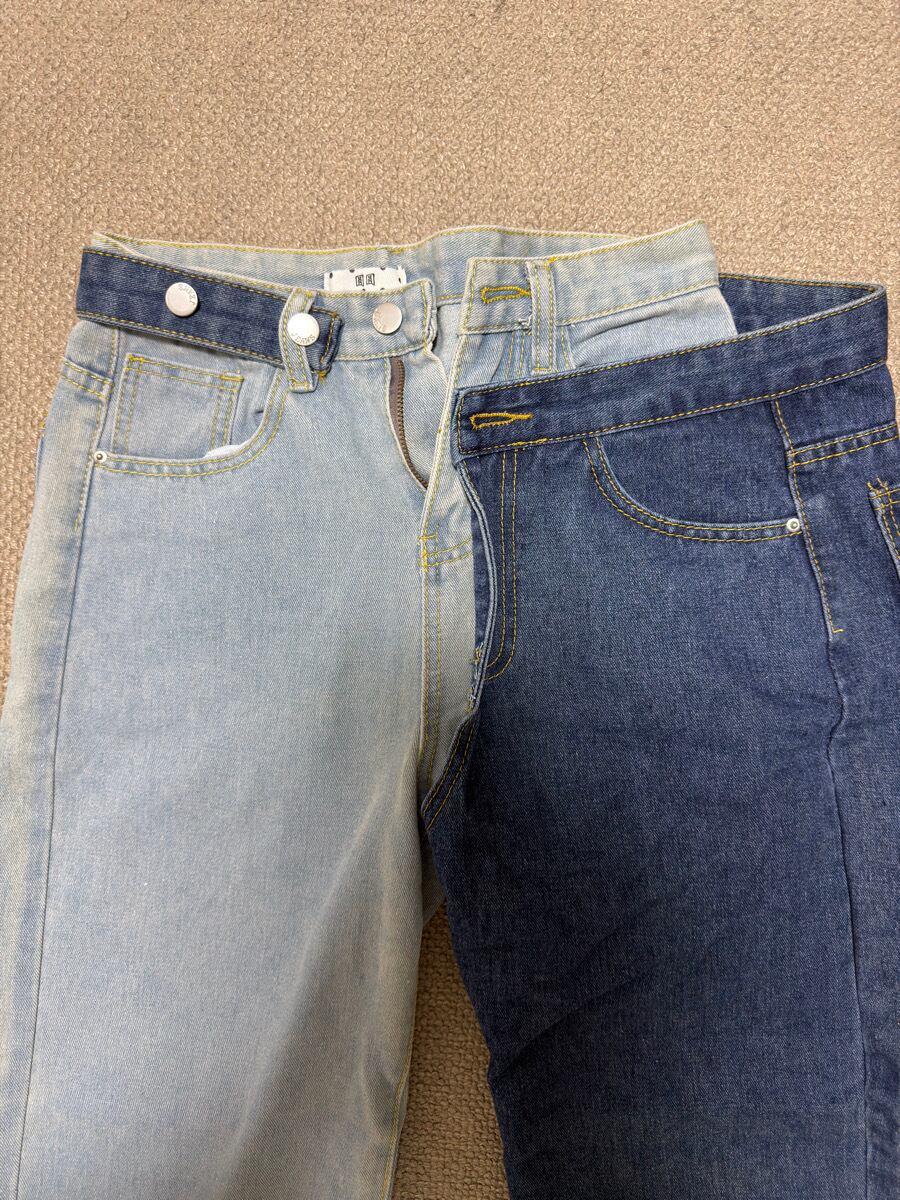 ライトブルーとインディゴを切り替えた、バイカラーデザインのデニムパンツ。