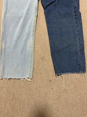 裾はラフなカットオフ仕上げで、デニム特有の重さを抑えつつ、抜け感のあるバランスにまとまります。