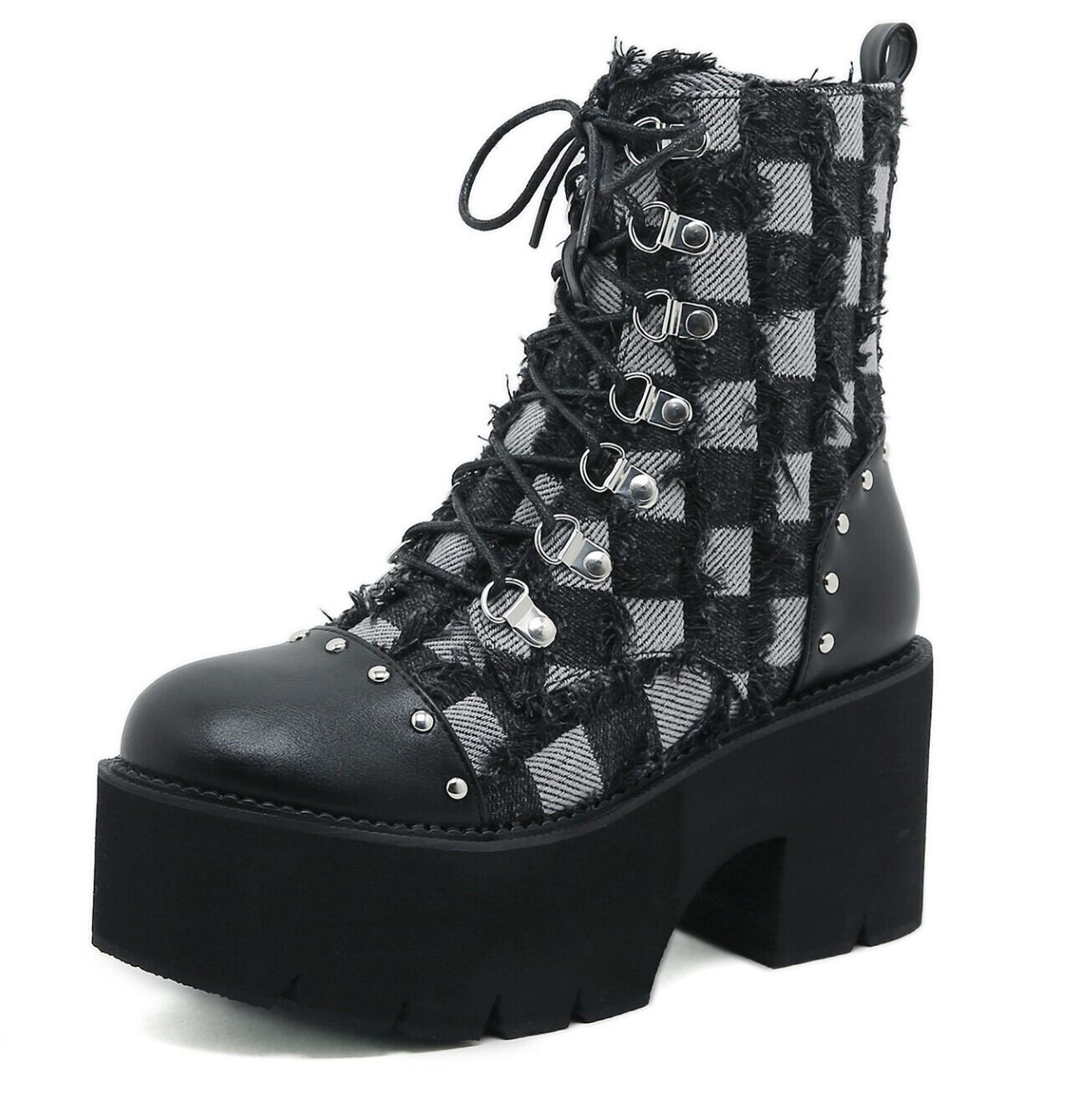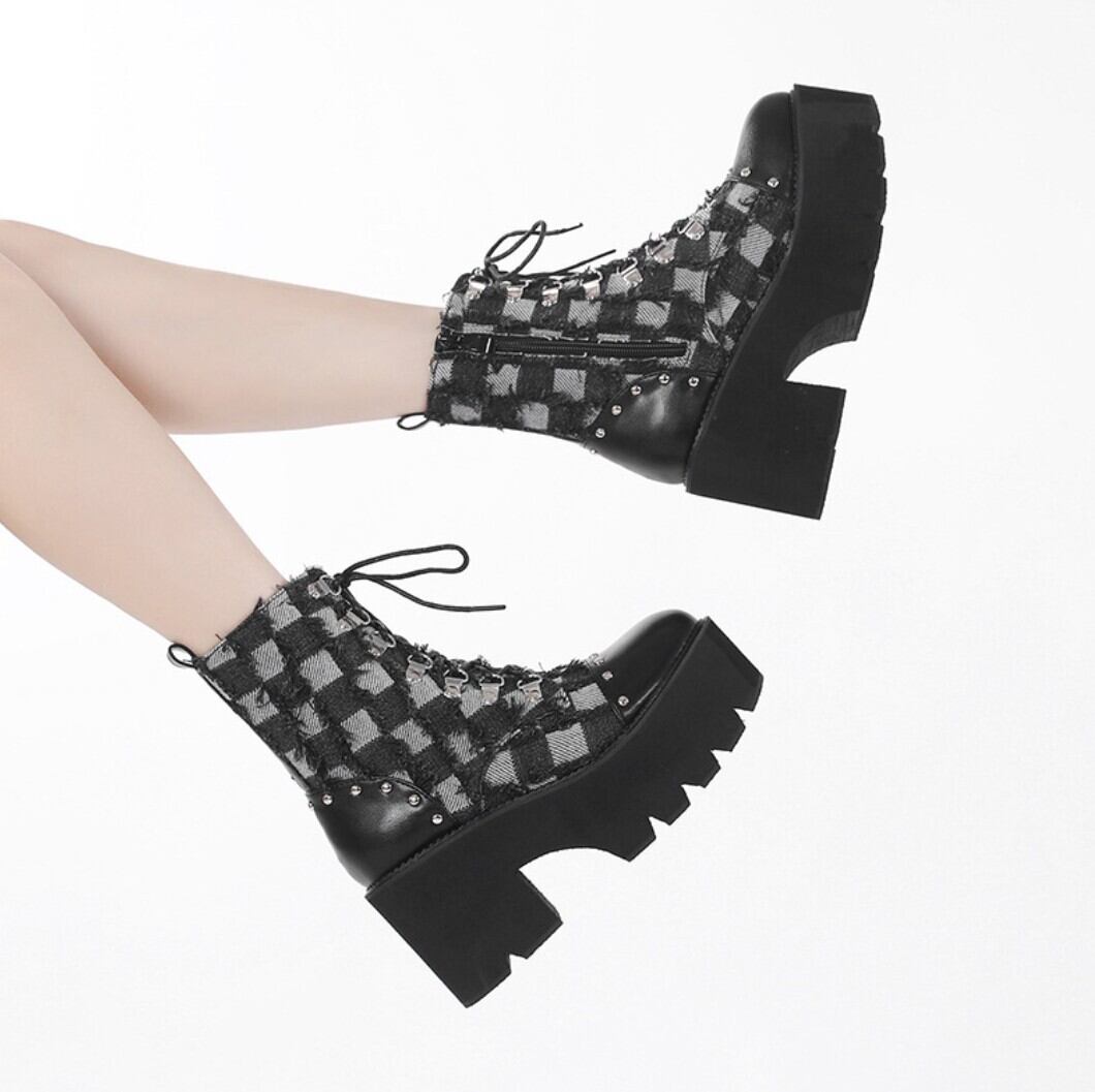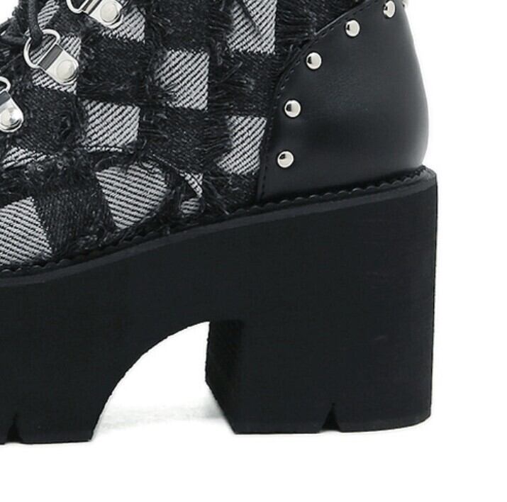 モノトーンチェック スタッズ厚底レースアップブーツ / 韓国モード