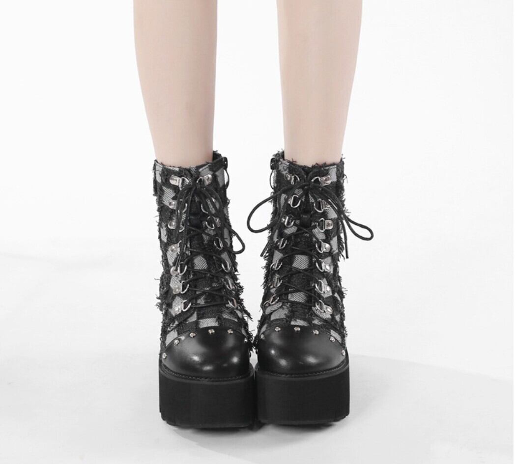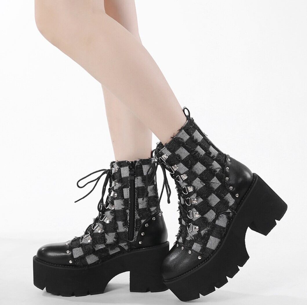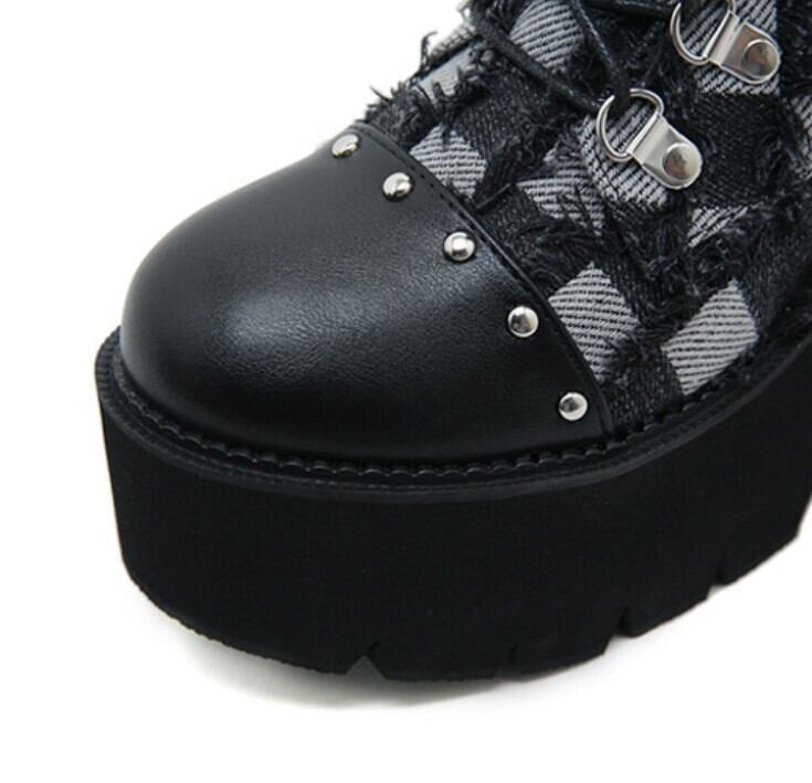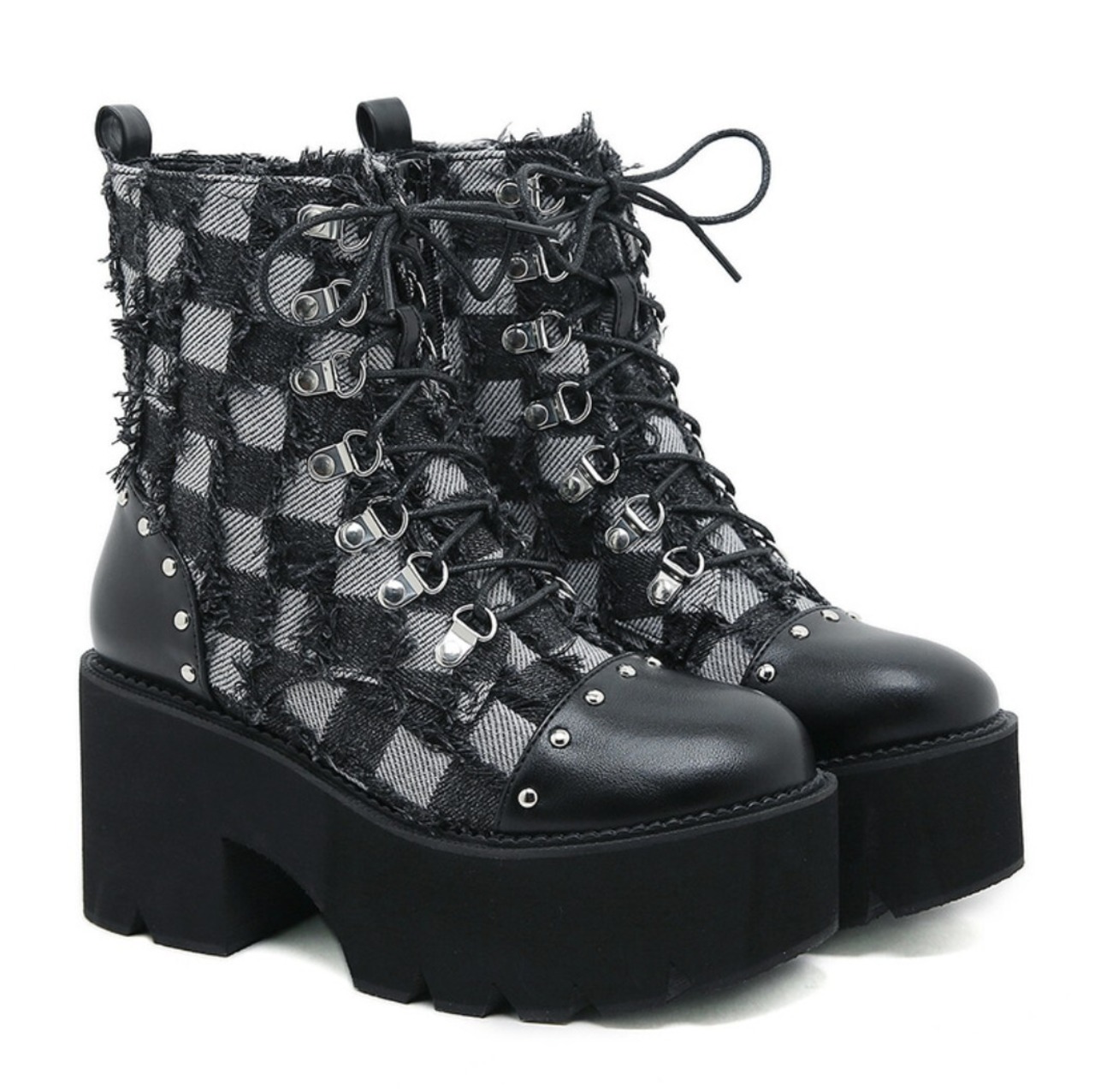 モノトーンチェック スタッズ厚底レースアップブーツ / 韓国モード