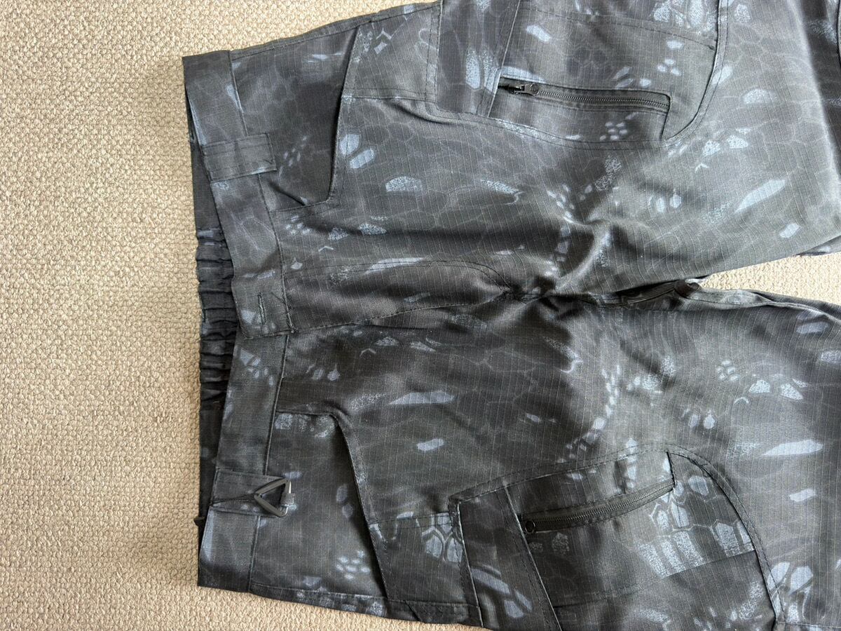 立体カーゴポケットとジップディテールを効かせつつ、全体は黒ベースでまとめているため、柄物でも取り入れやすい一本です。