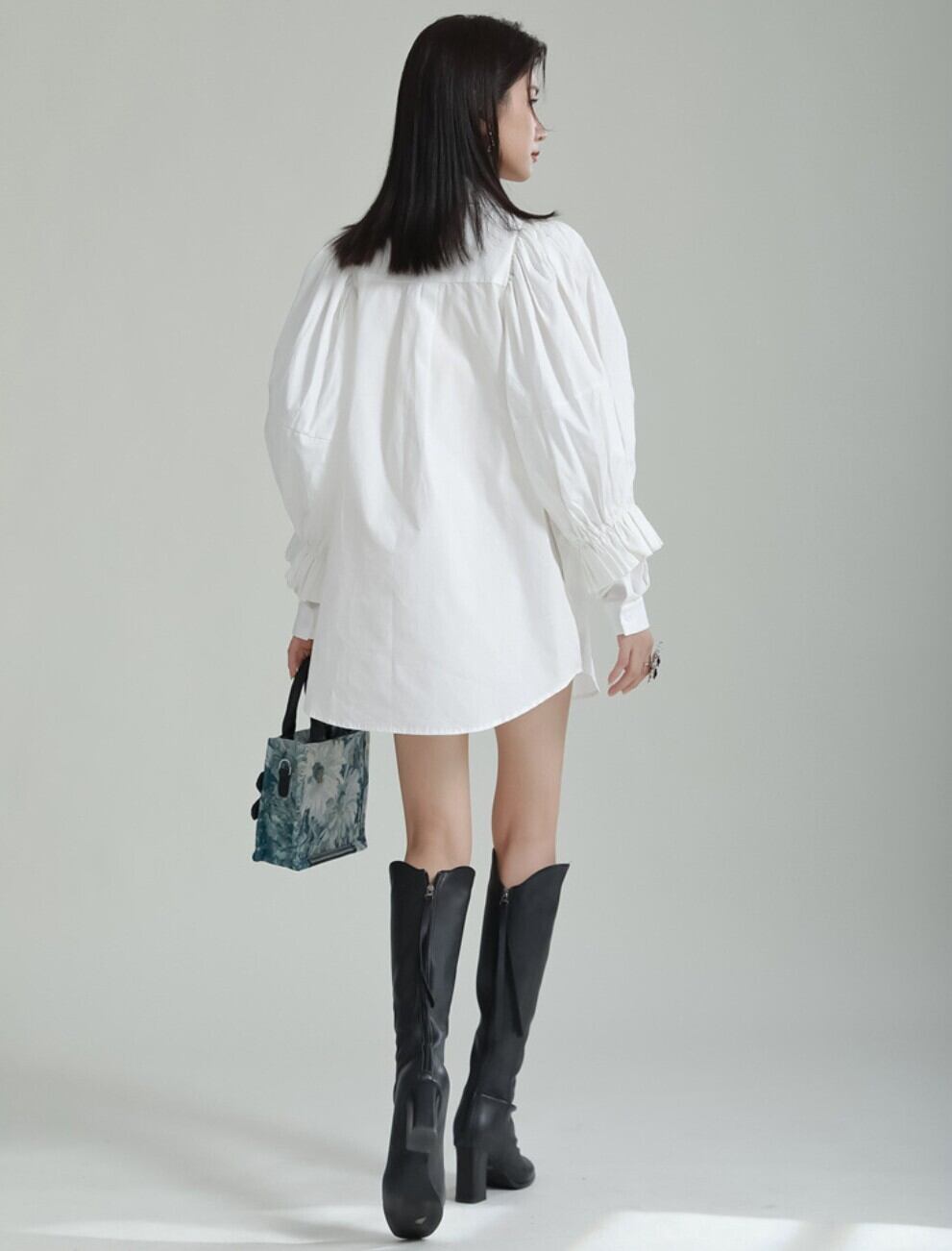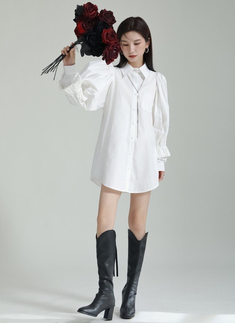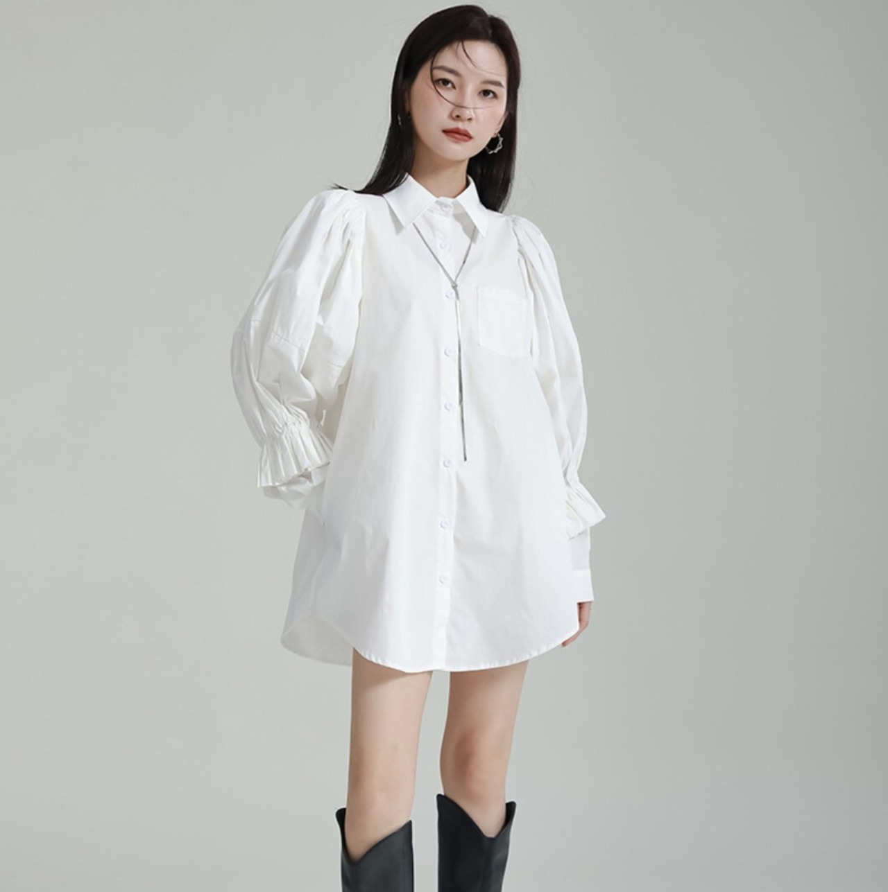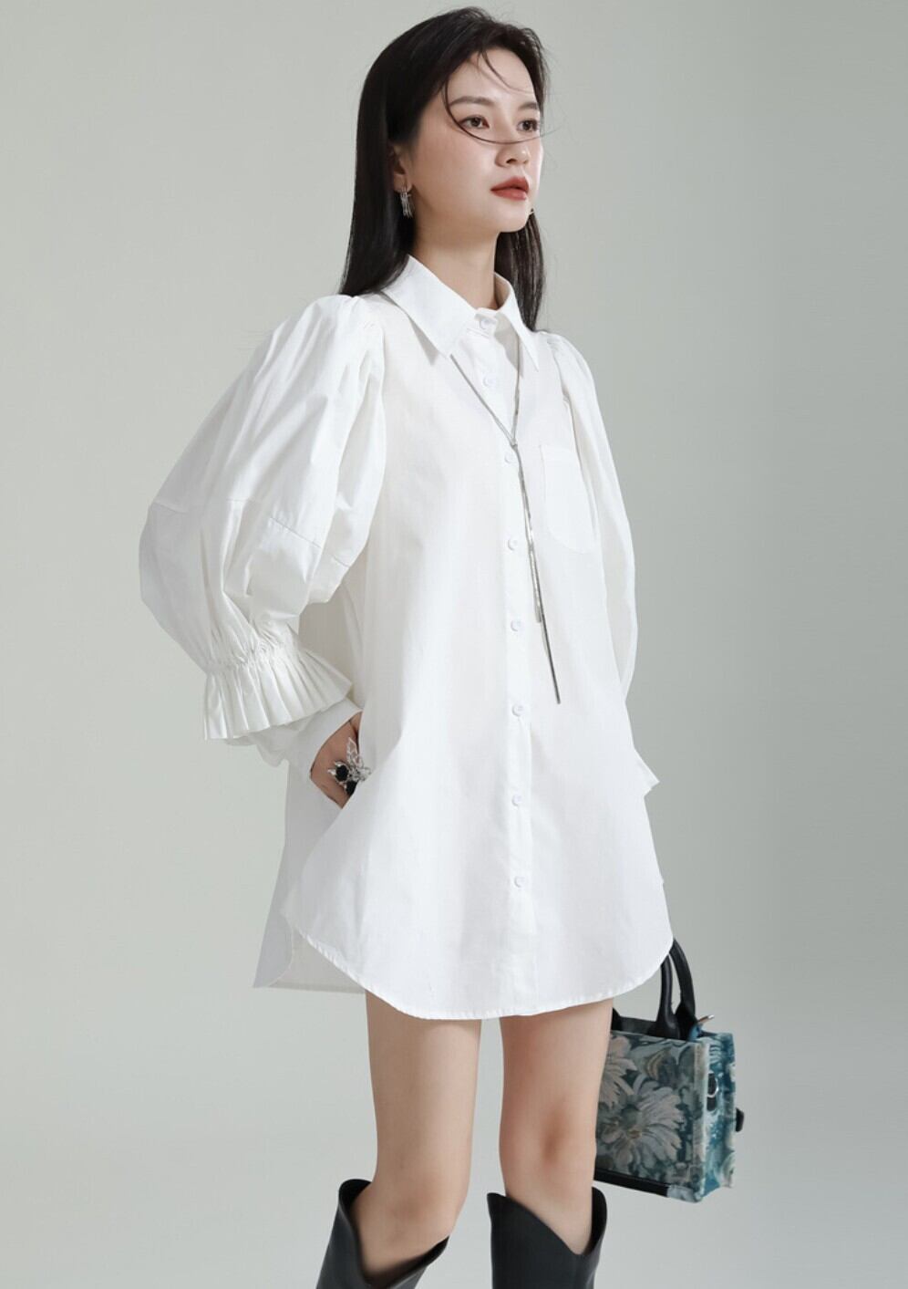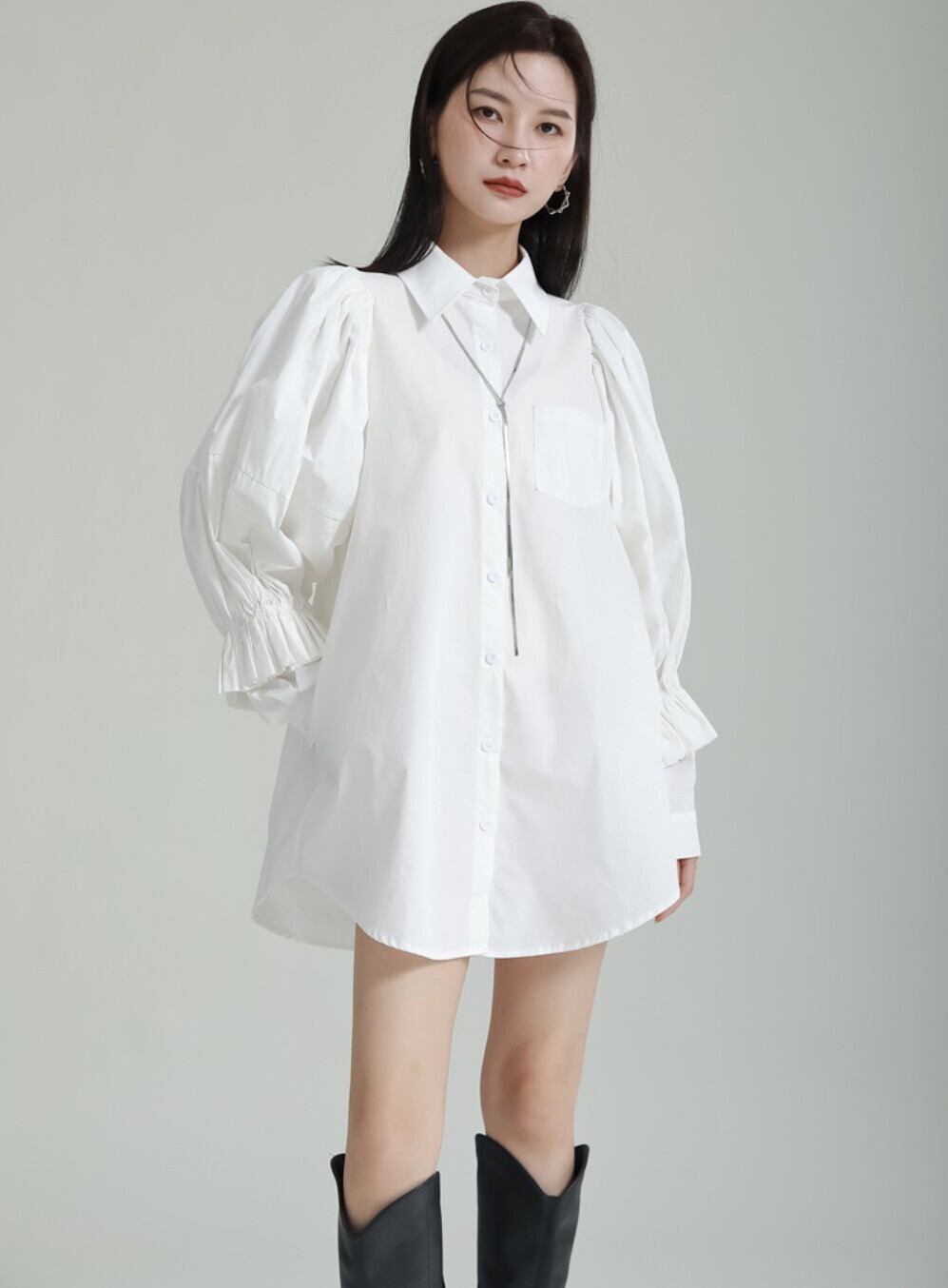 【即発送/送料無料】パフスリーブ ロングシャツワンピース ホワイト / 韓国モード