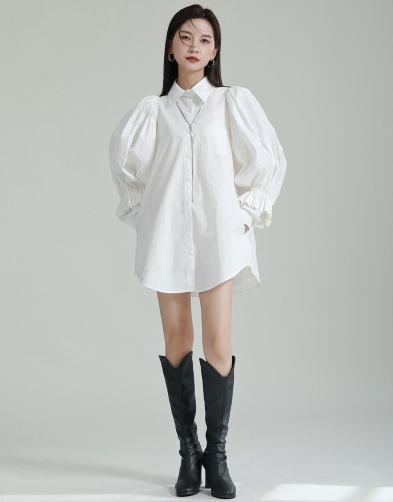 ロングブーツや厚底シューズと合わせやすく、韓国ファッションやモード寄りのスタイリングにも取り入れやすい一着です。