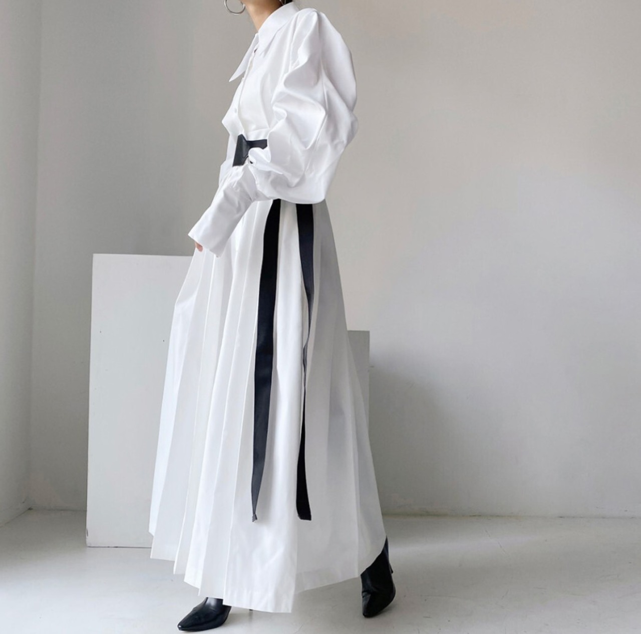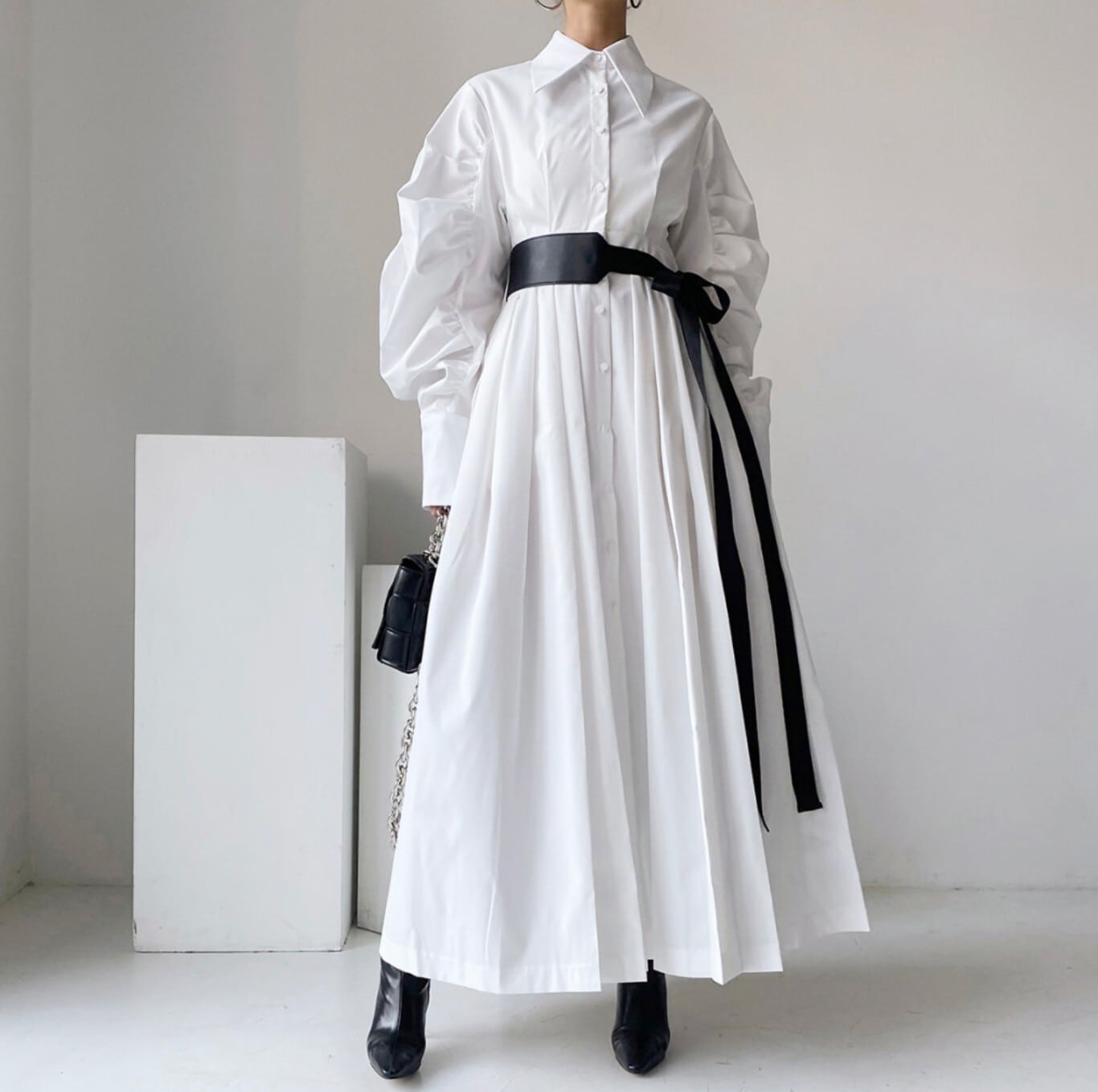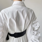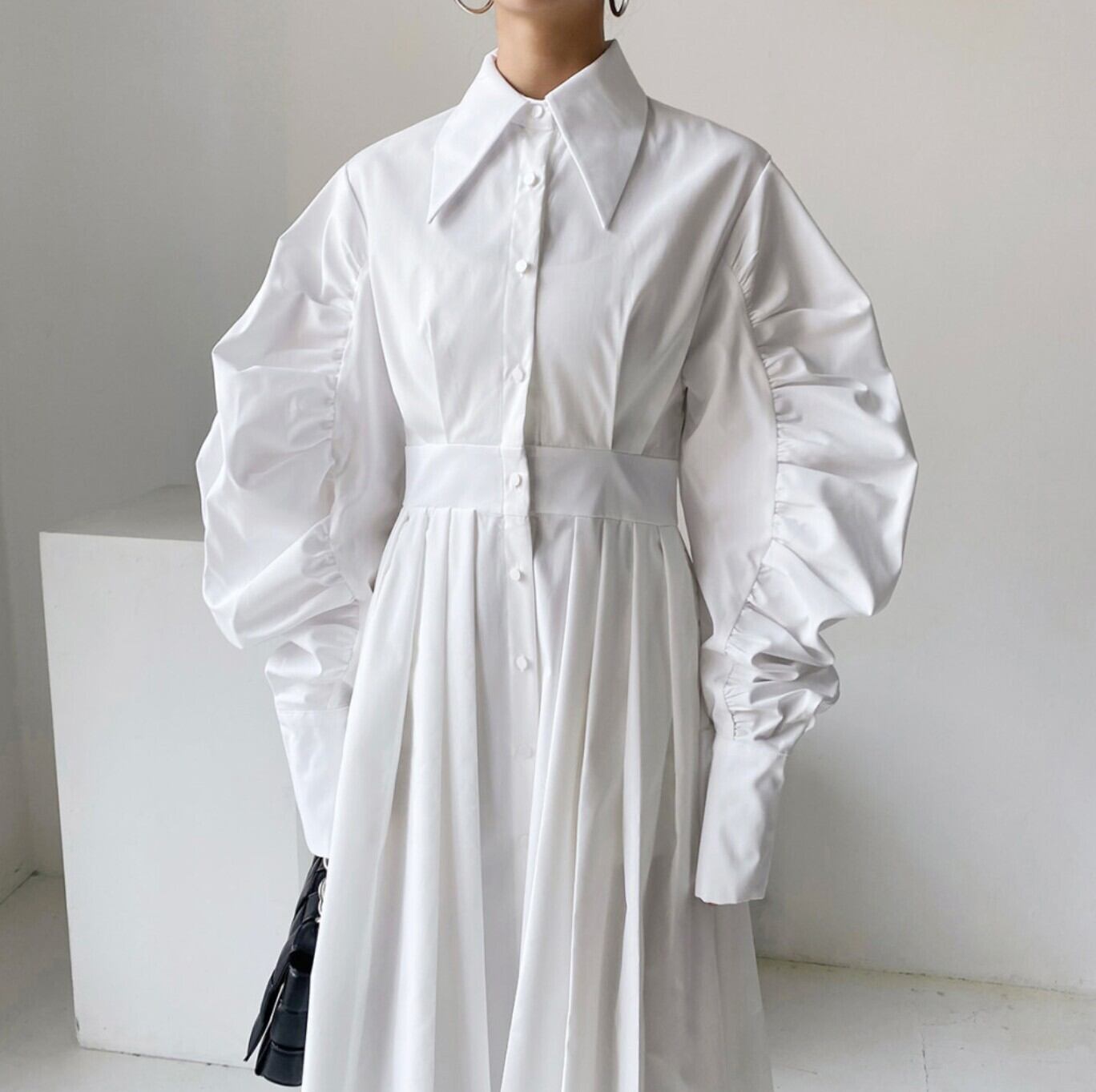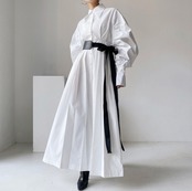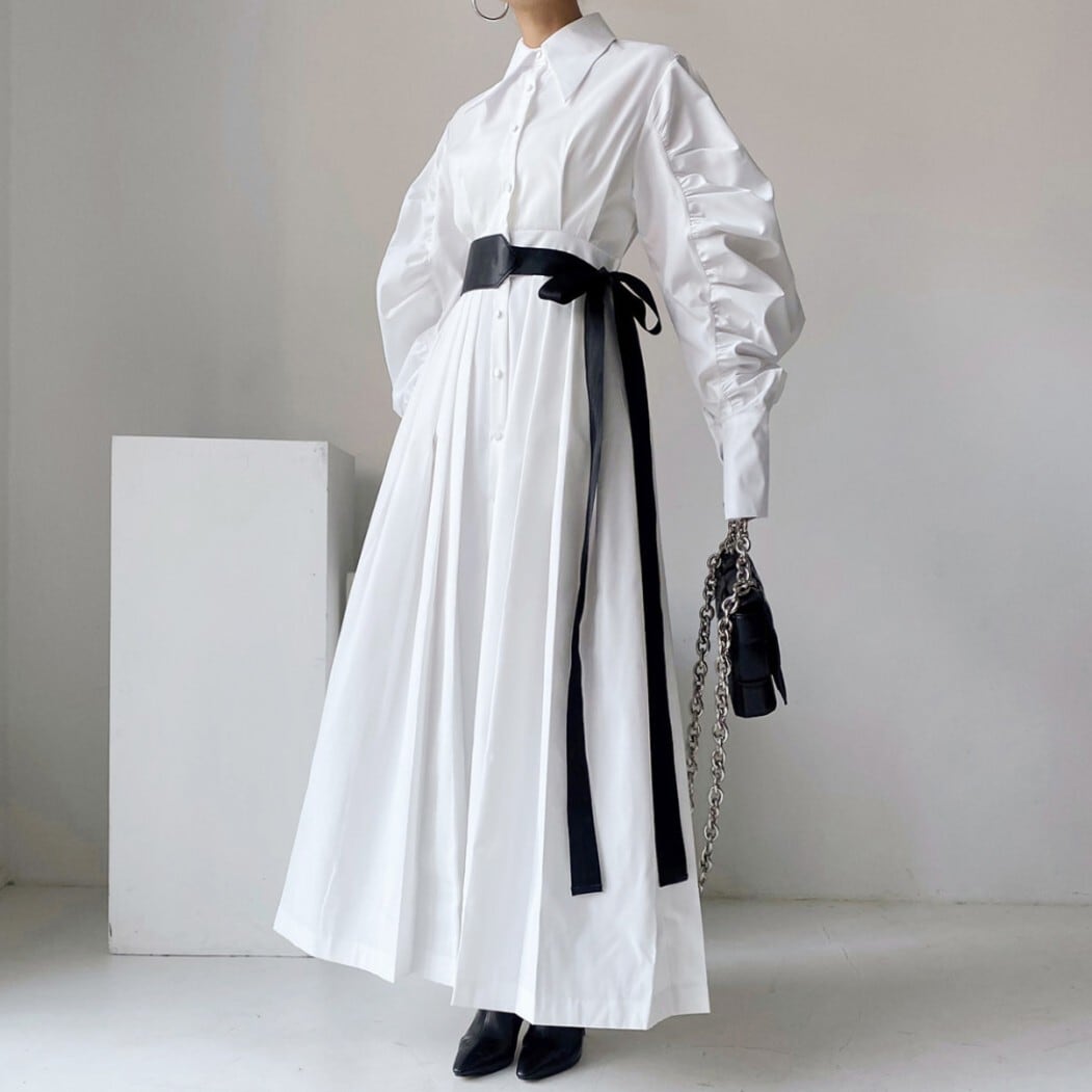 【即発送/送料無料】ベルト付きパフスリーブ シャツロングワンピース ホワイト / 韓国モード