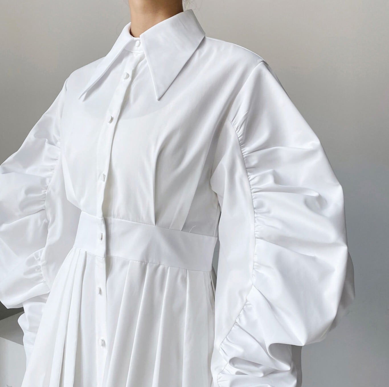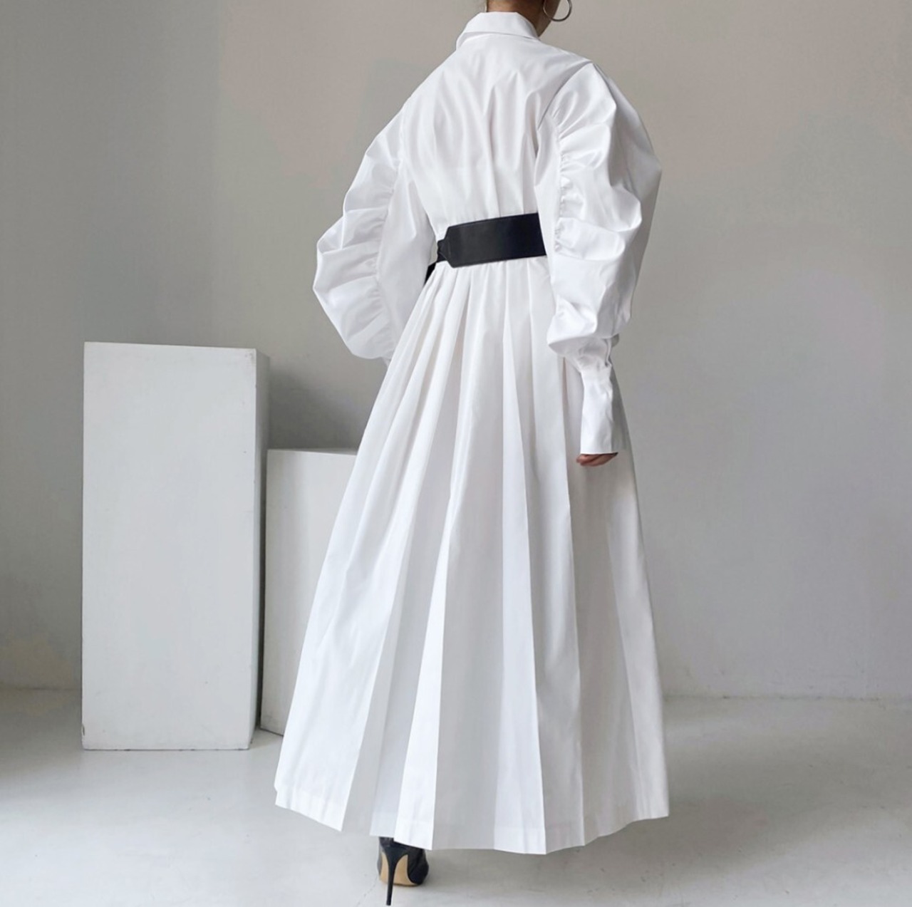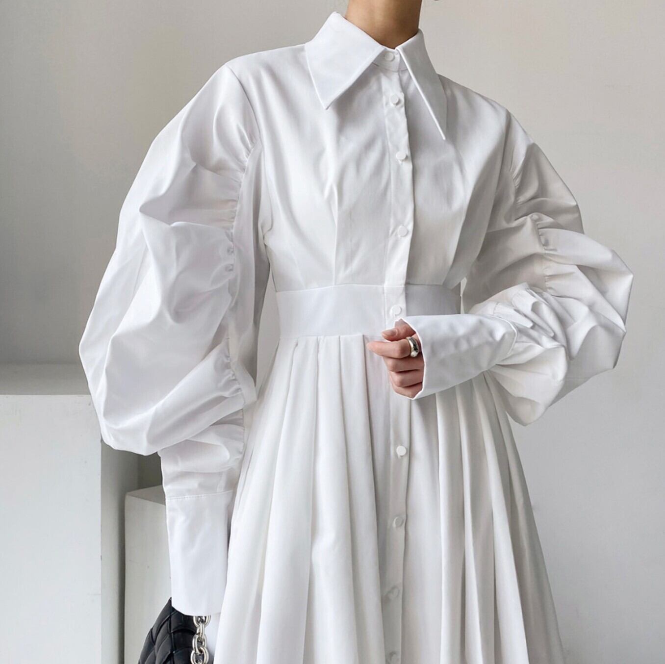【即発送/送料無料】ベルト付きパフスリーブ シャツロングワンピース ホワイト / 韓国モード