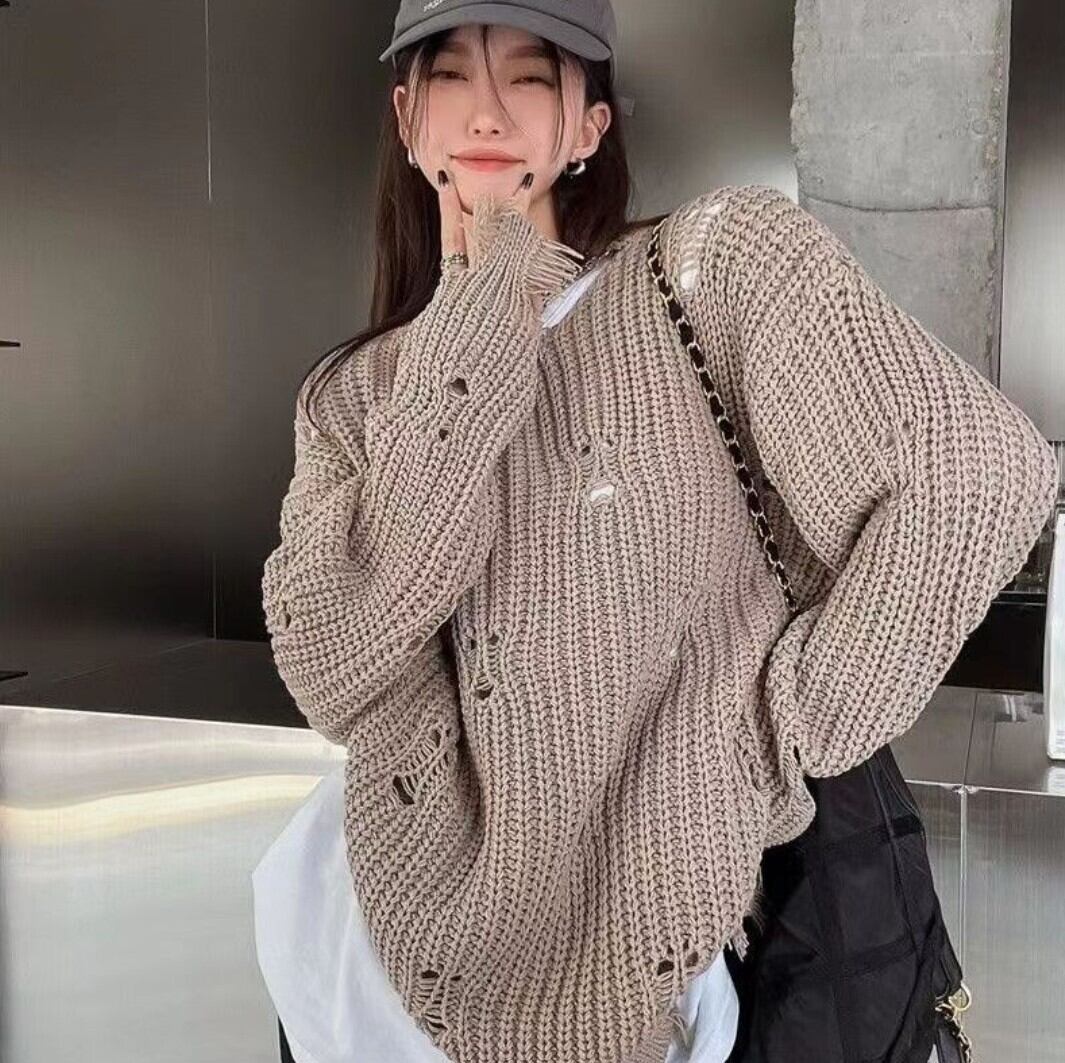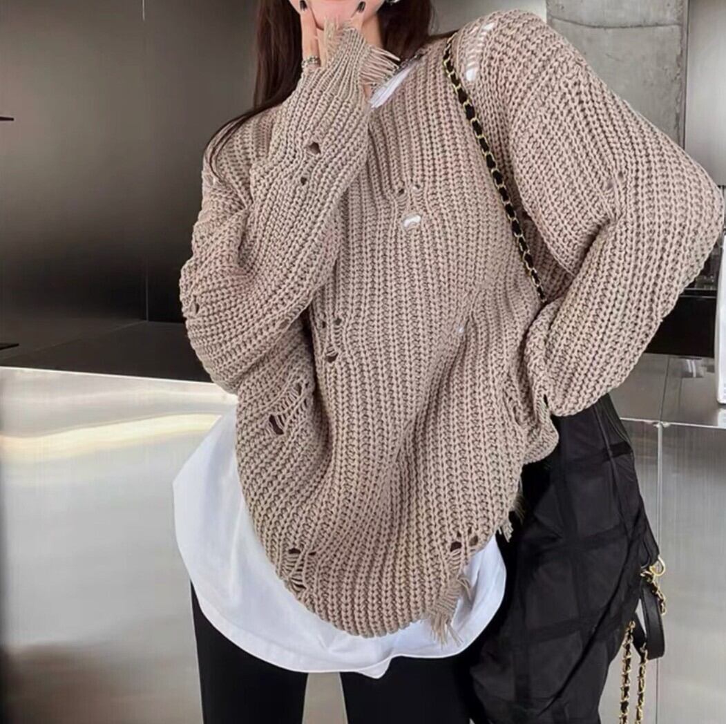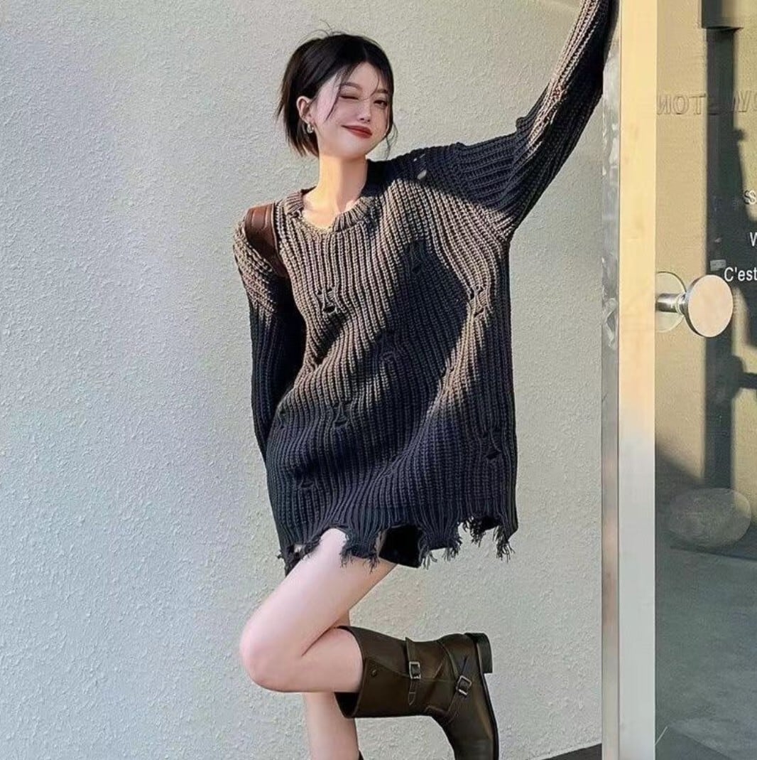 ダメージ加工 ざっくりオーバーサイズニット カーキ/ブラック / 韓国モード