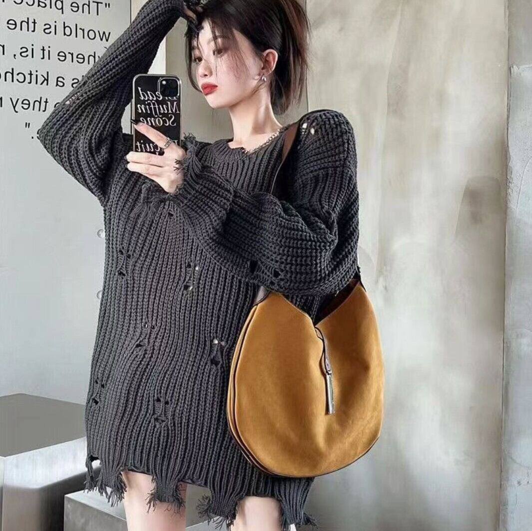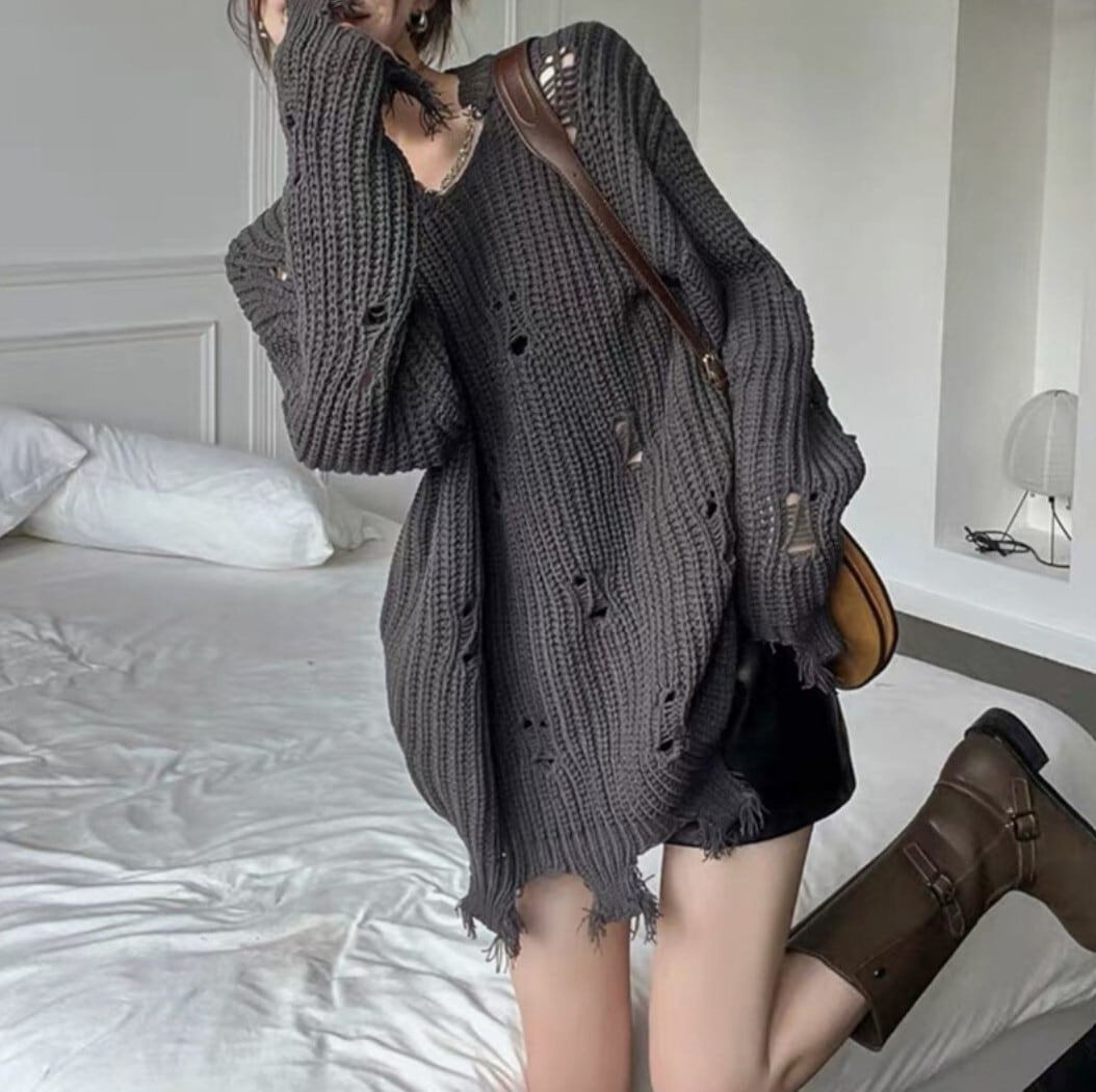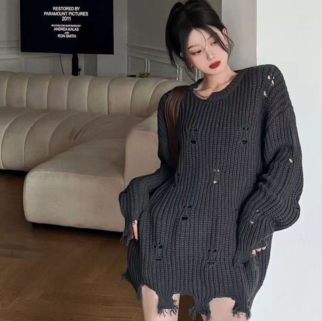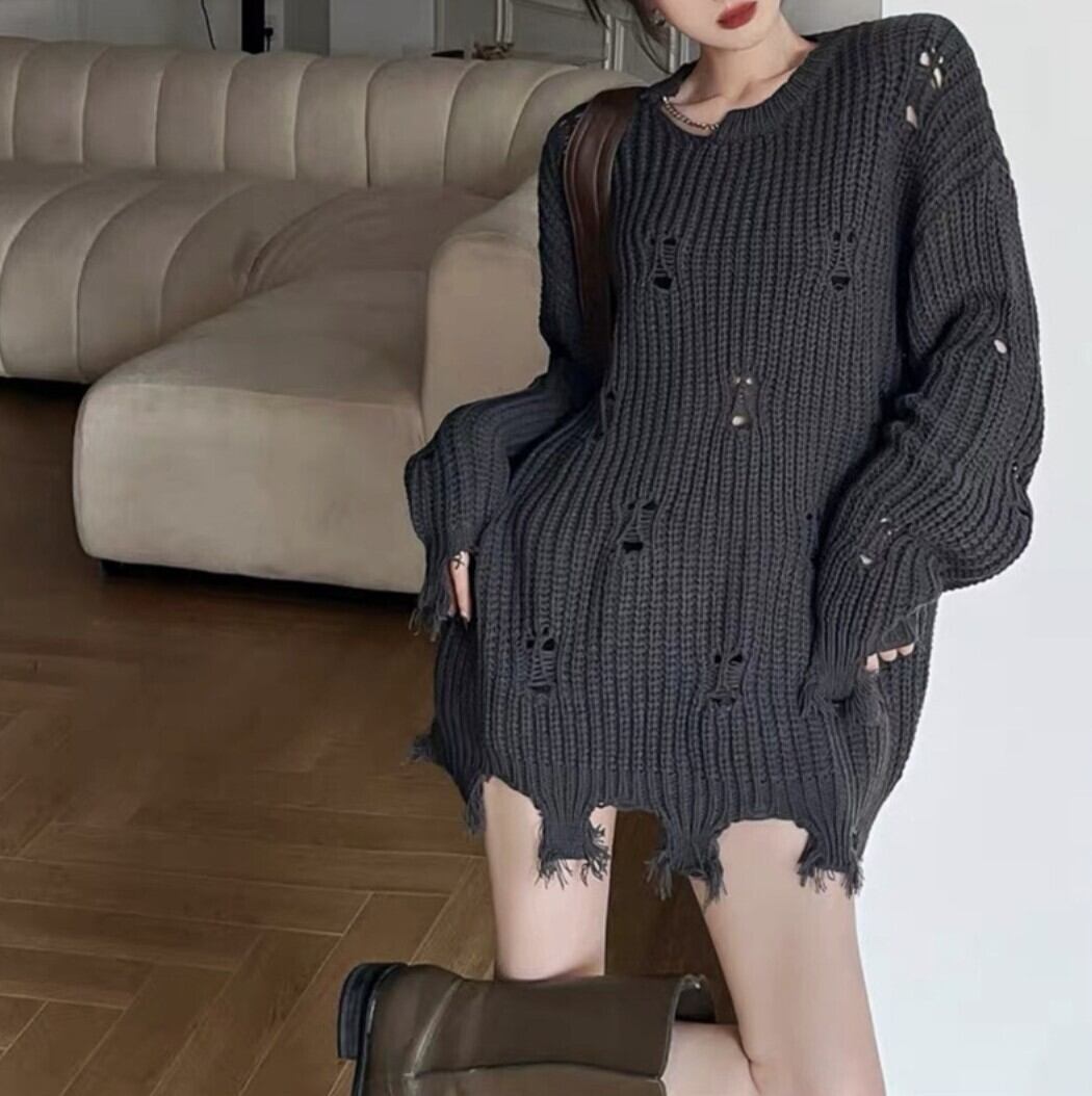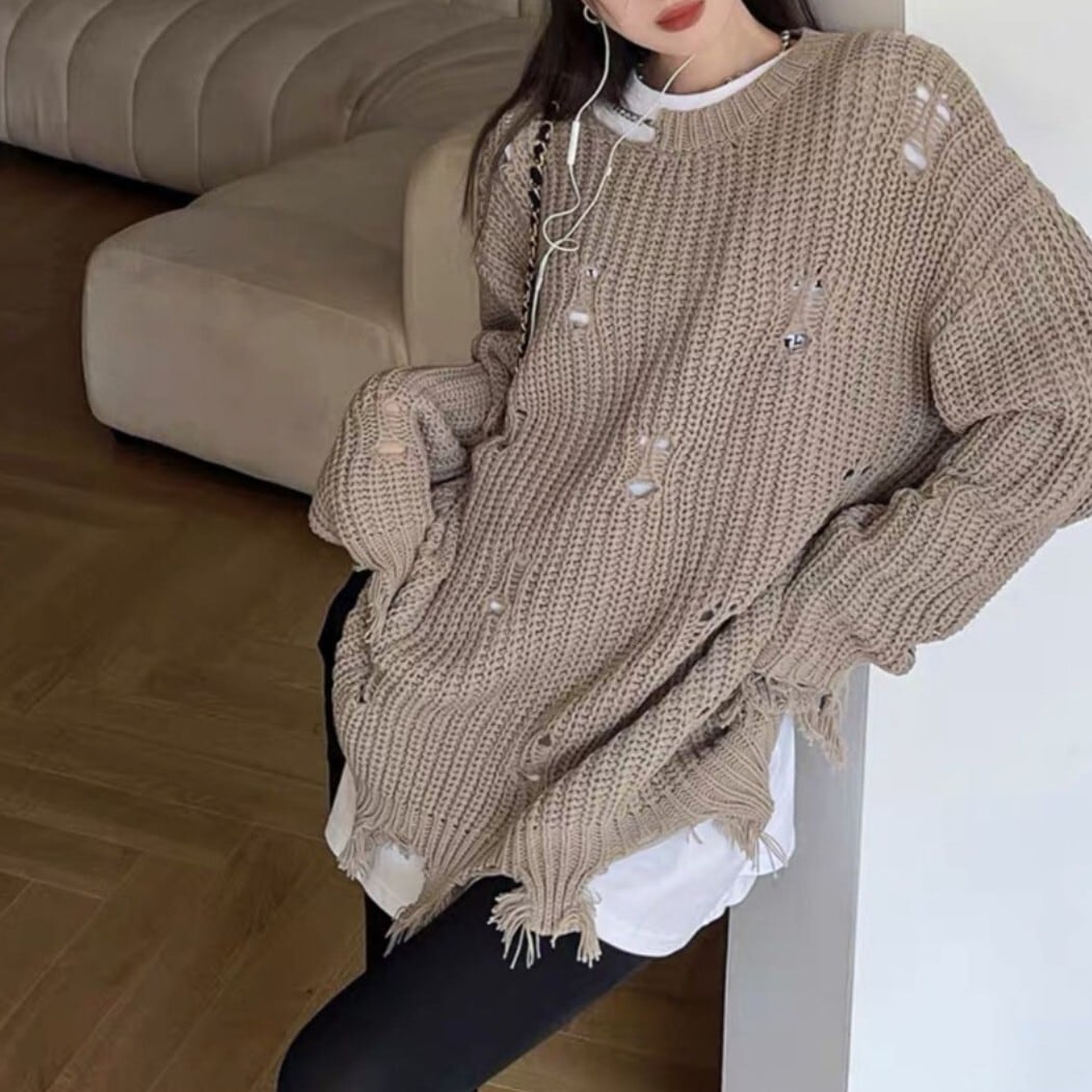 ざっくりとした編地とダメージ加工が印象的なオーバーサイズニット。