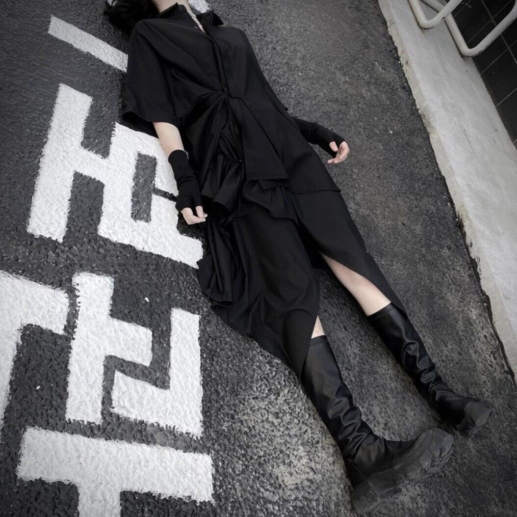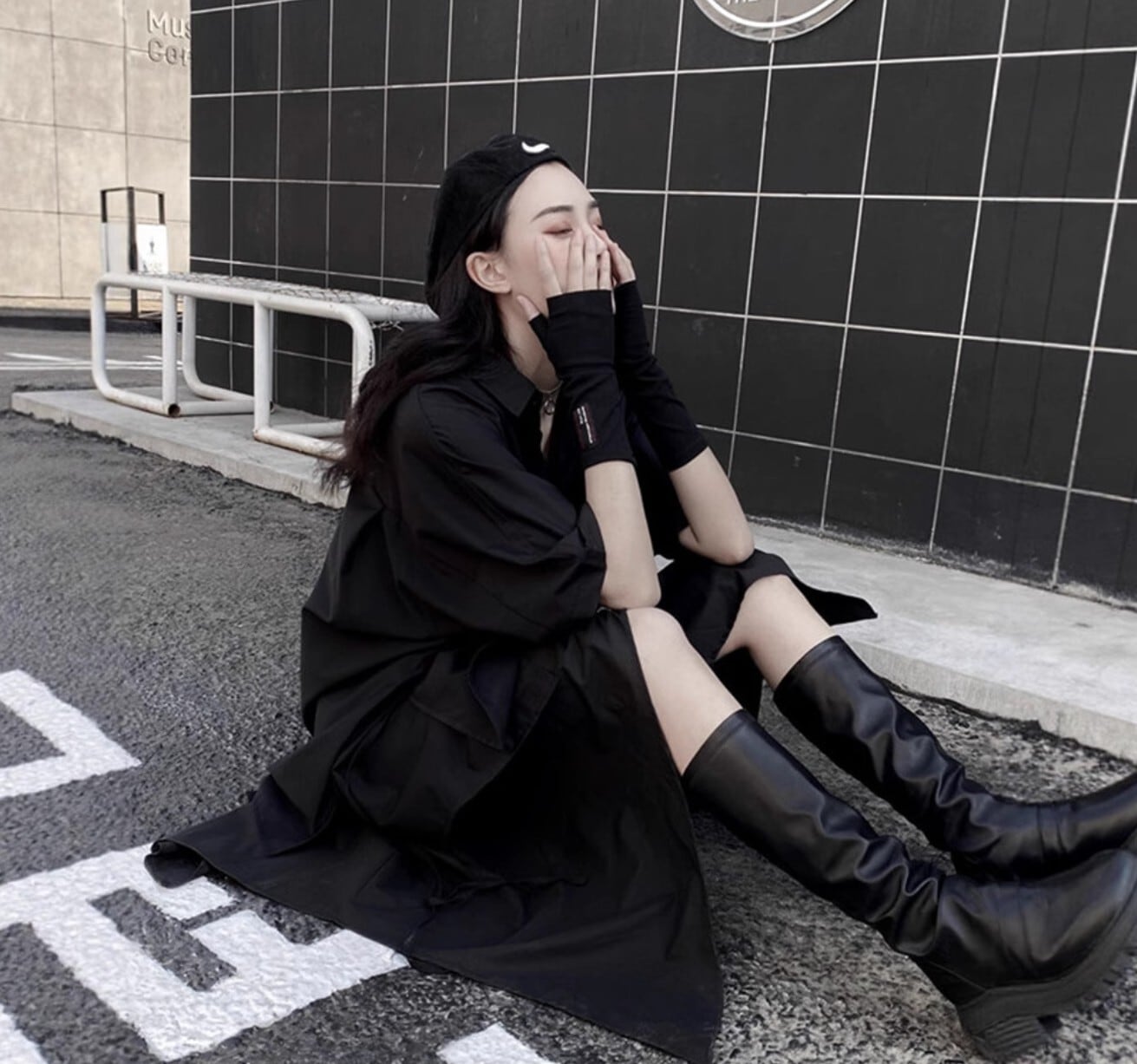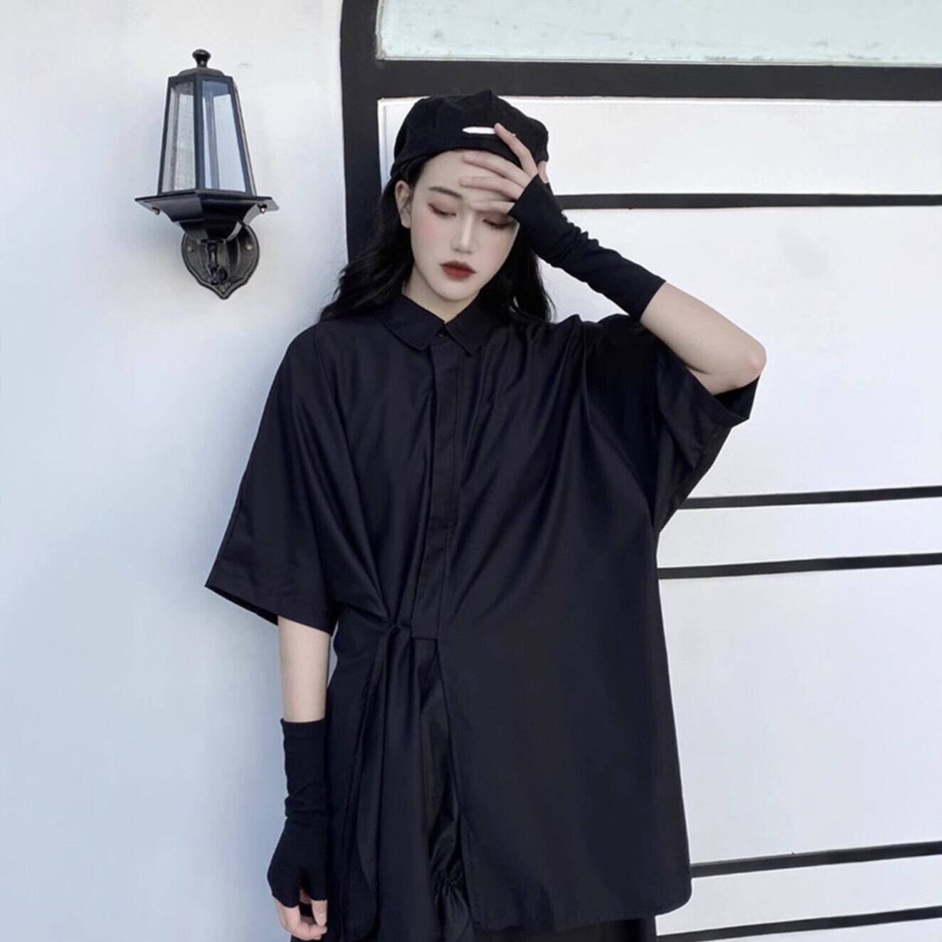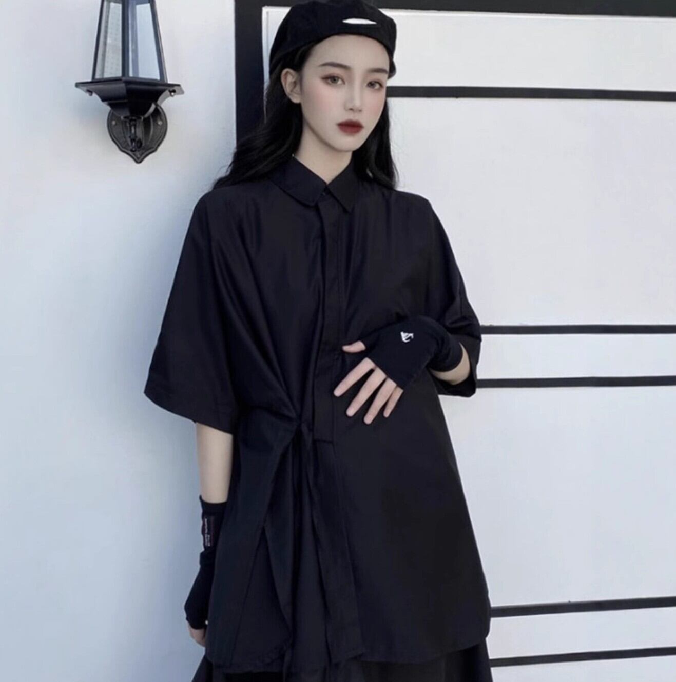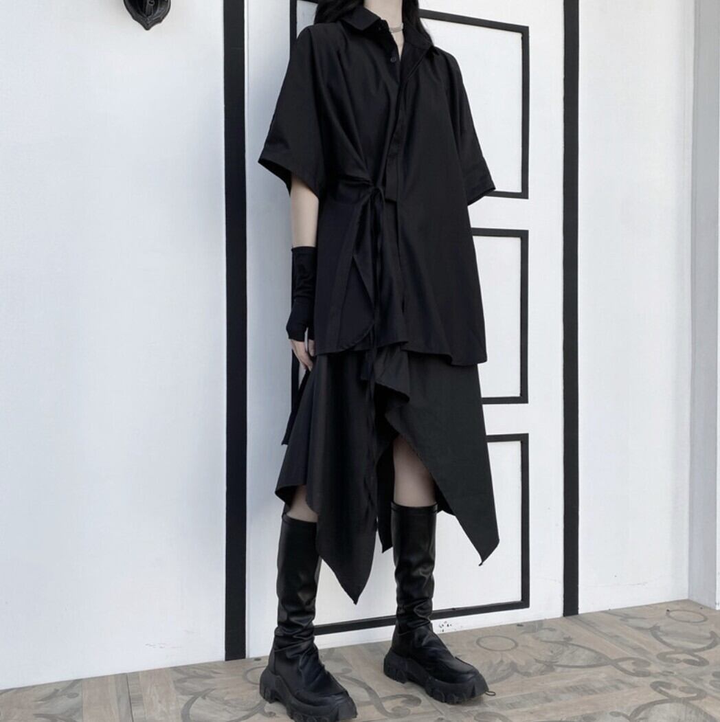 細身パンツにもワイドボトムにも合わせやすく、韓国モードやダーク寄りのコーデに取り入れやすいシャツです。
