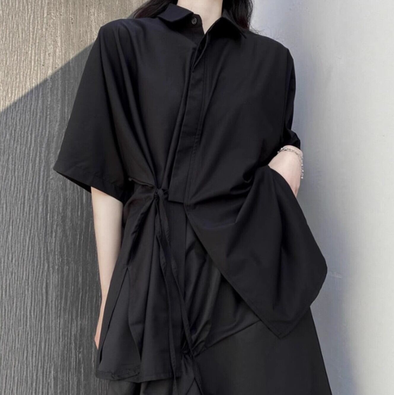 ウエストの結びディテールがアクセントになった、アシンメトリーデザインの半袖シャツ。