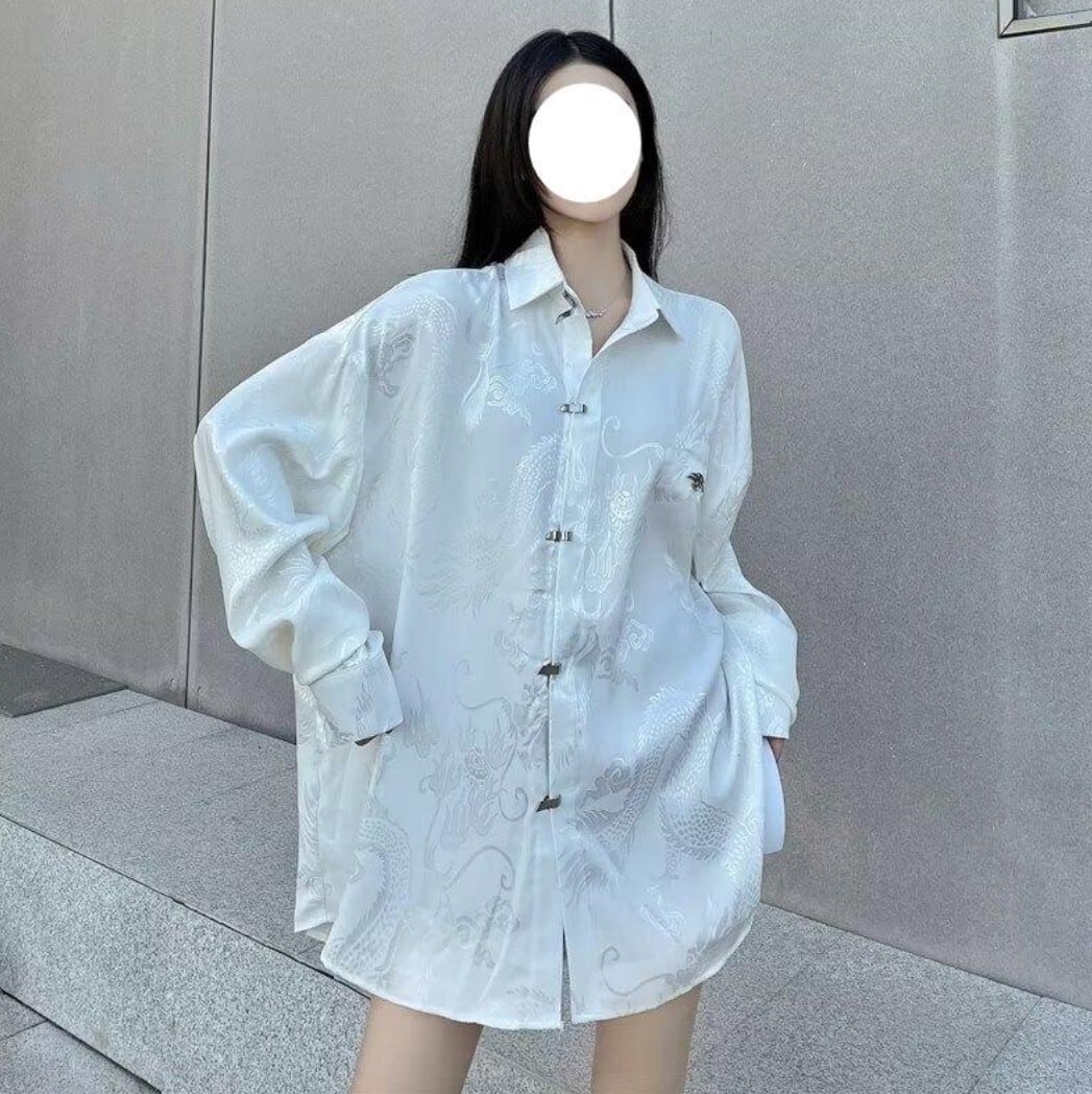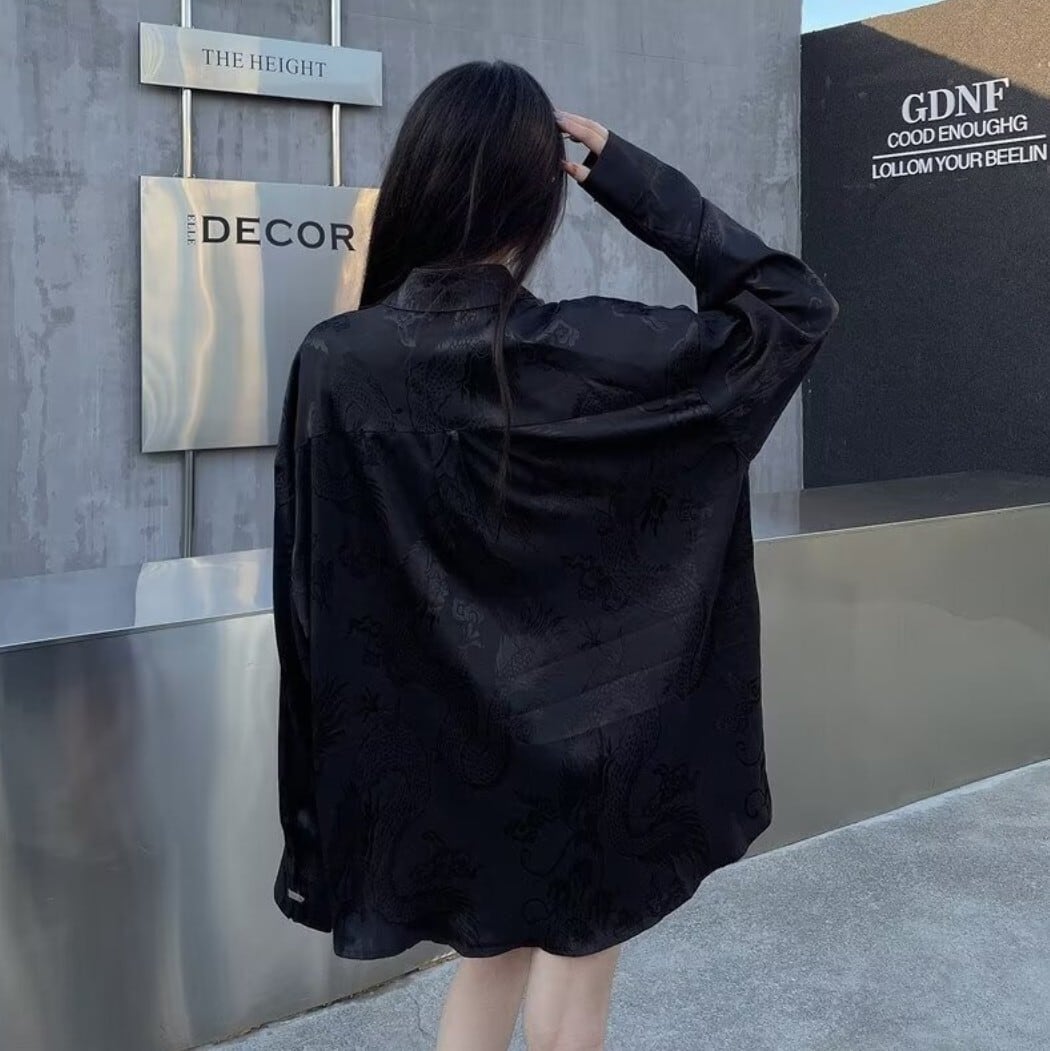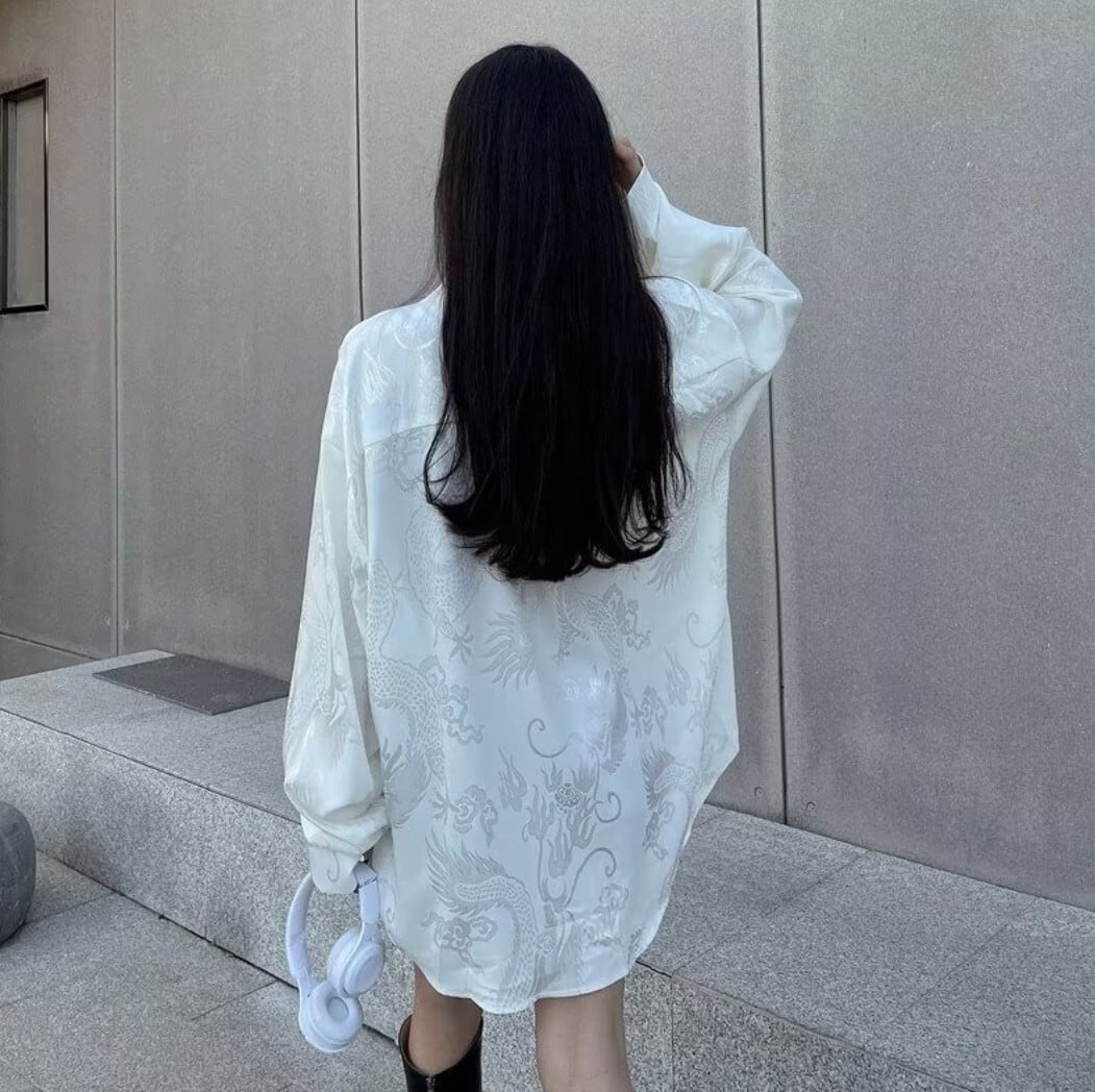 ドラゴン柄を織り込んだジャカード生地が印象的な、オーバーサイズの長袖シャツ。