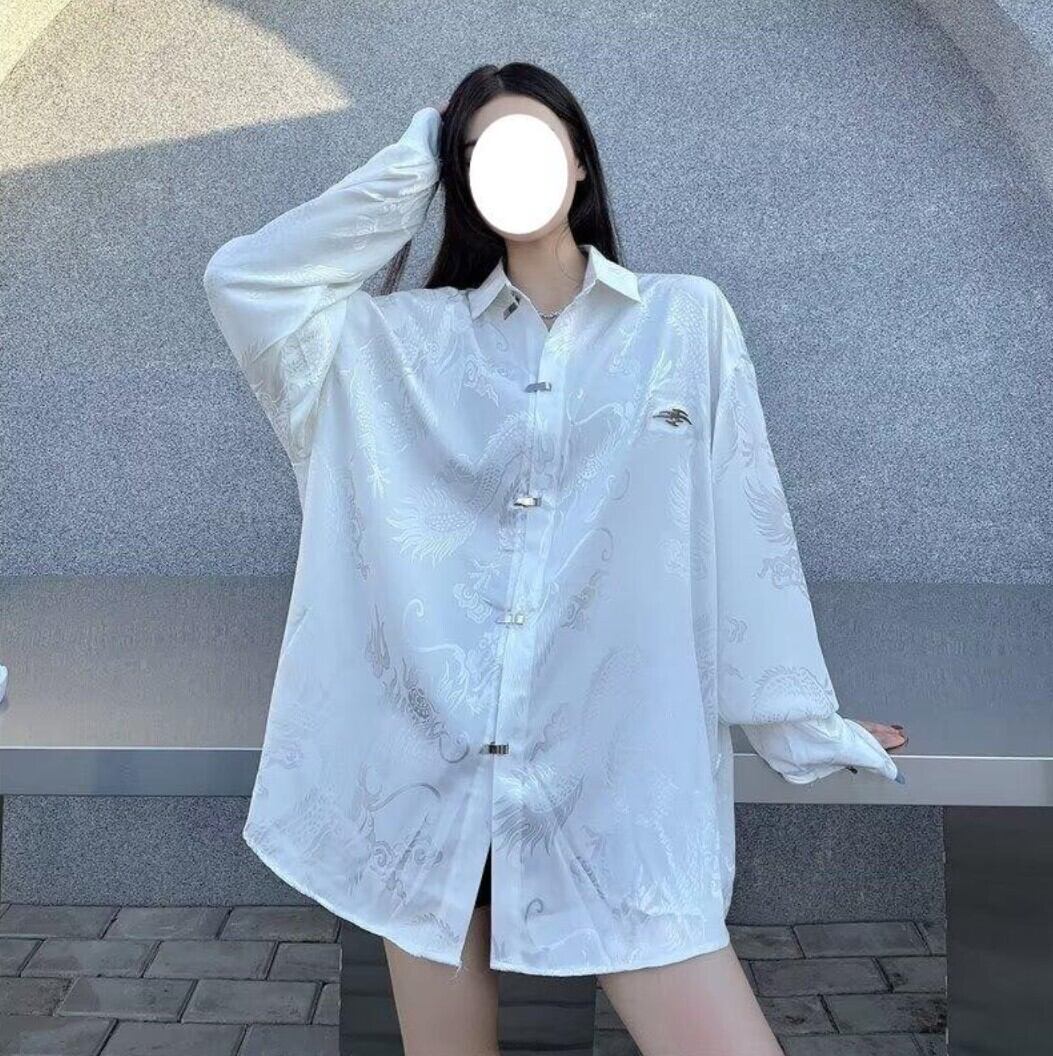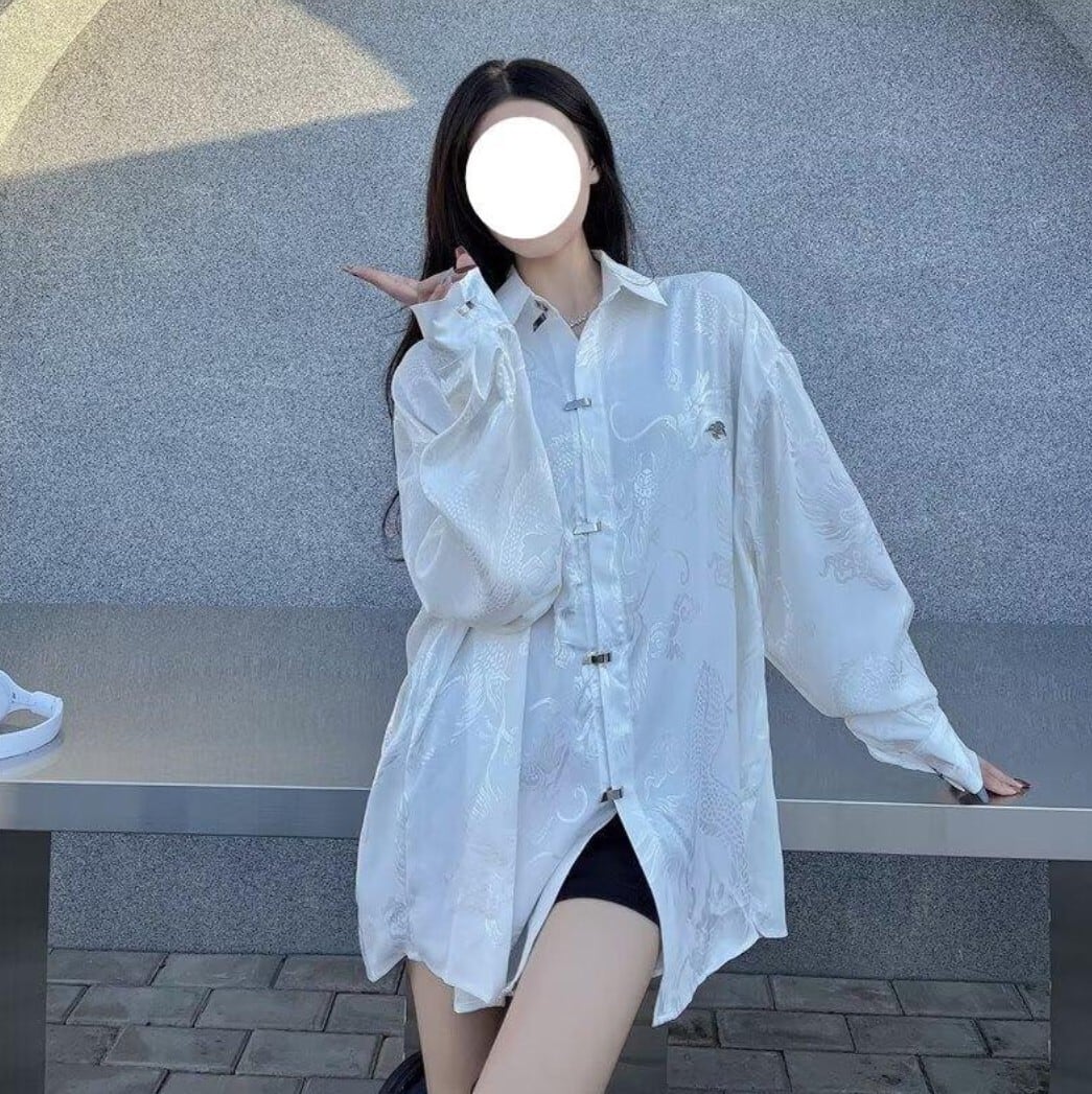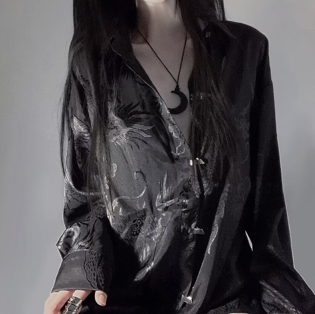ドラゴン柄を織り込んだジャカード生地が印象的な、オーバーサイズの長袖シャツ。