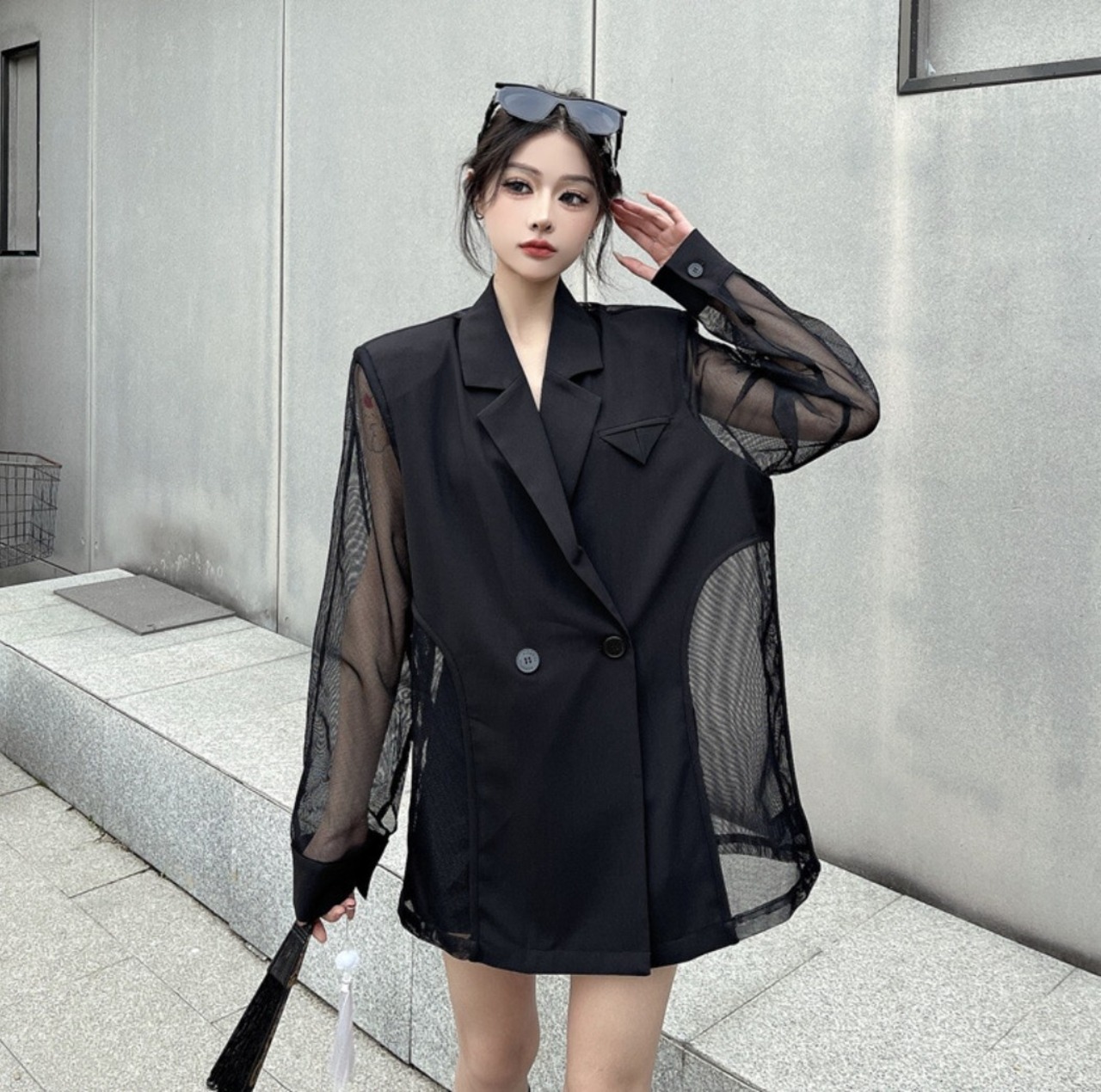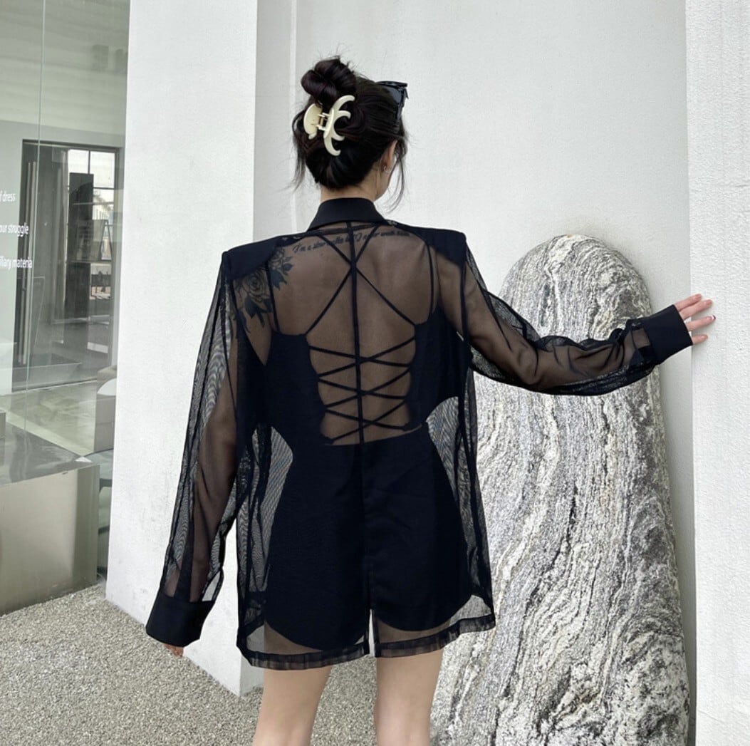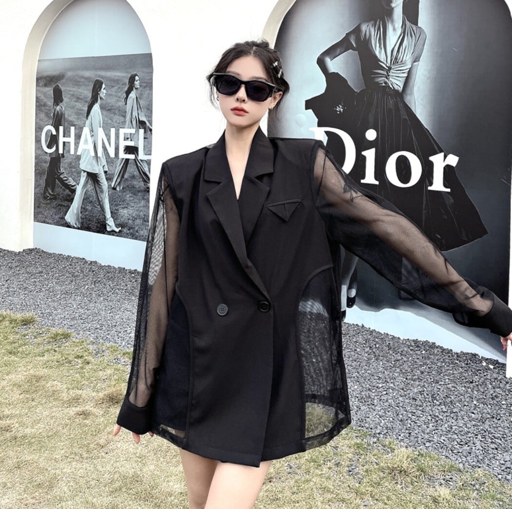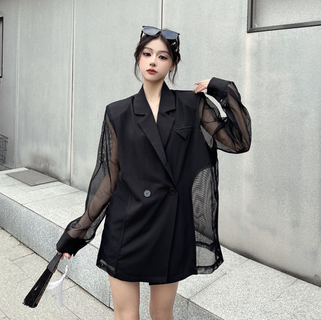 テーラードジャケットをベースに、袖と背面をシアー素材で切り替えたブラックジャケット。